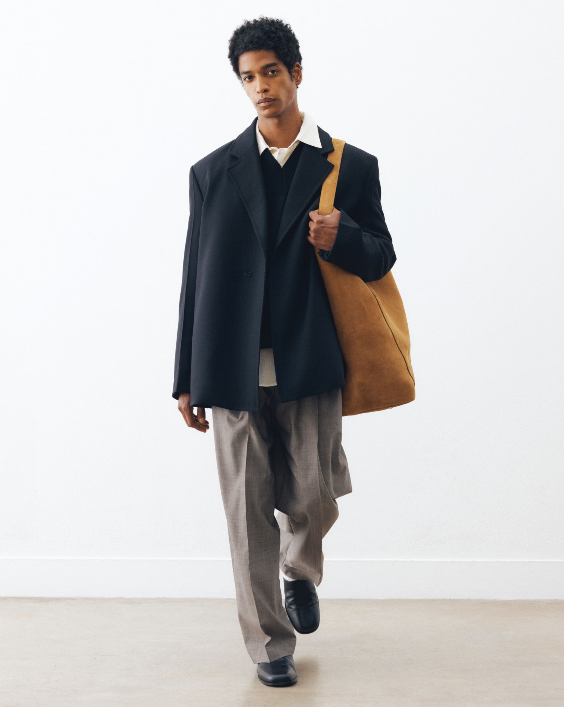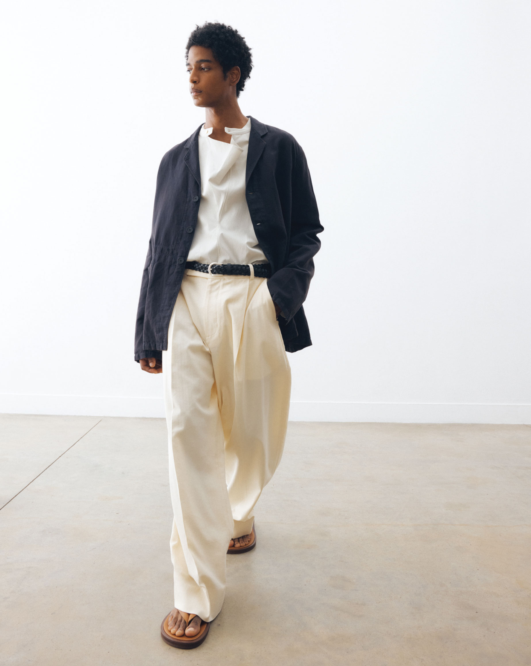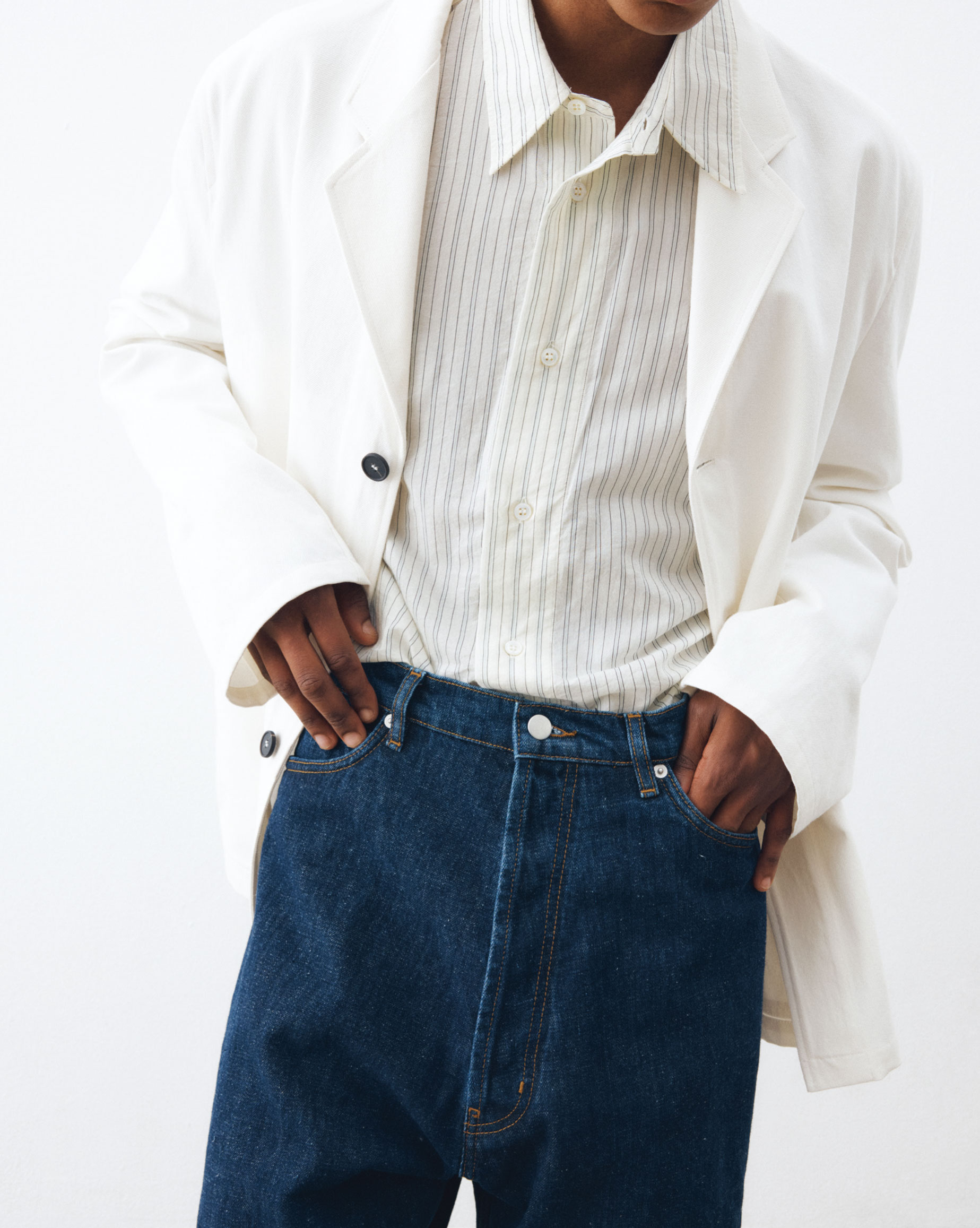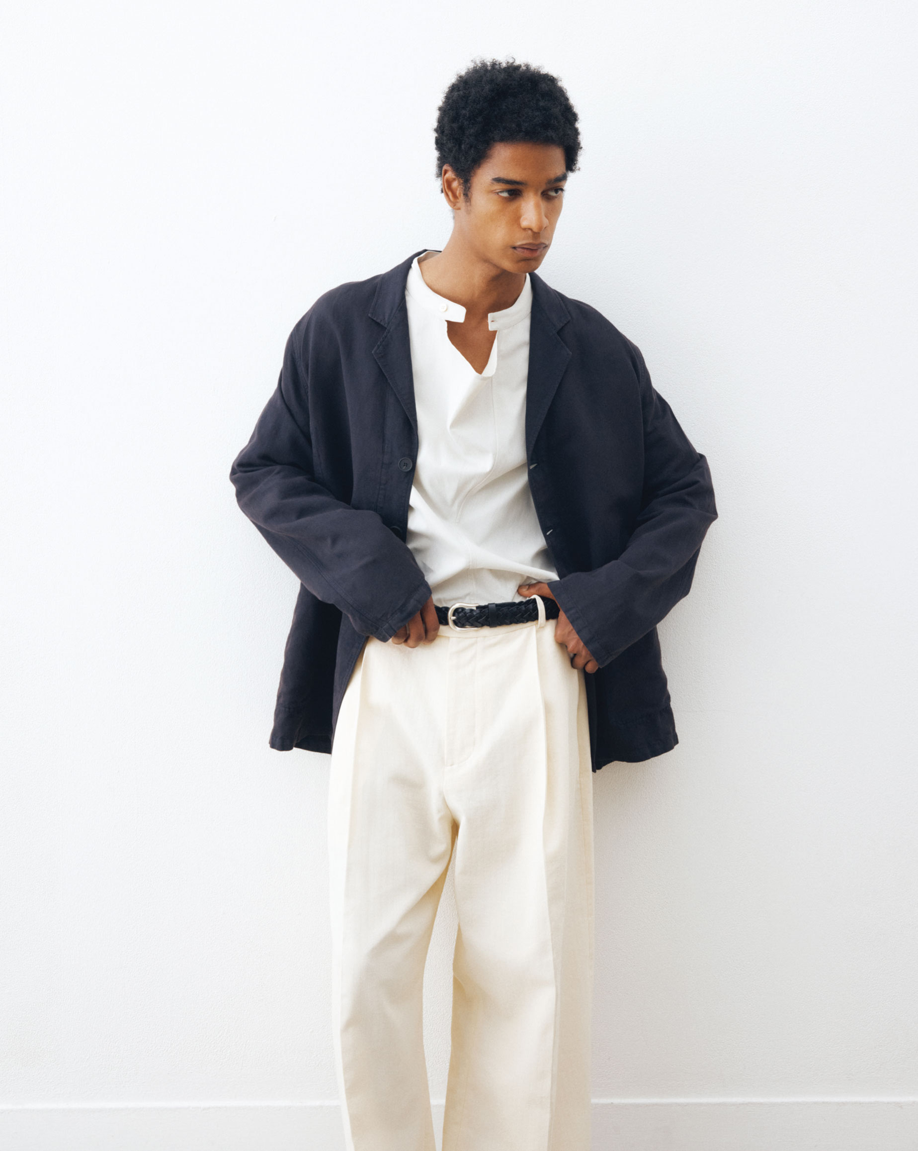 ボーイッシュだけにとどまらぬようジャストフィットサイズ、オーバーサイズどちらにでも、女性本来の体型をベースにだらしなくならないように構築し直されている。ネックラインのバランス、アームホールは細やかにモダンなシルエットへデザインし直され、パンツもウエスト、ヒップともにシルエットをリ・メイドし決してスキニーになりすぎない微妙なゆとりを意識してデザイン。