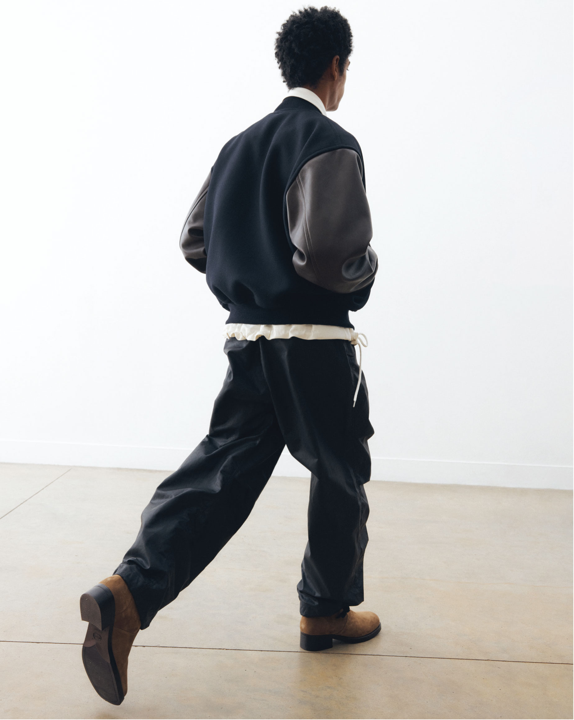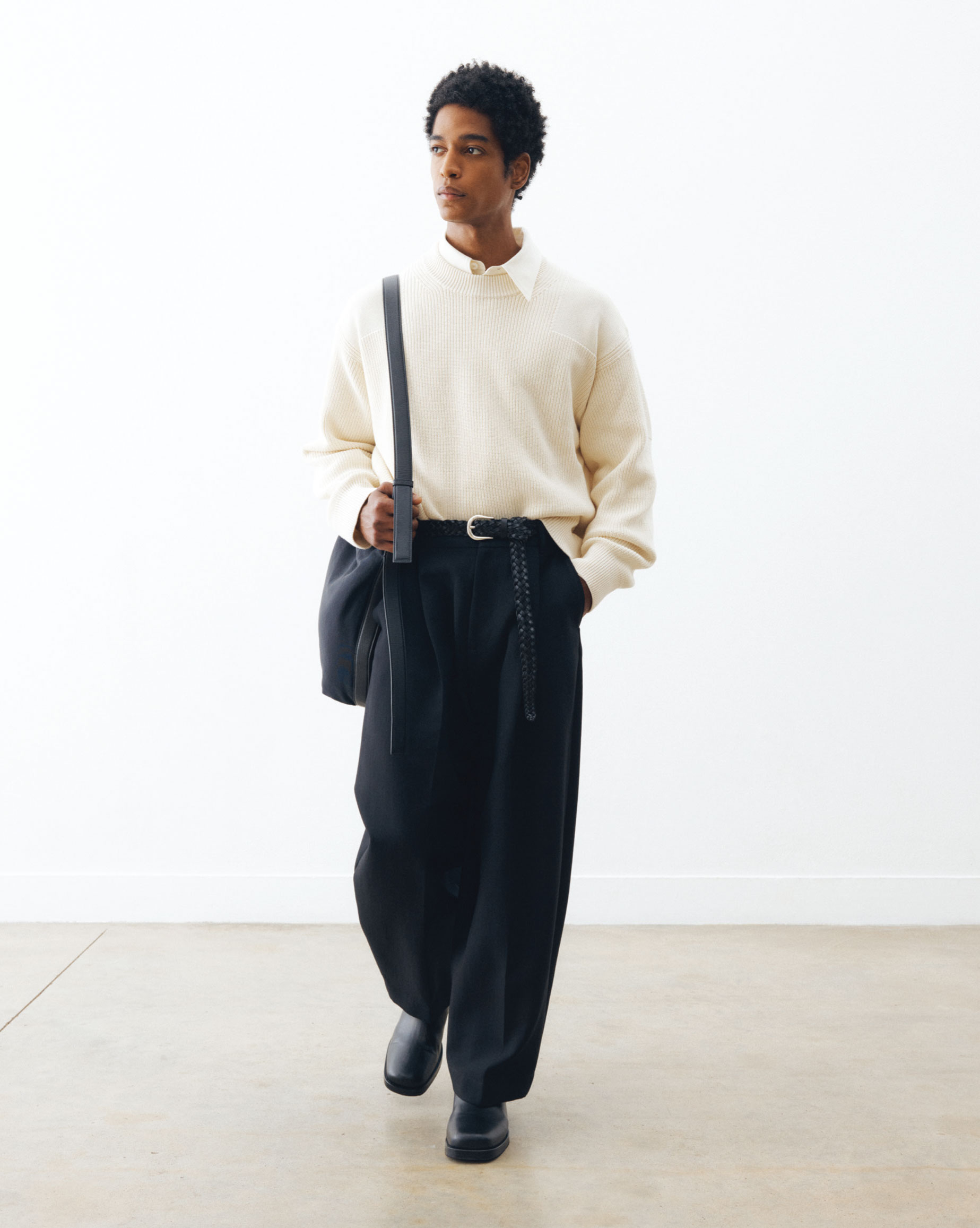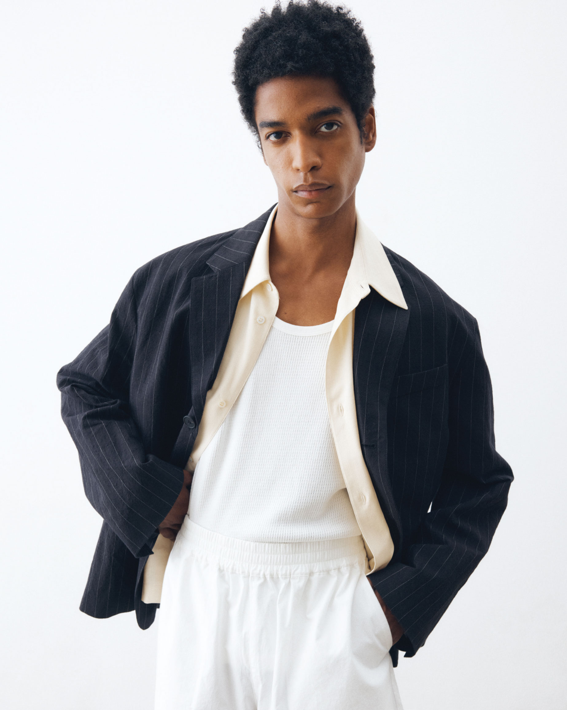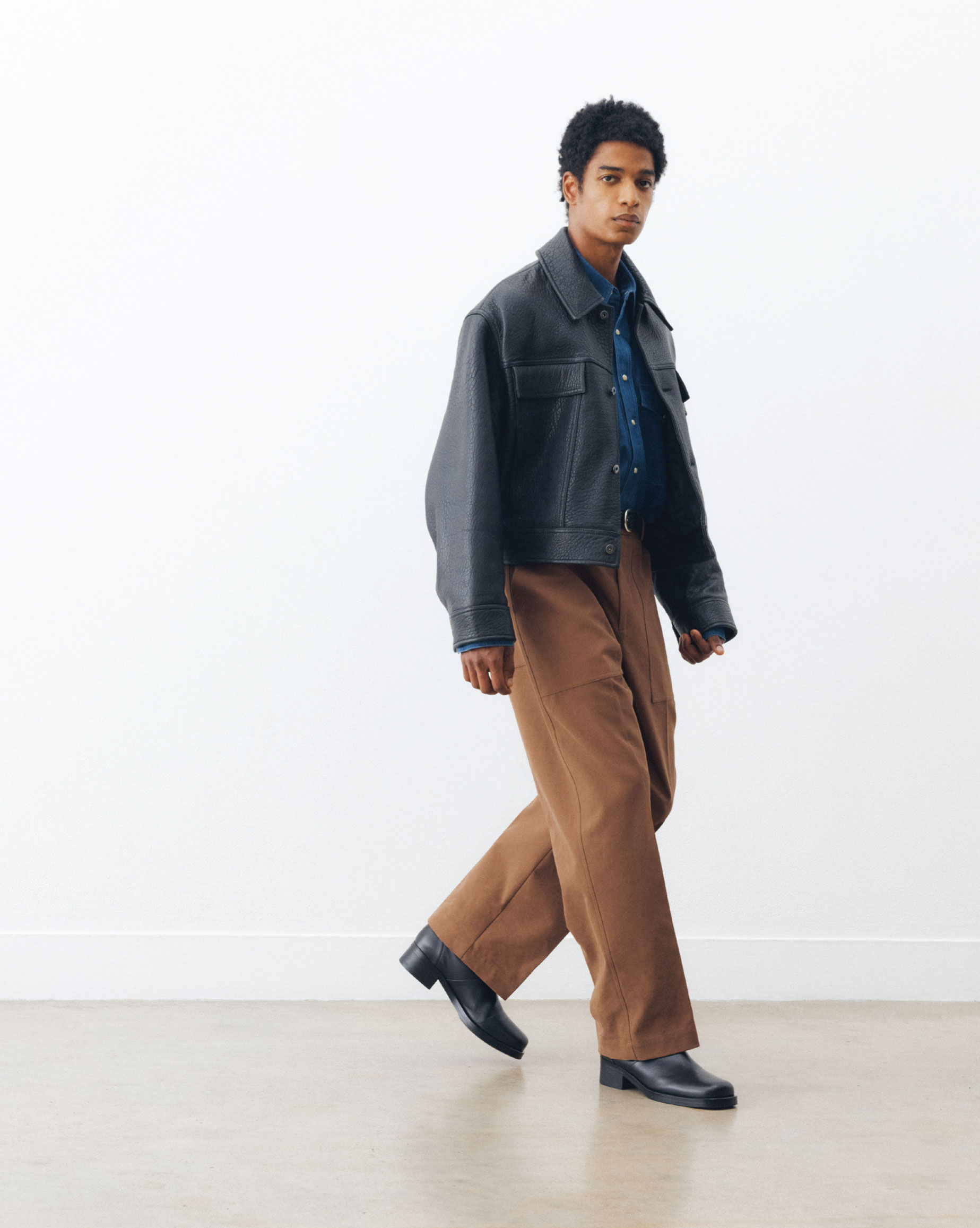 ボーイッシュだけにとどまらぬようジャストフィットサイズ、オーバーサイズどちらにでも、女性本来の体型をベースにだらしなくならないように構築し直されている。ネックラインのバランス、アームホールは細やかにモダンなシルエットへデザインし直され、パンツもウエスト、ヒップともにシルエットをリ・メイドし決してスキニーになりすぎない微妙なゆとりを意識してデザイン。