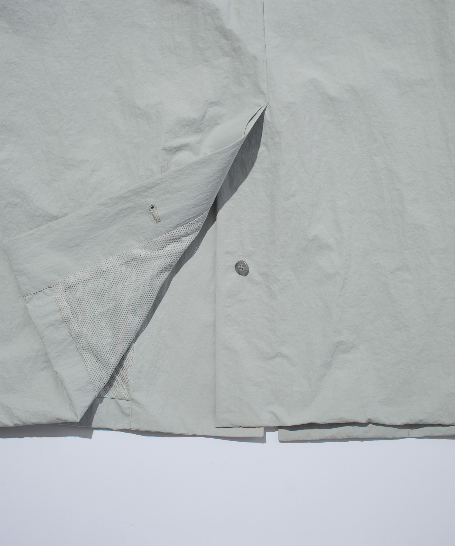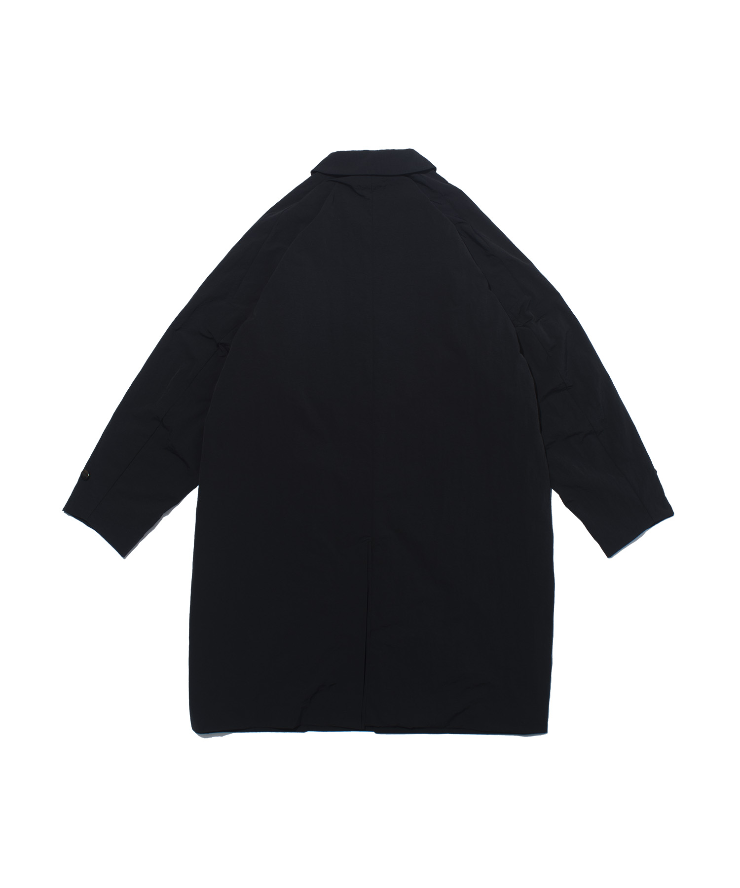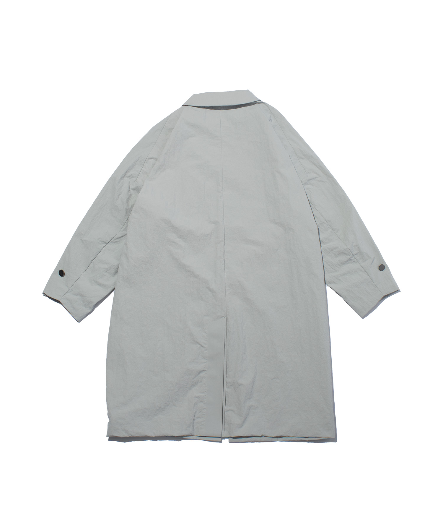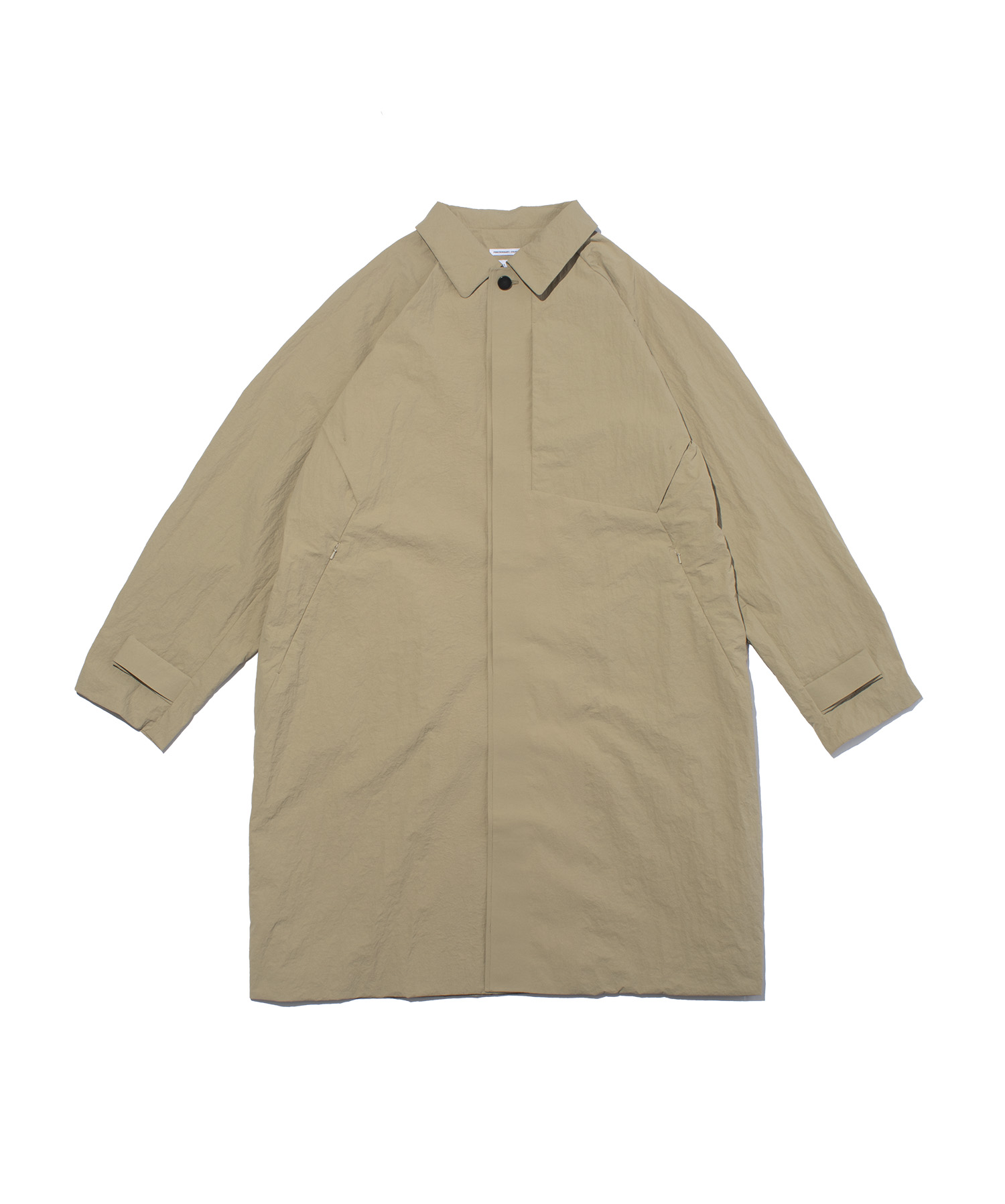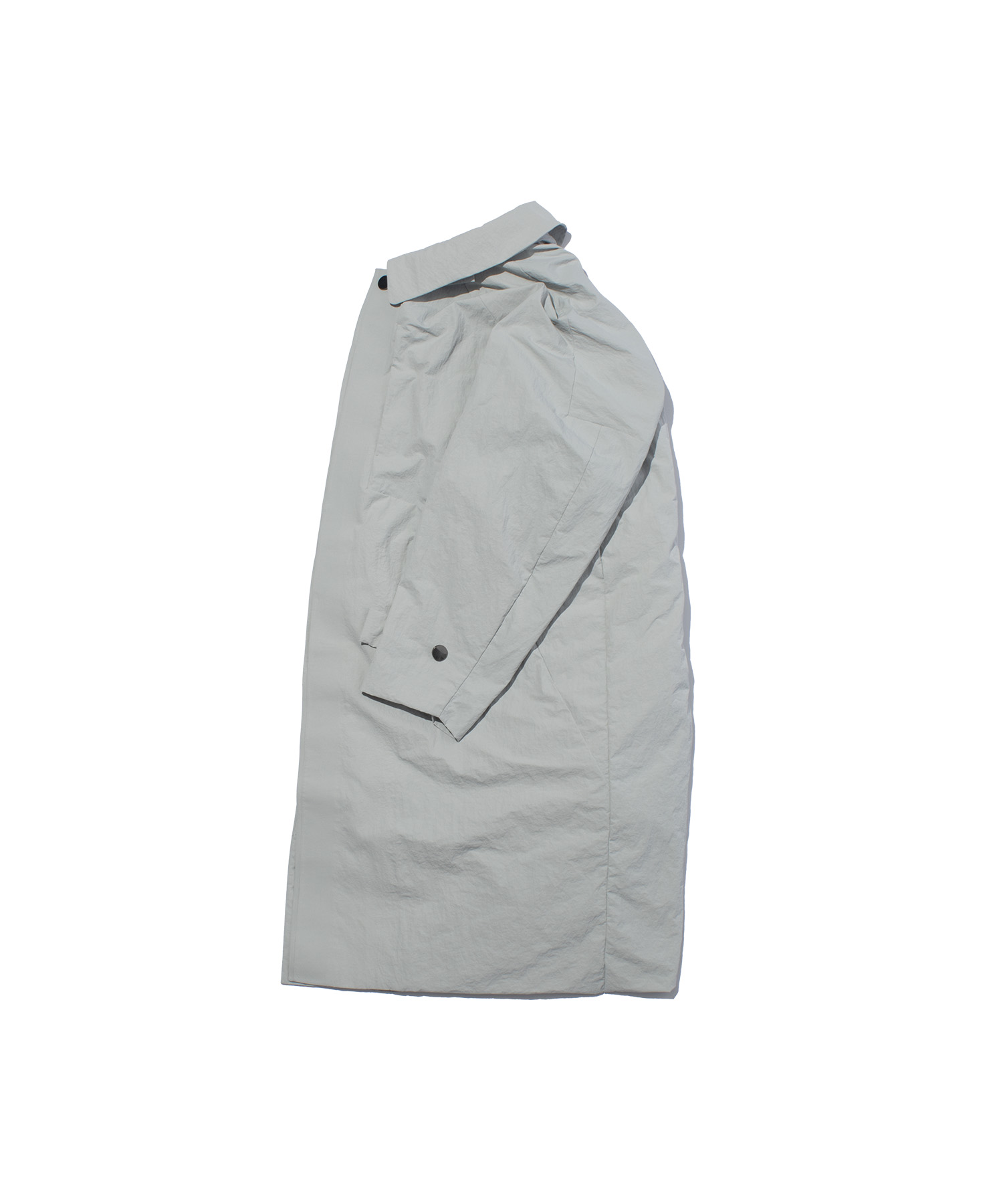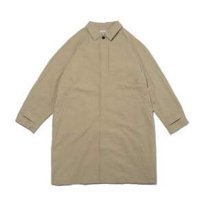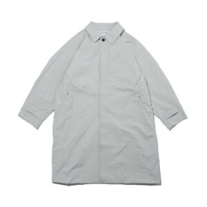 紙のような独特のハリと風合いを持つナイロン素材を使用した、ミニマルかつ機能性に優れたスタンドカラーロングコート。