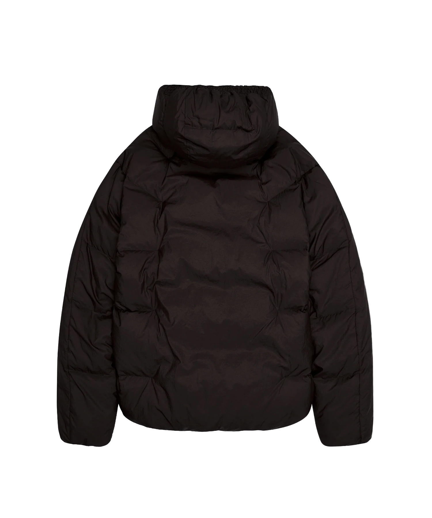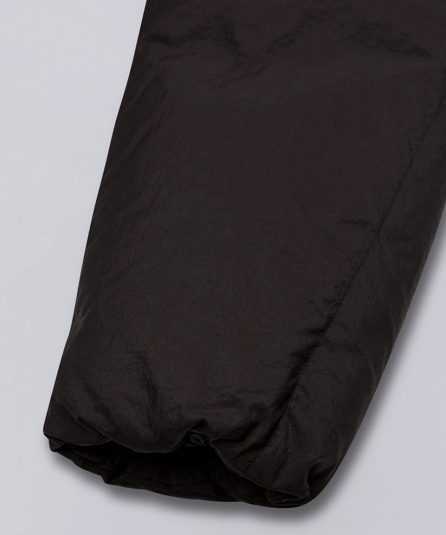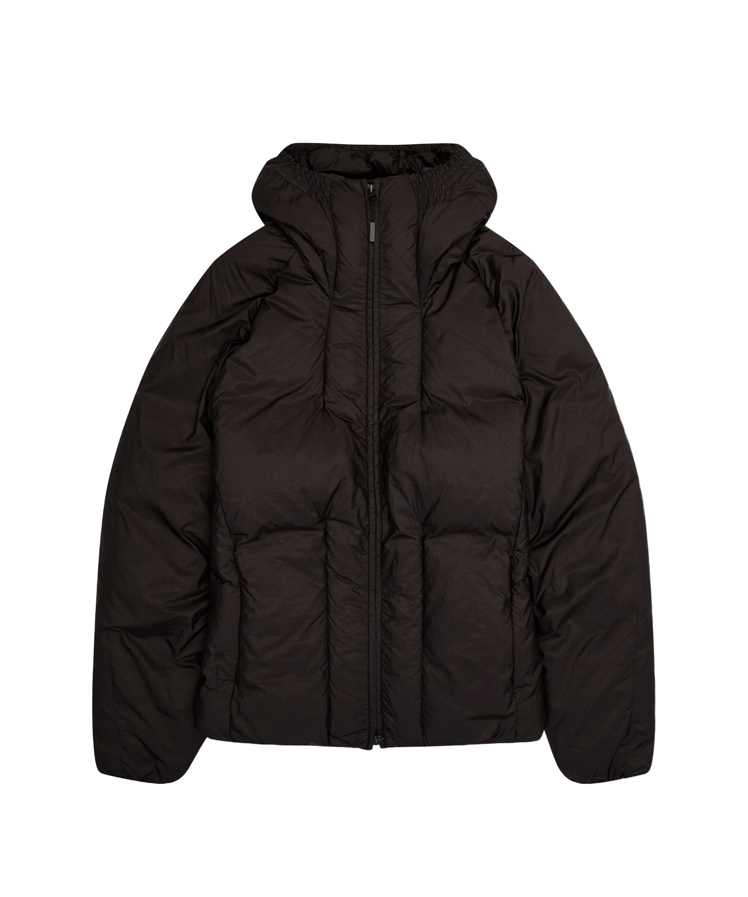 表面のステッチや生地の切り替えが途中で消えていく独創的なデザインのダウンジャケット。フード周りのシャーリングやミニマルな袖口など、テクニカルアパレルの様々なテクニックを自在に駆使しています。背中には、J.L-A.Lを象徴する極小のメタルパーツを取り付けました。
