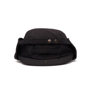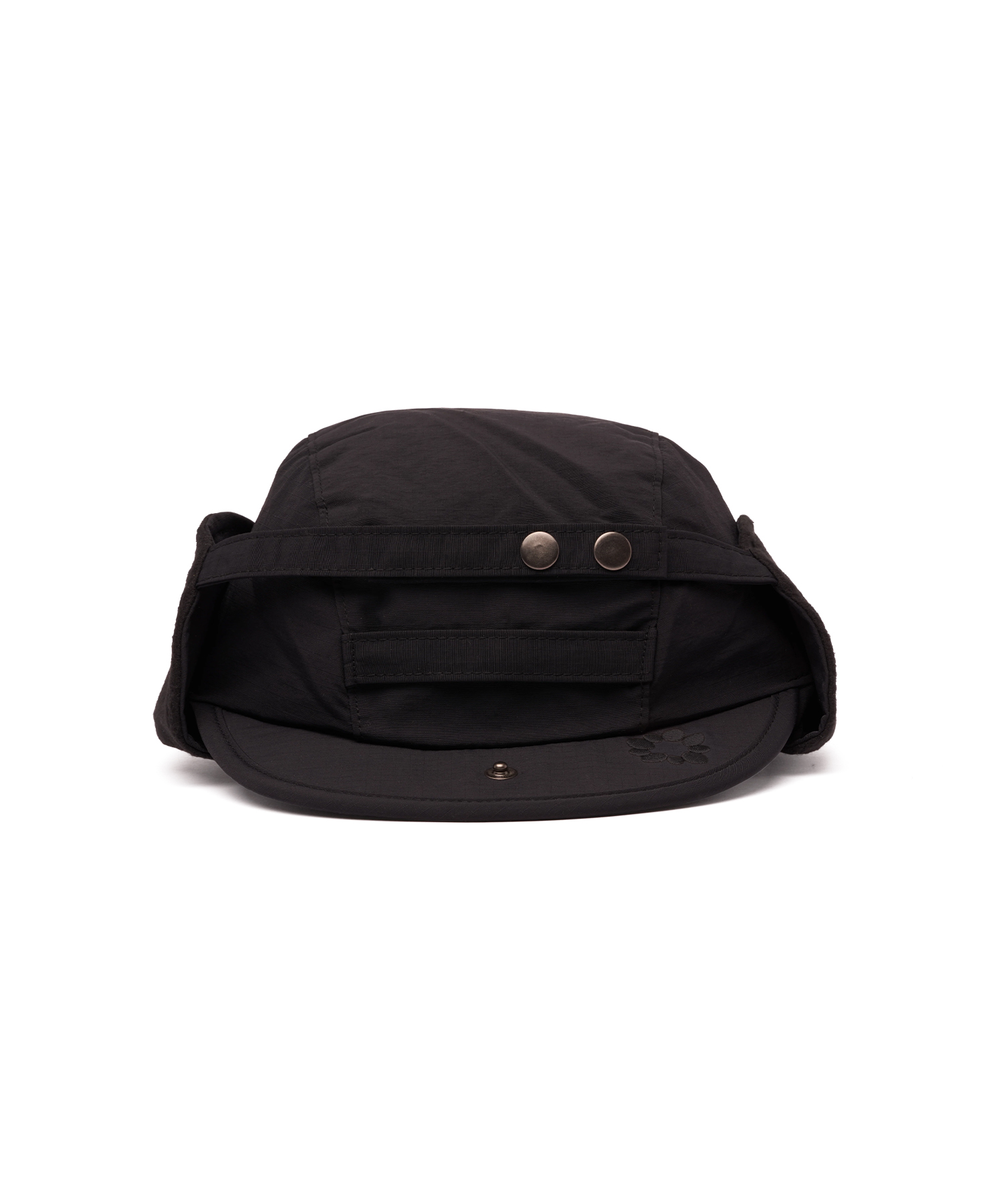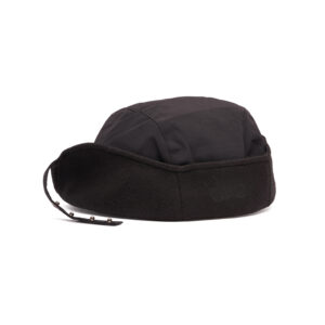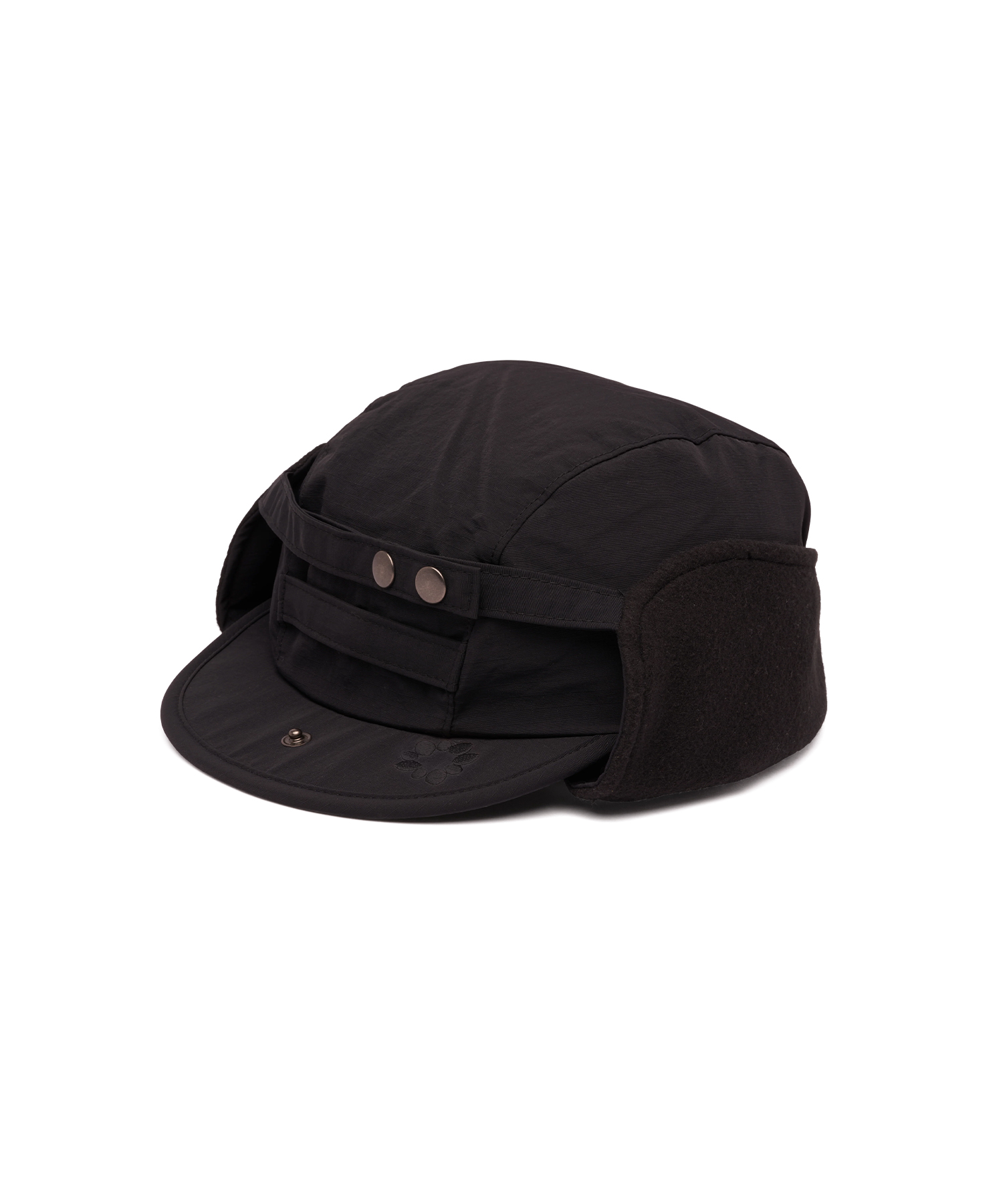 マウンテンハット。ナイロン製アウター。フリース裏地。ショートブリム。ボタン留め付きのイヤーフラップ。ブラックとブラウンの2色展開。