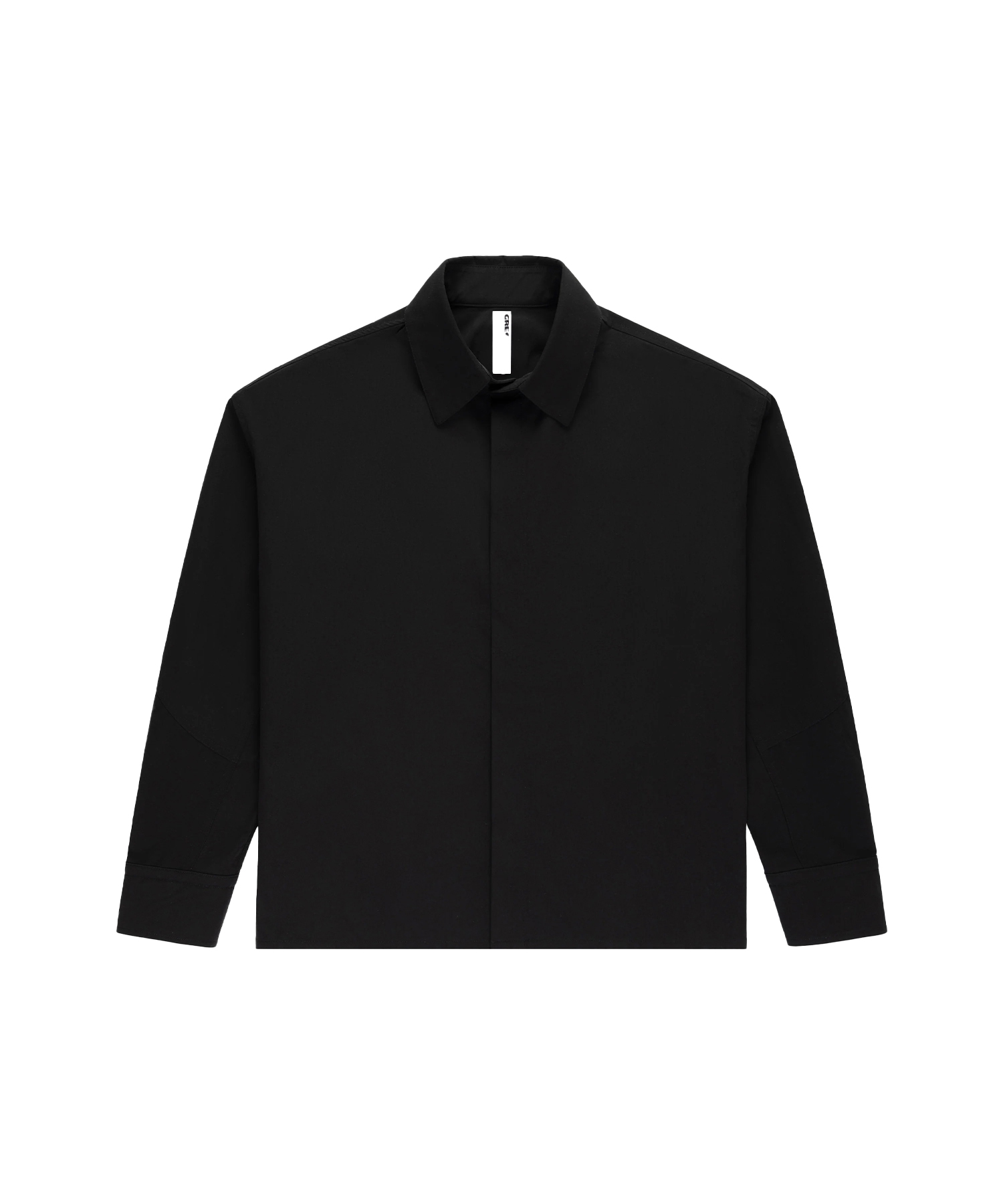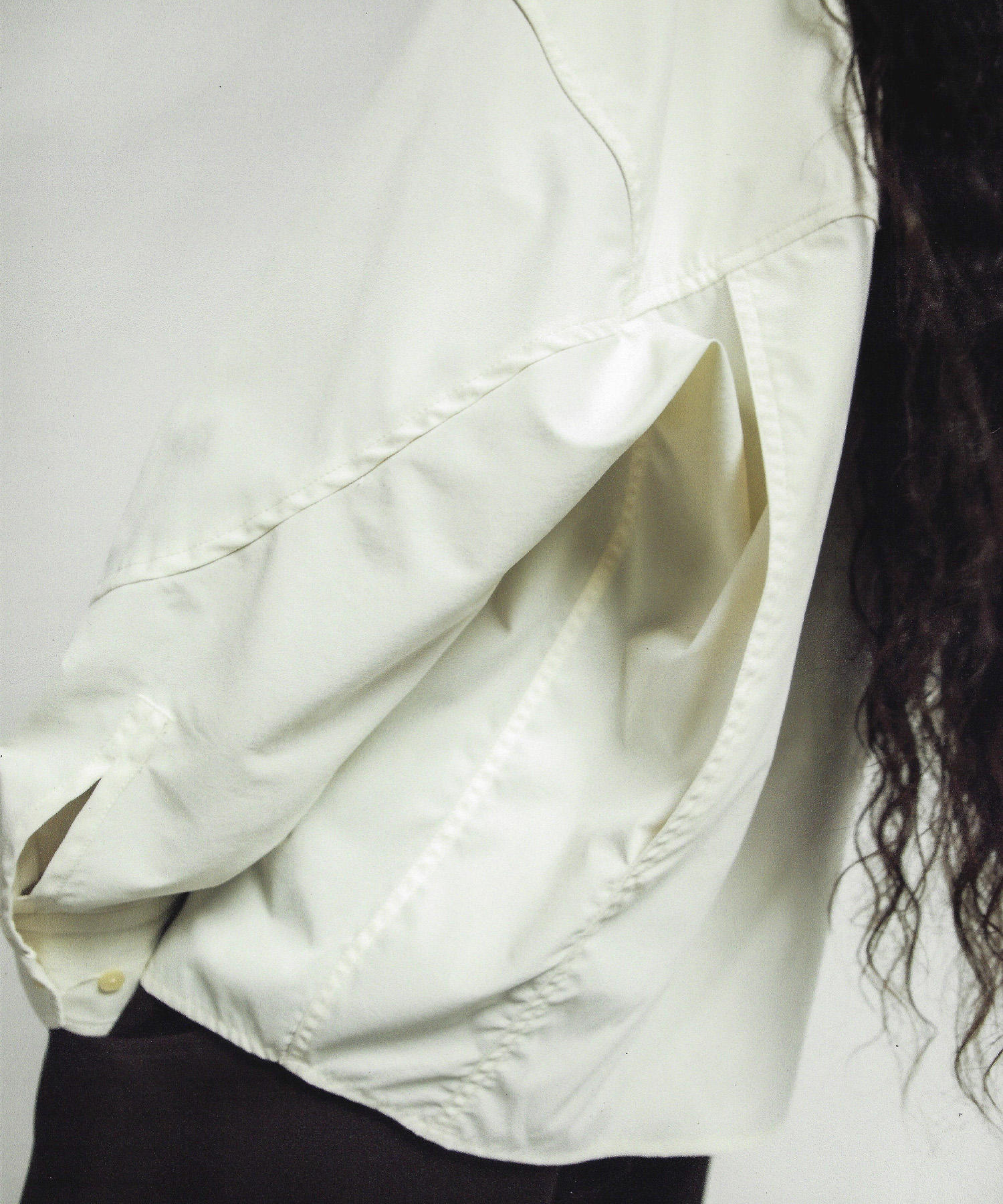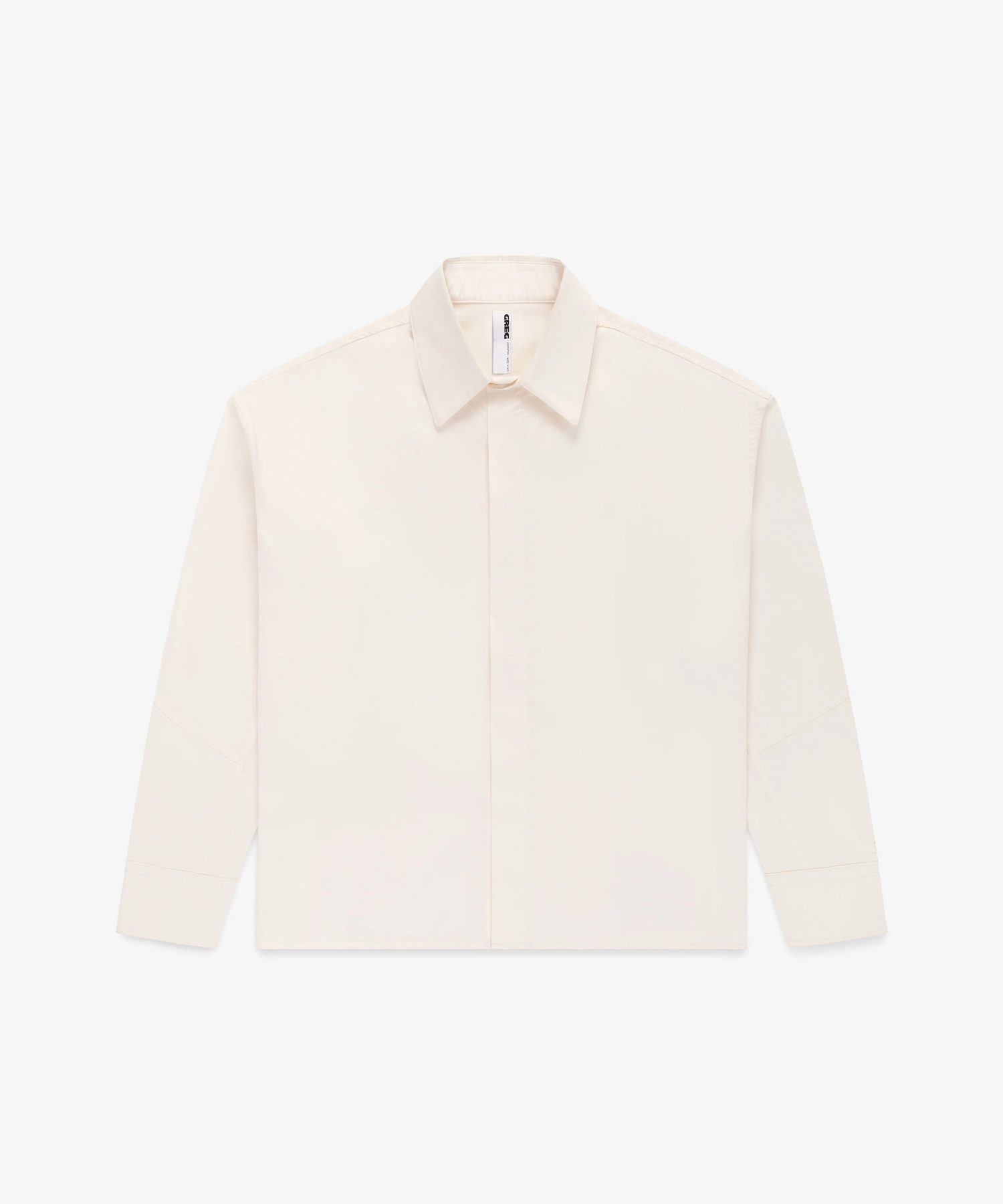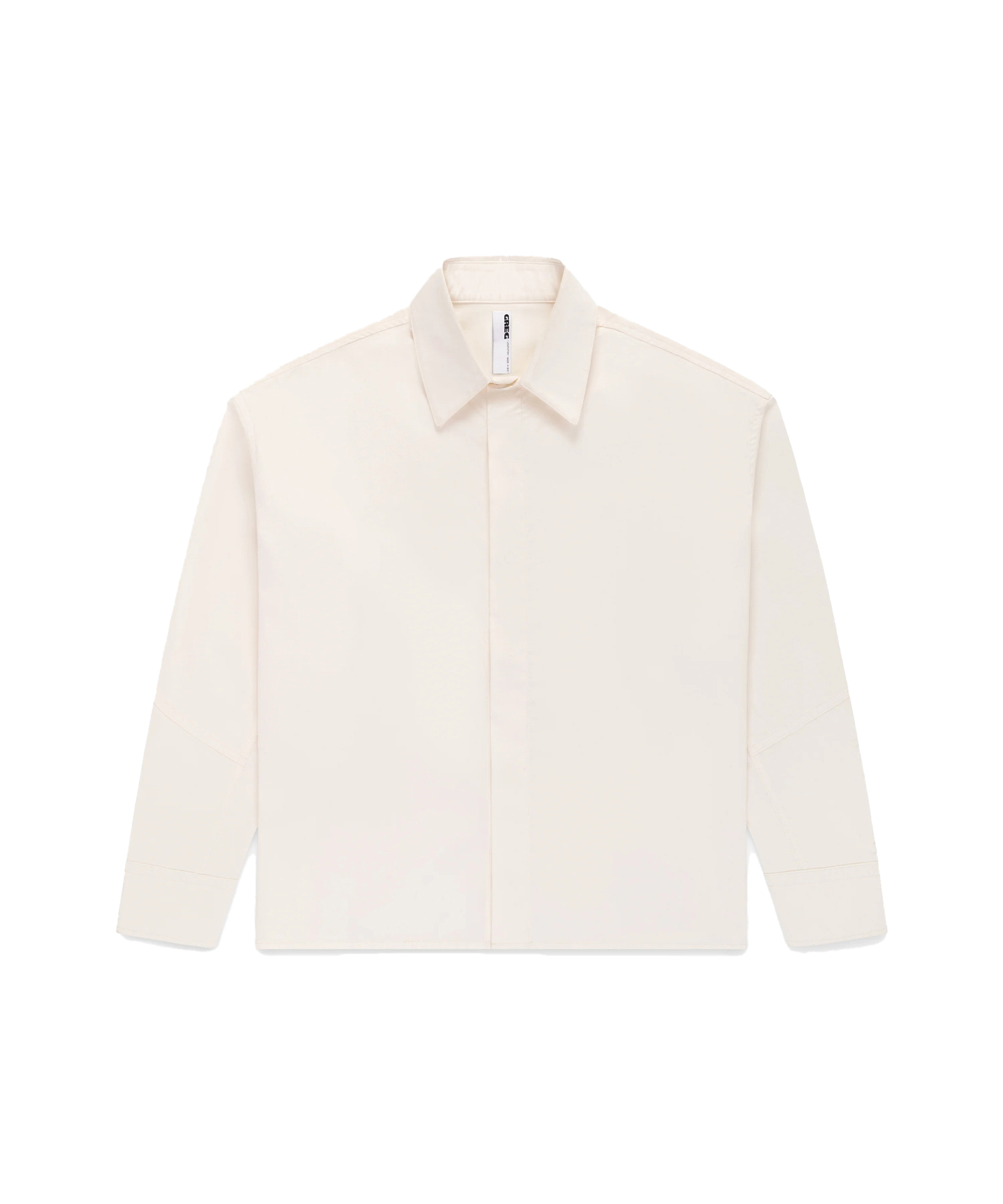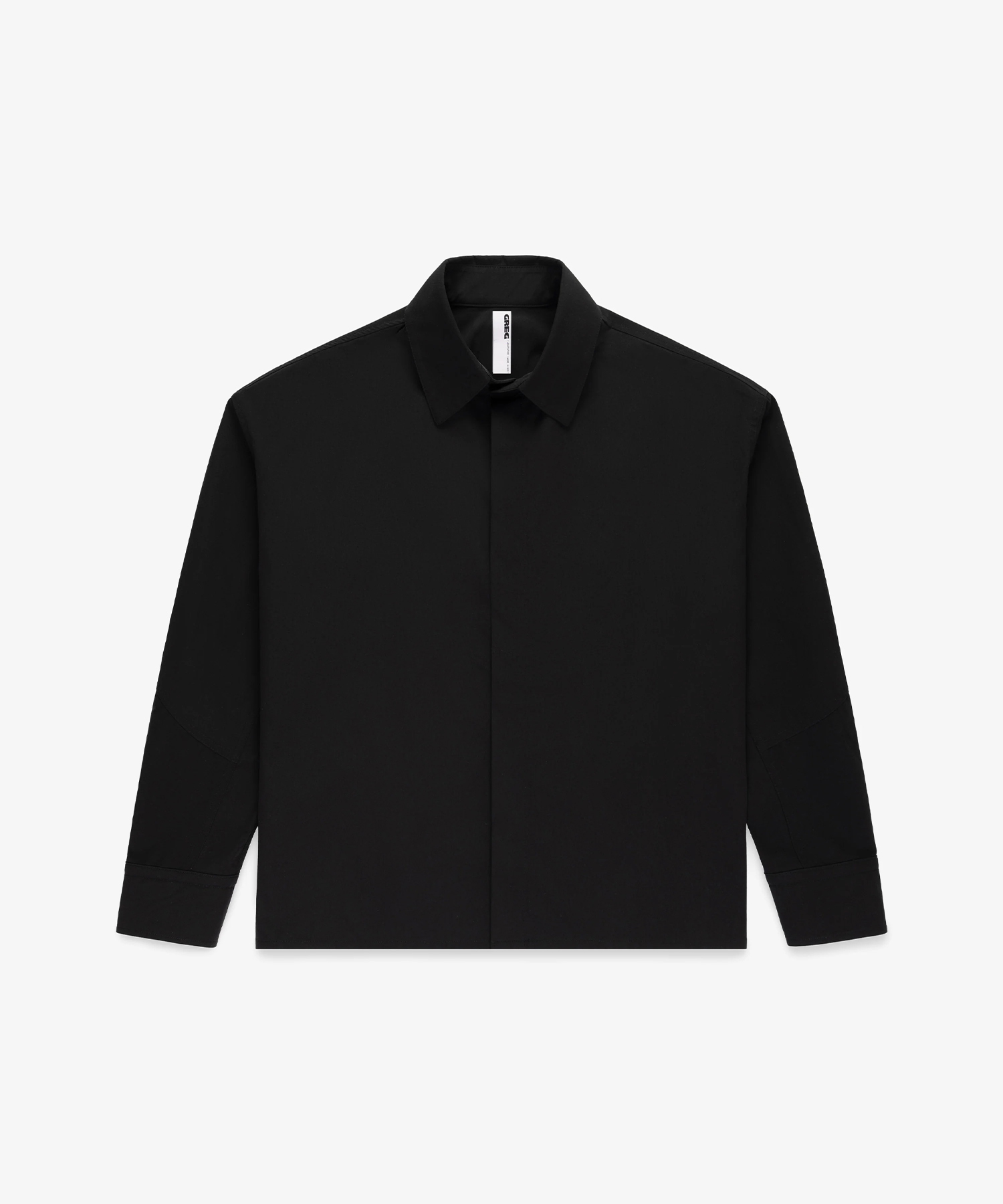 伸縮性ポリコンジュゲート繊維製ウェザークロスを使用したボックスシルエットのクロップドシャツ。撥水加工を施しています。ラバー加工ボタン、隠しプラケット、袖口のダーツ構造、特徴的なロッカーループディテールが特徴です。