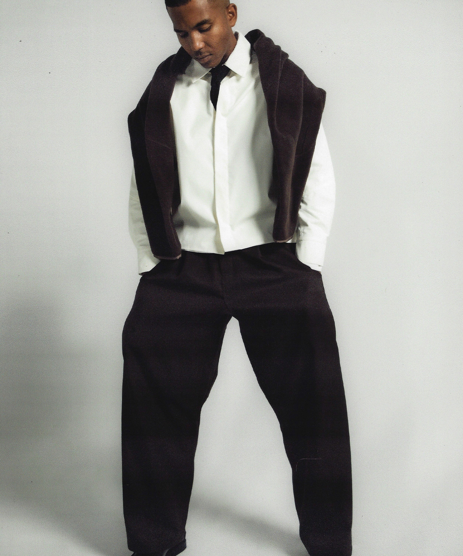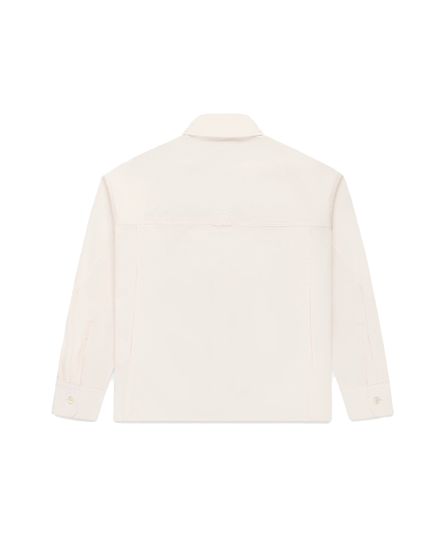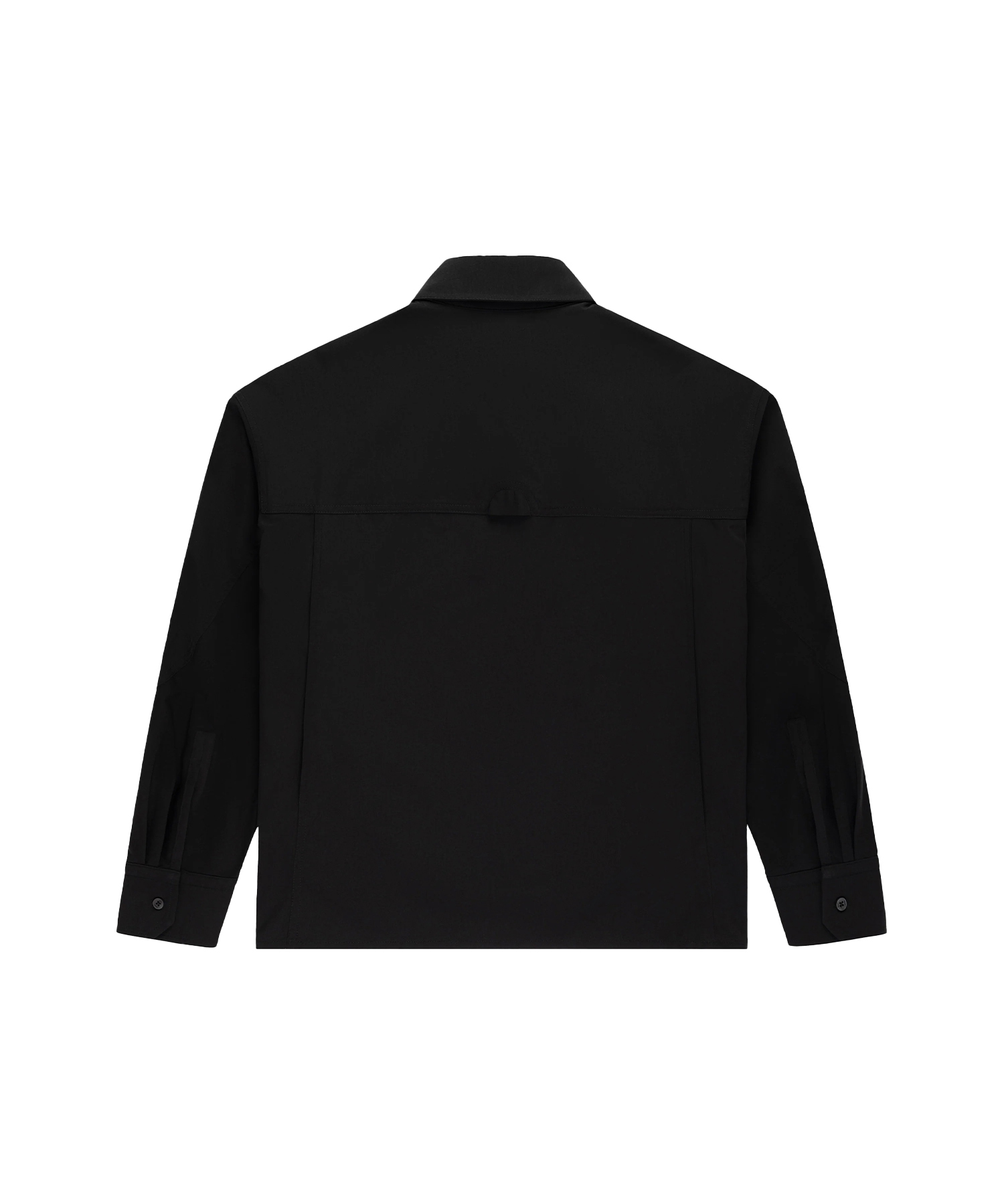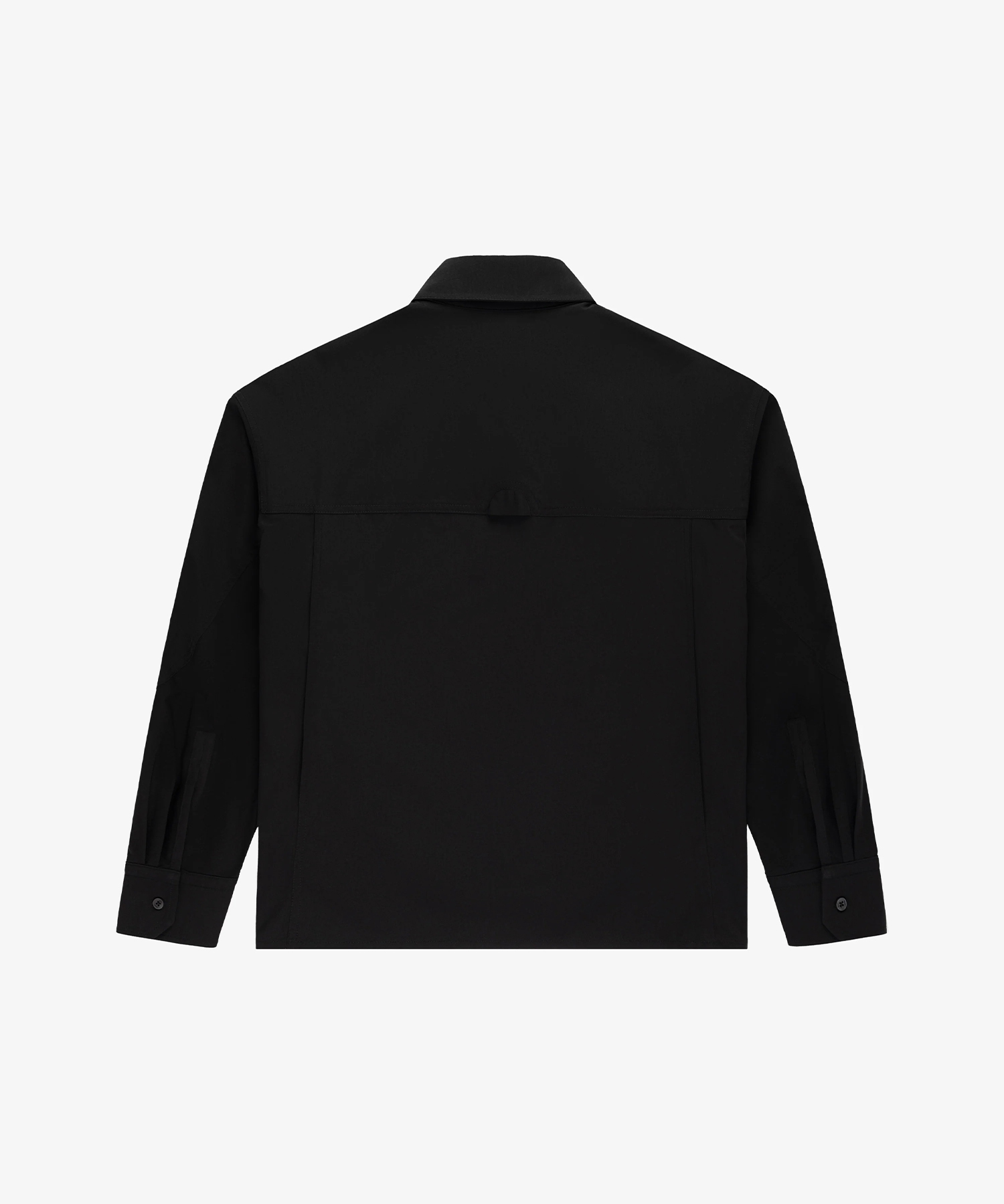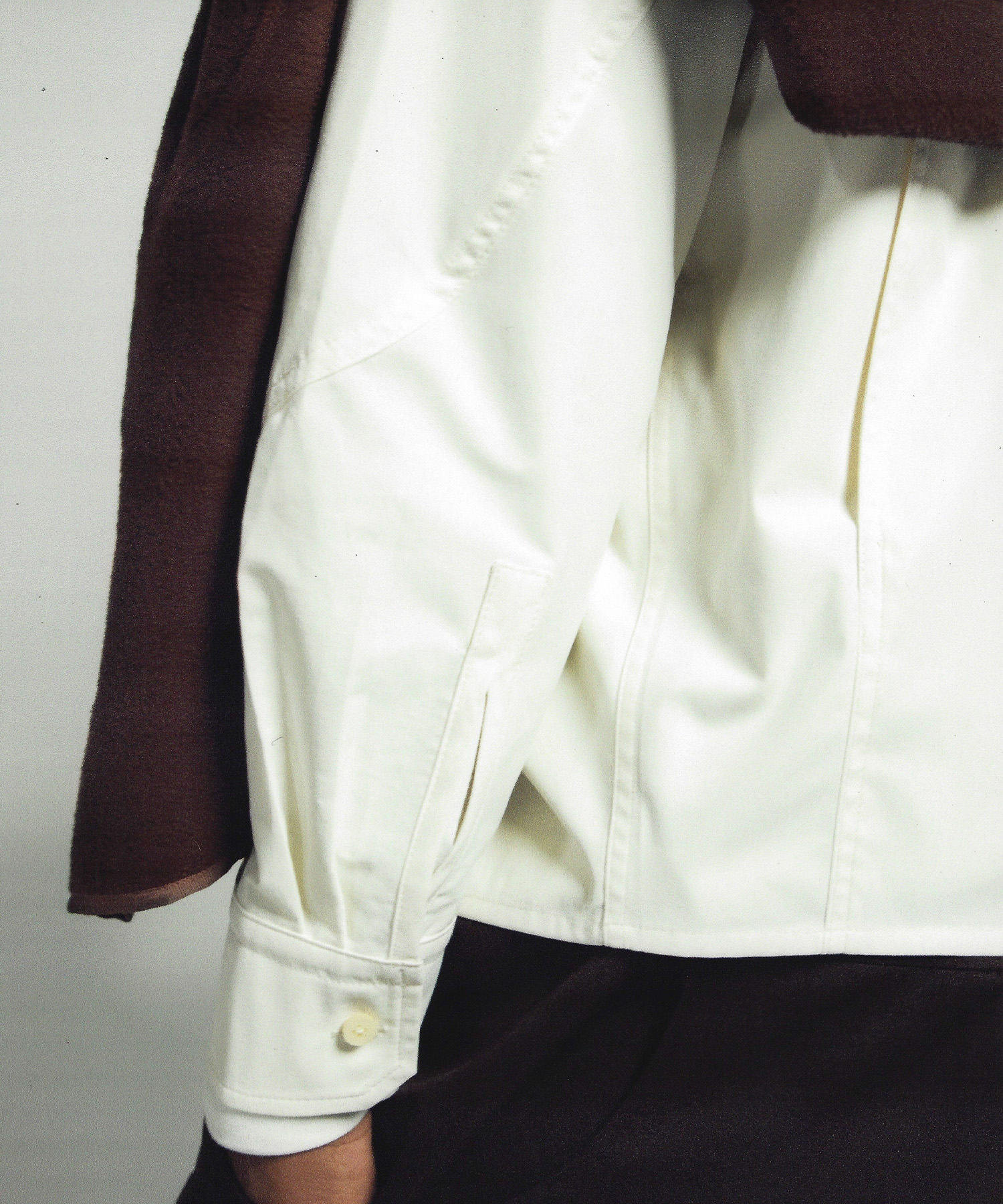 伸縮性ポリコンジュゲート繊維製ウェザークロスを使用したボックスシルエットのクロップドシャツ。撥水加工を施しています。ラバー加工ボタン、隠しプラケット、袖口のダーツ構造、特徴的なロッカーループディテールが特徴です。