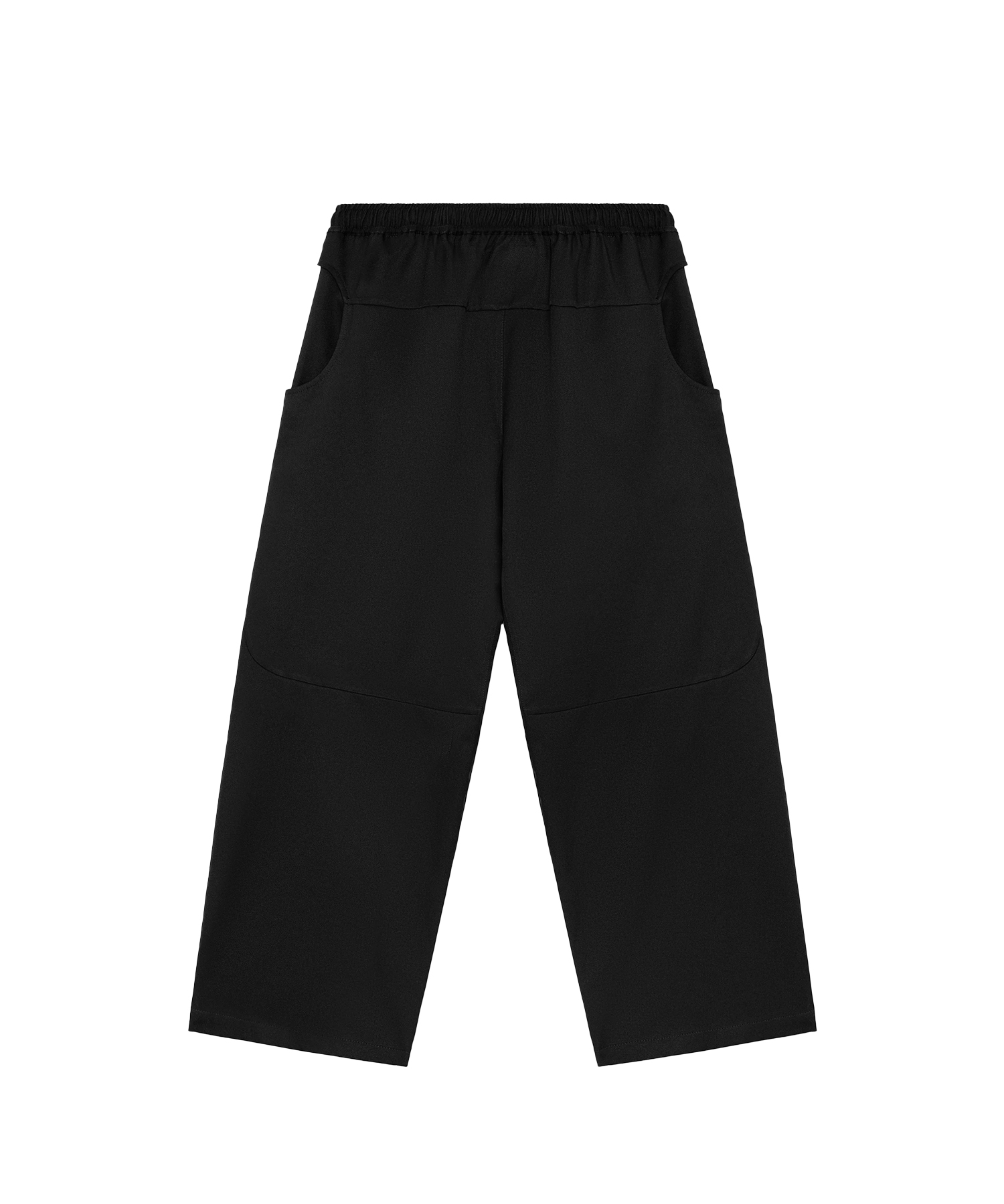 ワイドレッグパンツ。膝部分に立体構造を採用し、プリーツでシルエットを強調。ウエストはゴム仕様で内側にドローコード付き。スナップボタン留め、特徴的な円形ハンドポケットを備える。