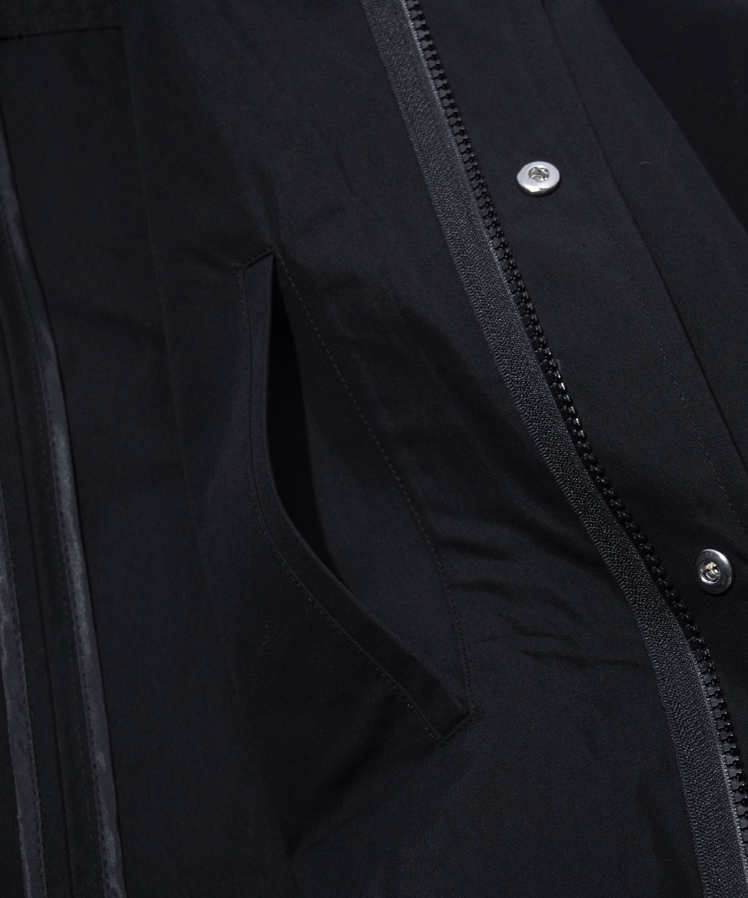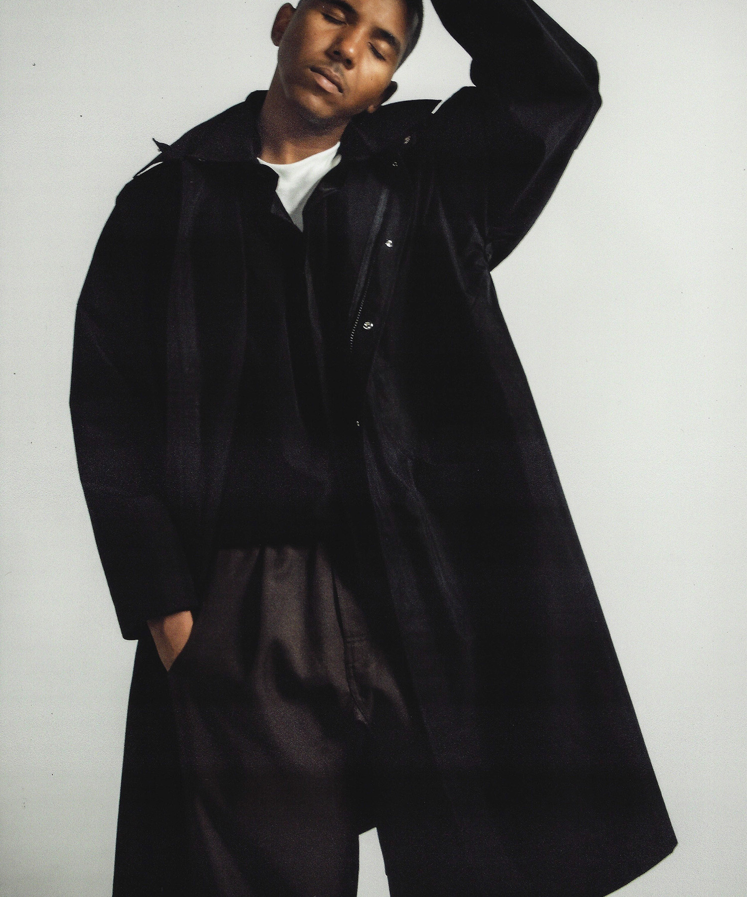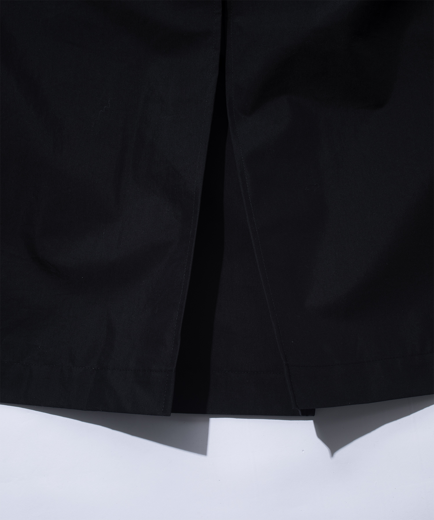 オーバーサイズシルエットのトレンチコート。撥水加工仕上げ。YKKジッパー、スナップカラー留めシステム、隠しプラケット、内側ウェルトポケット、パンツアクセス用サイドエントリー付き円形ハンドポケットを装備。