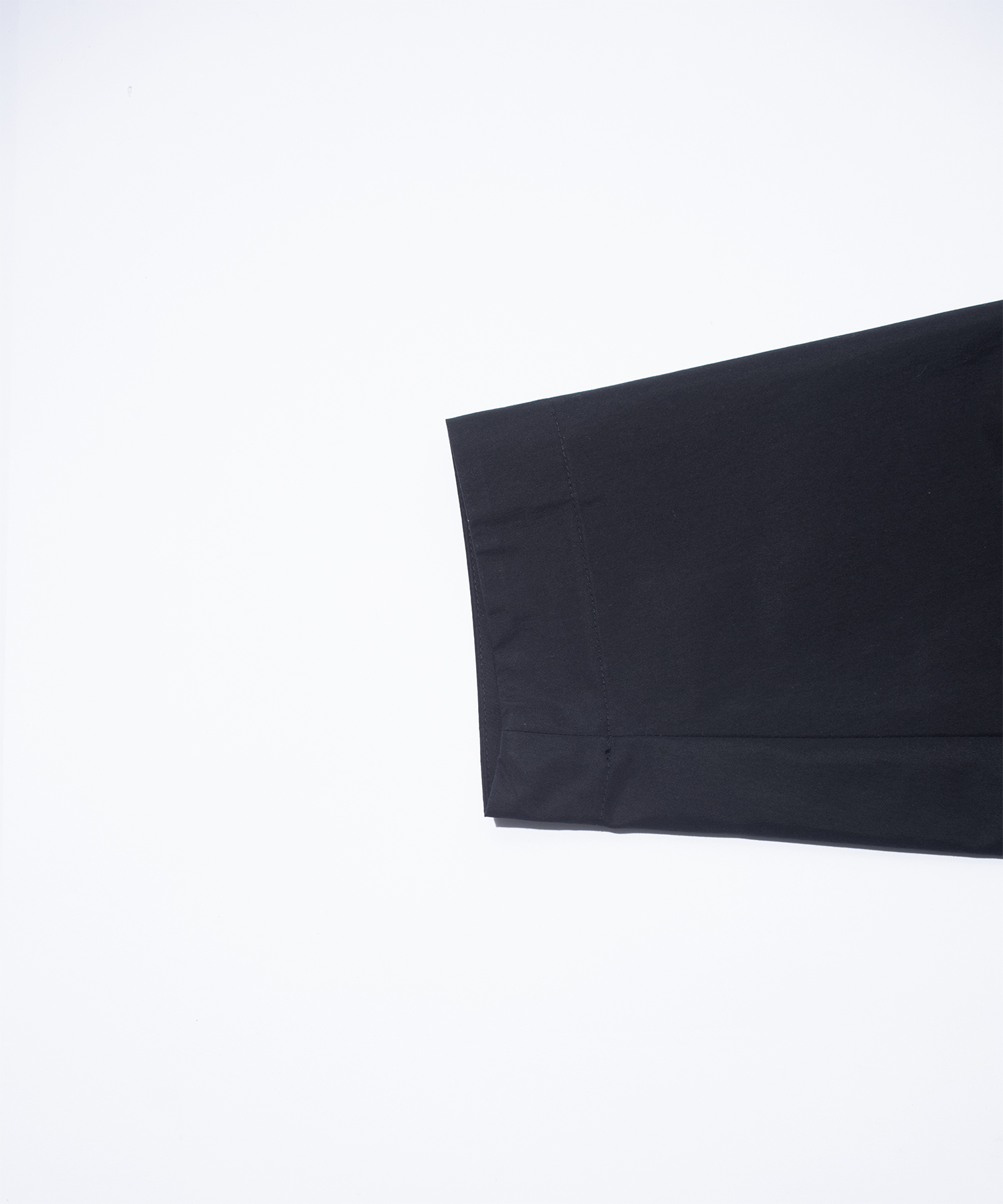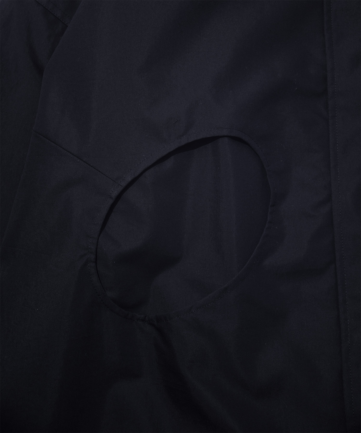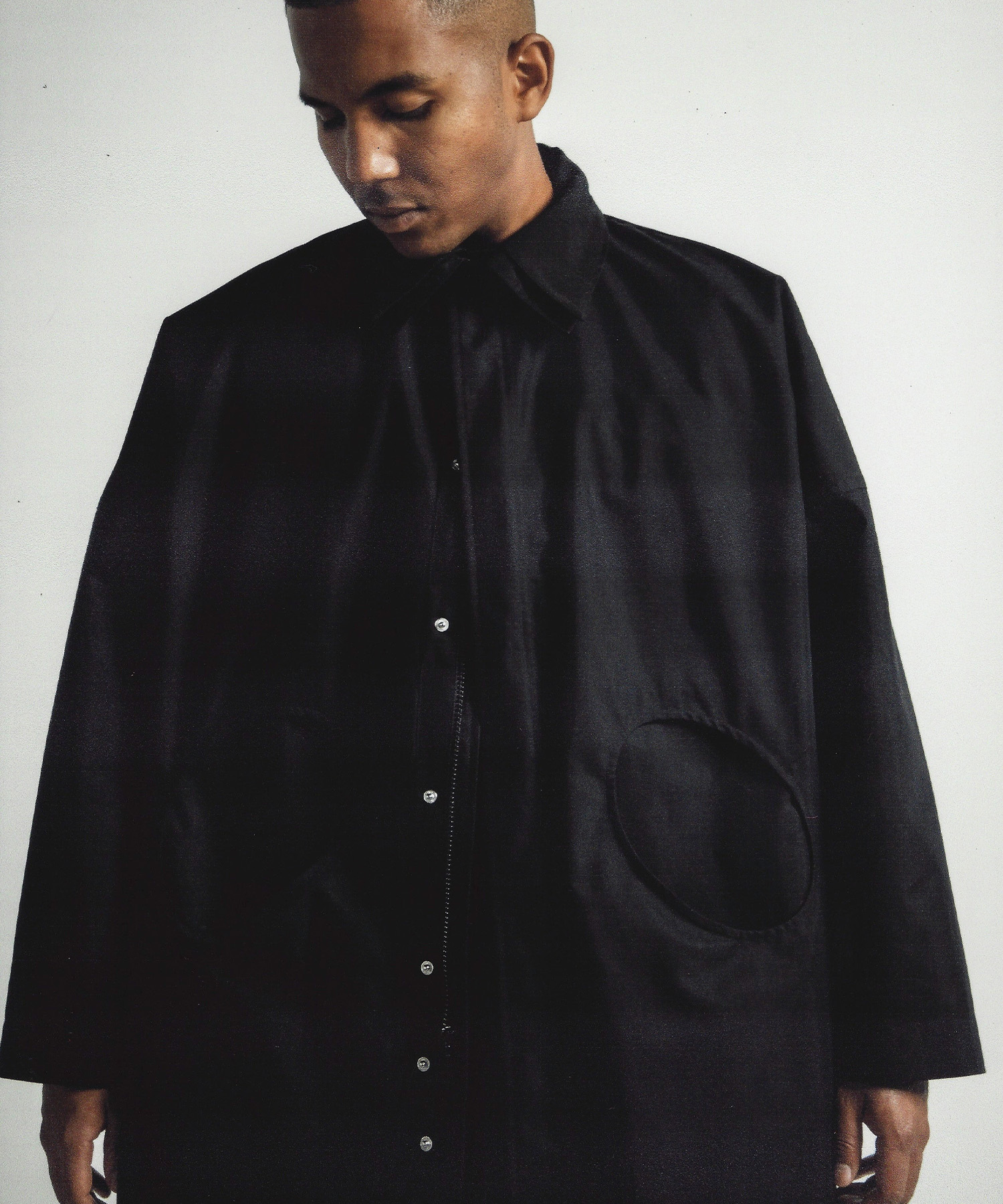 オーバーサイズシルエットのトレンチコート。撥水加工仕上げ。YKKジッパー、スナップカラー留めシステム、隠しプラケット、内側ウェルトポケット、パンツアクセス用サイドエントリー付き円形ハンドポケットを装備。