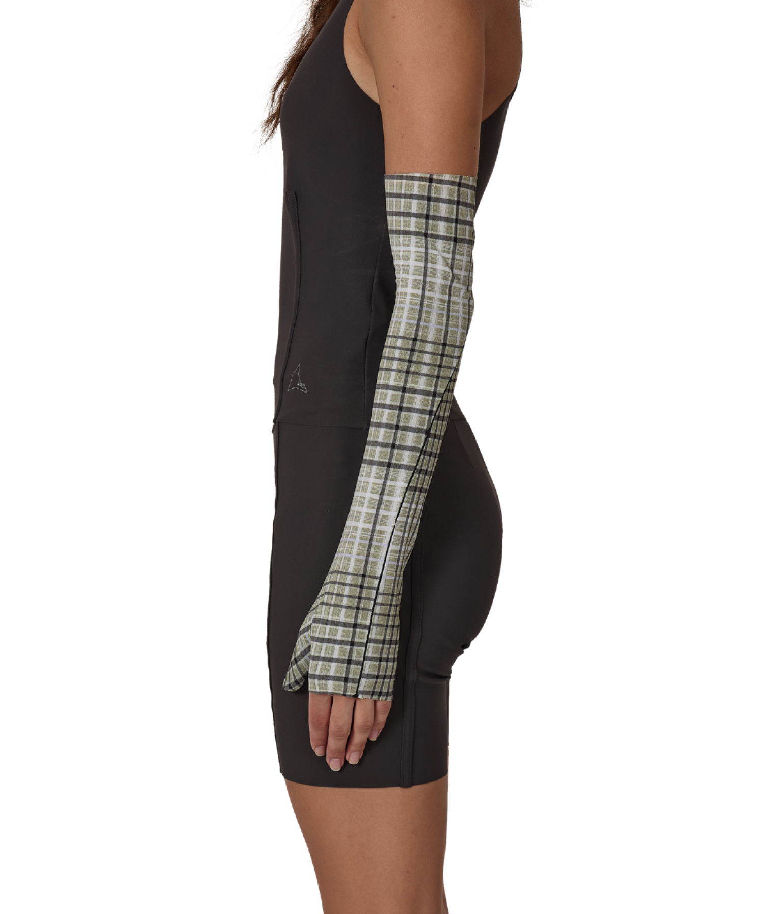 タトリ UPF 50+ アームスリーブ(セージグリーン/チェックプリント)は、軽量なプロテクションと一日中快適な着用感を実現するデザインです。