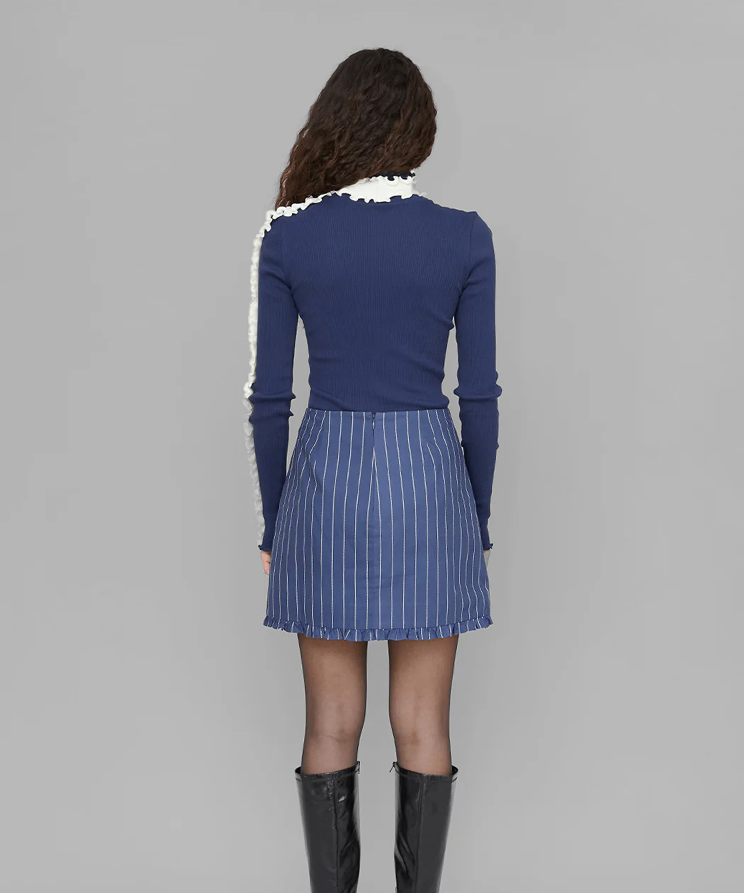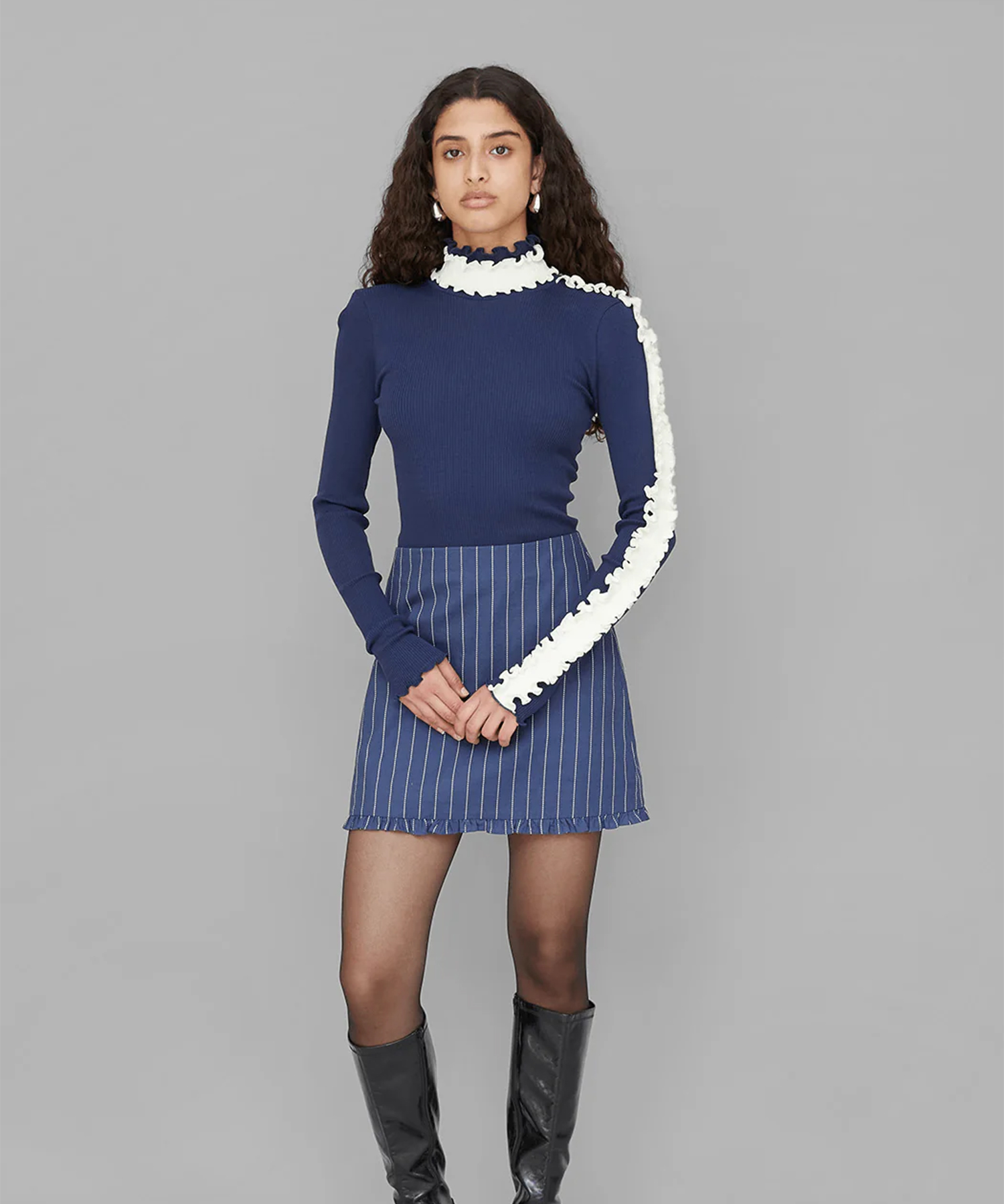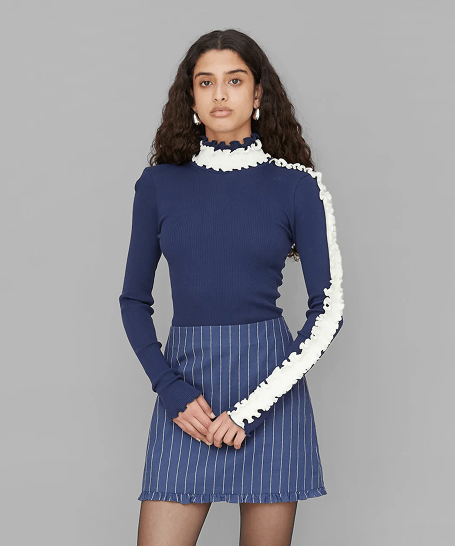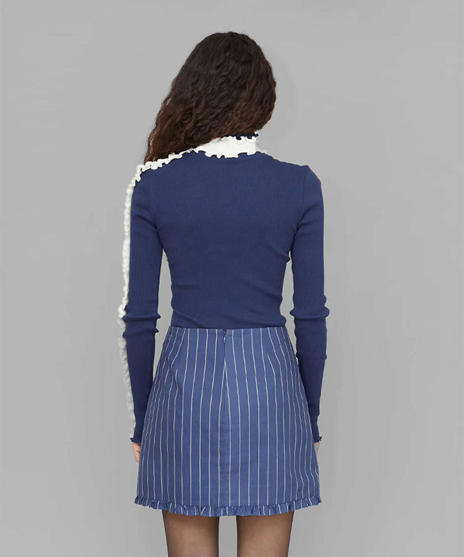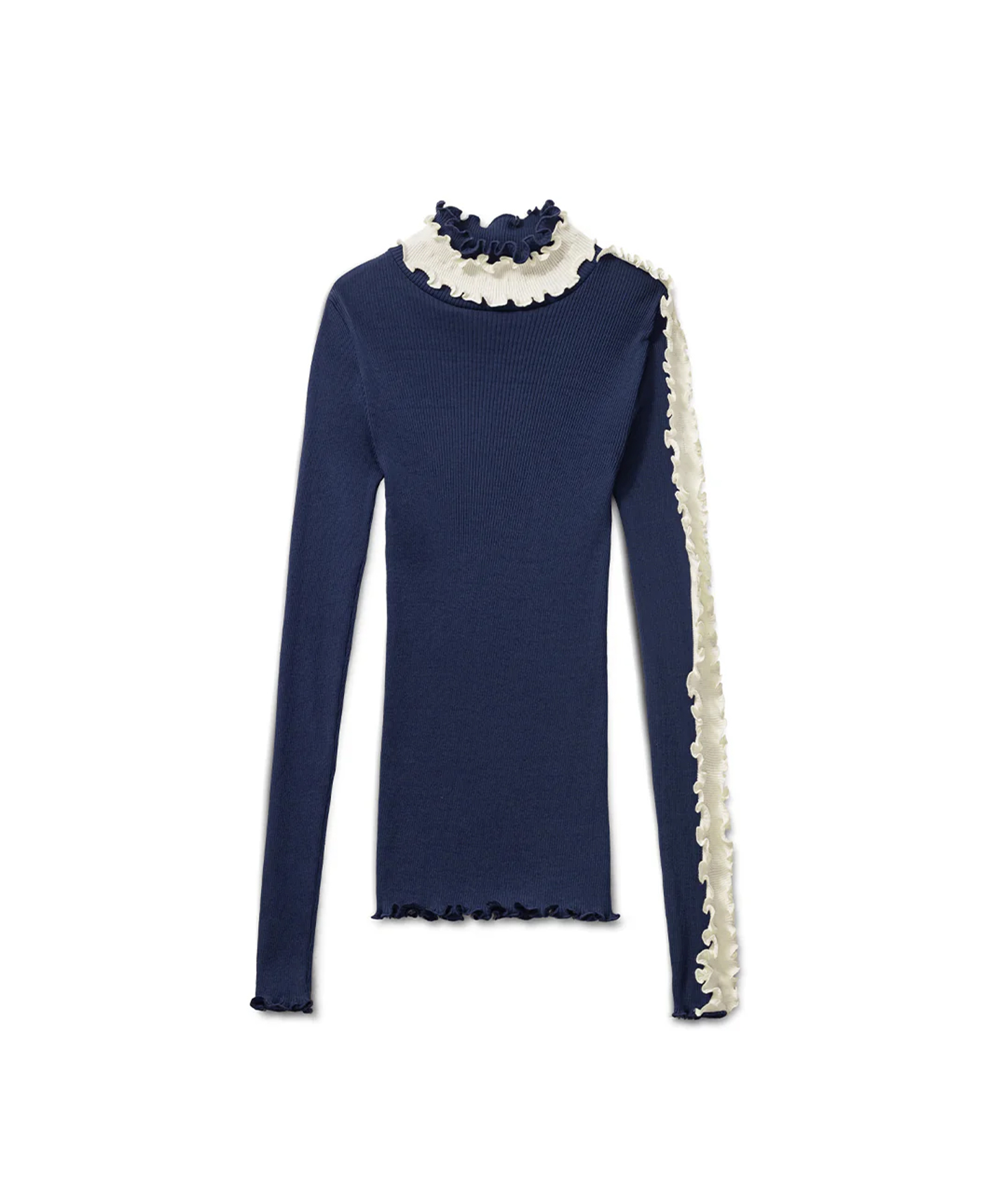 首周りと片方の袖に、コントラストの効いたホワイトのフリルディテールを施しています。