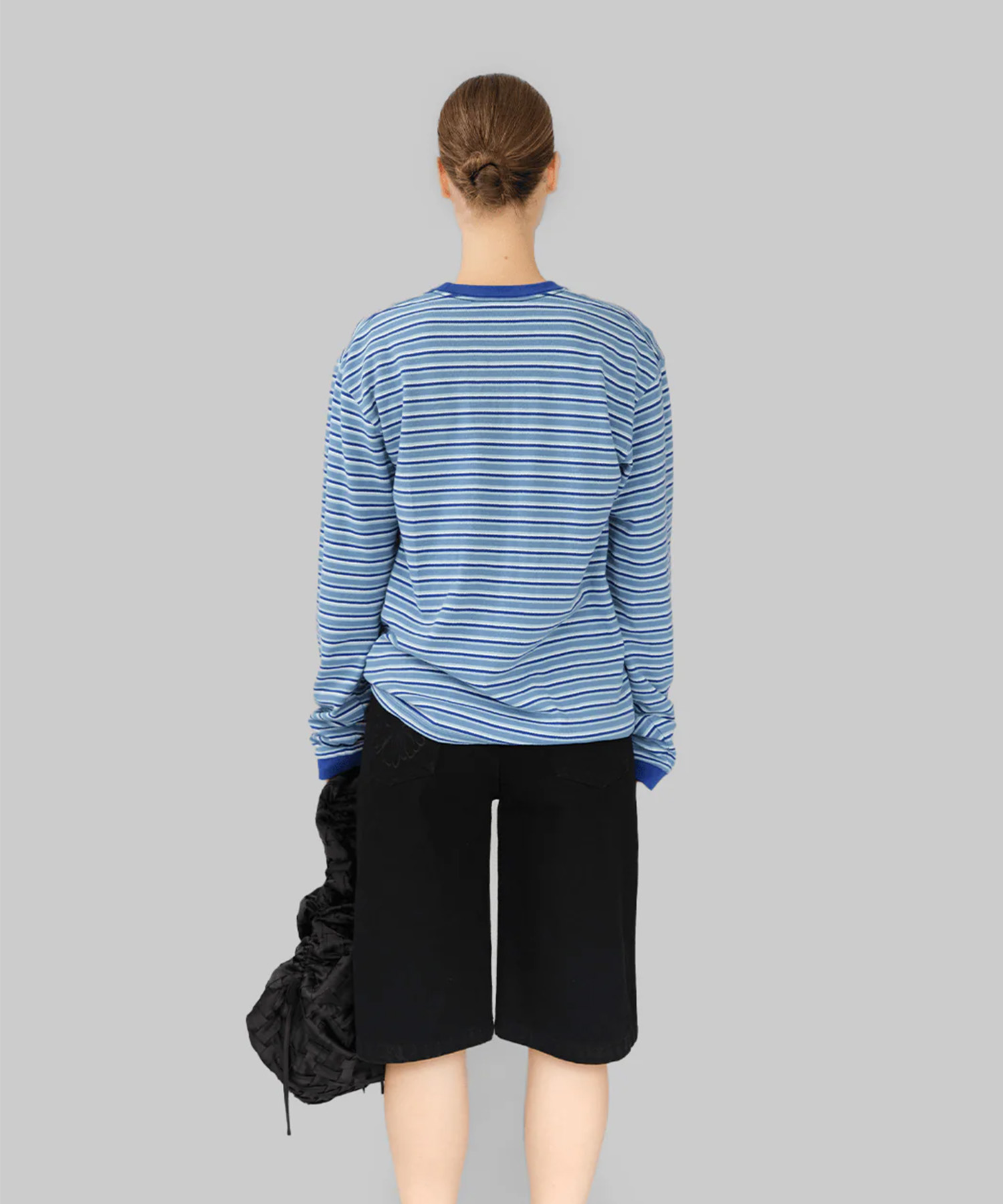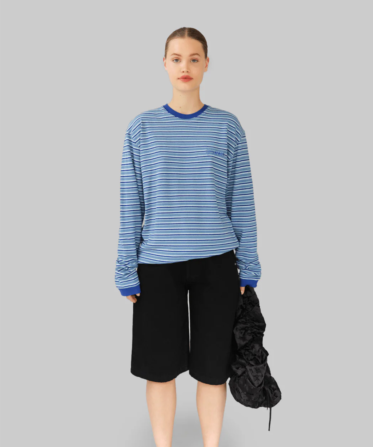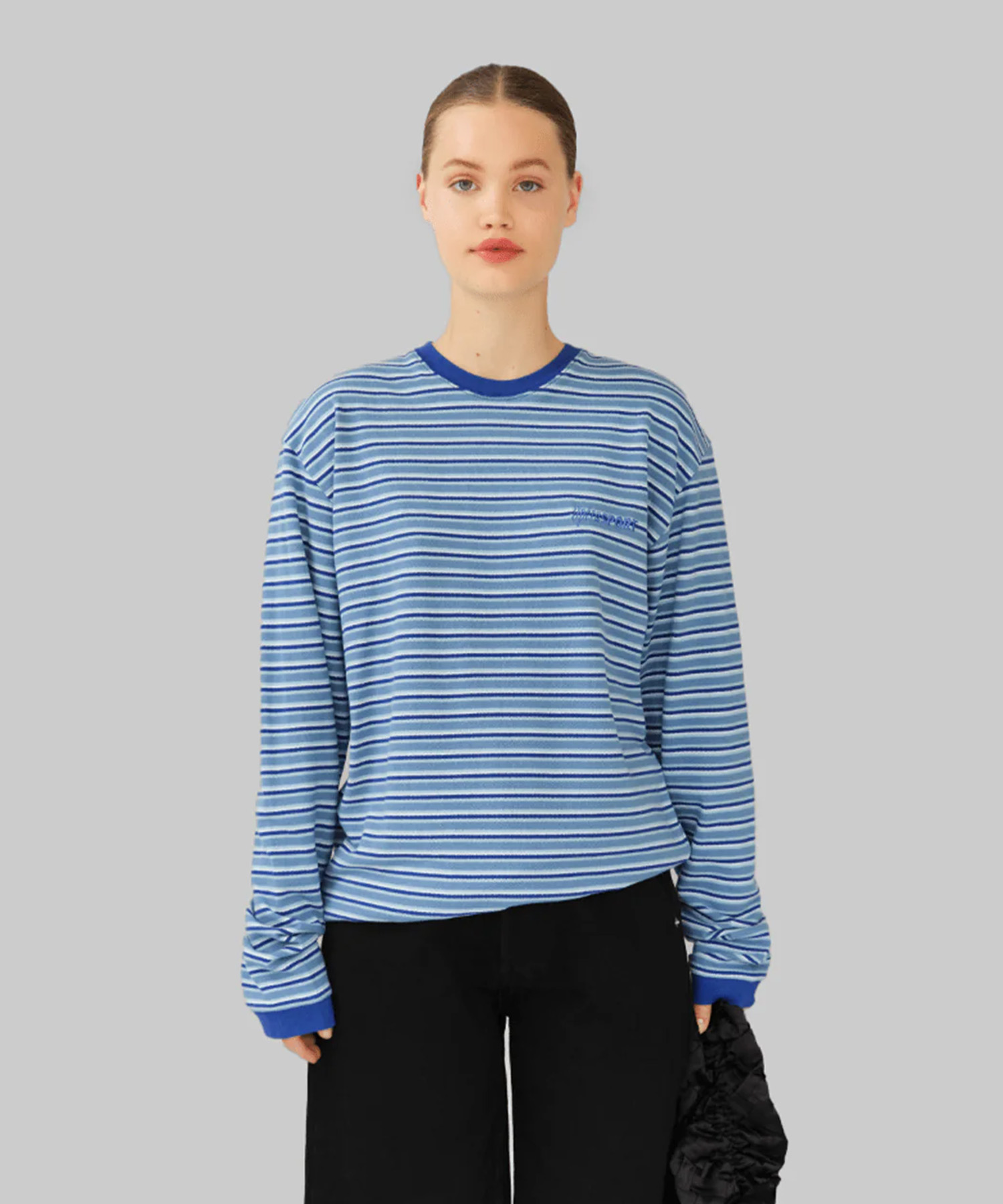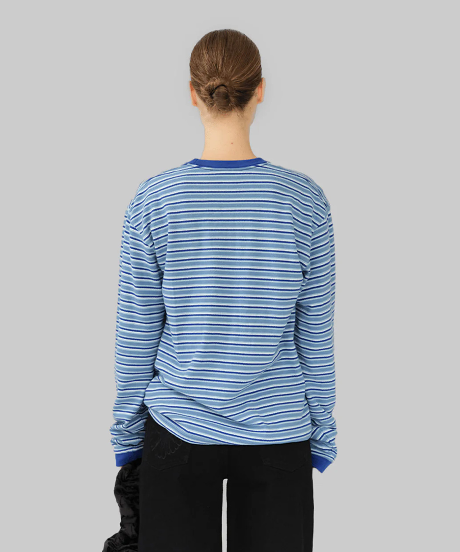 ブルーストライプの100%オーガニックコットン素材を使用したロングスリーブTシャツ。 リラックス感のあるシルエットに、ラウンドネックとリブ仕様の襟・袖口を配したデザイン。