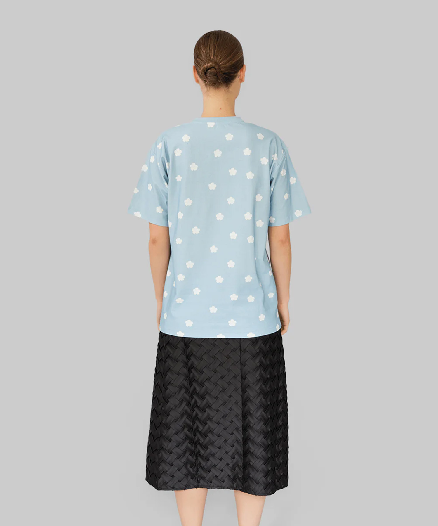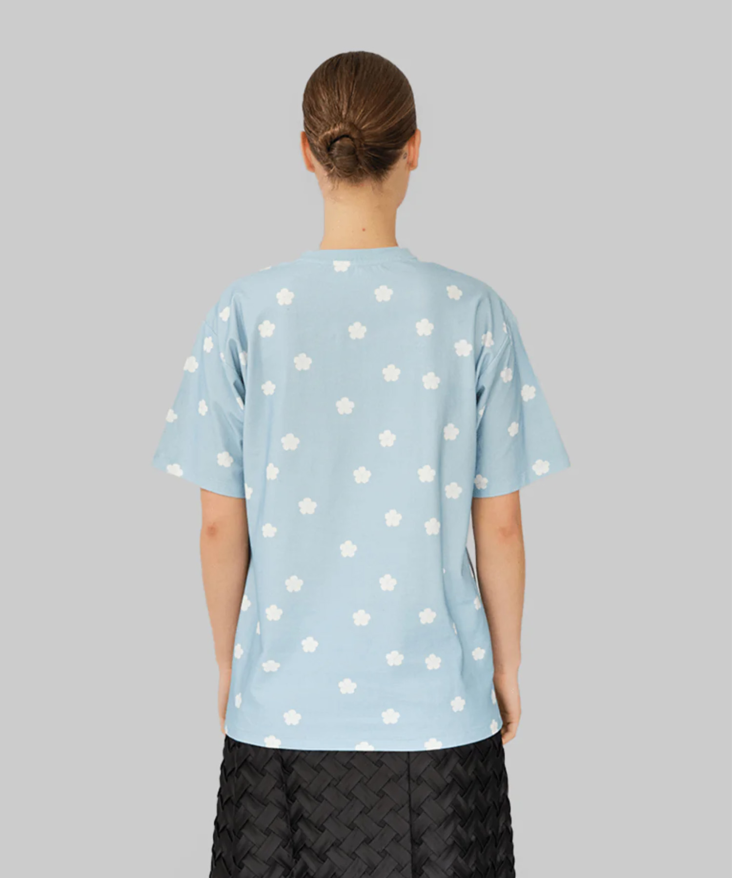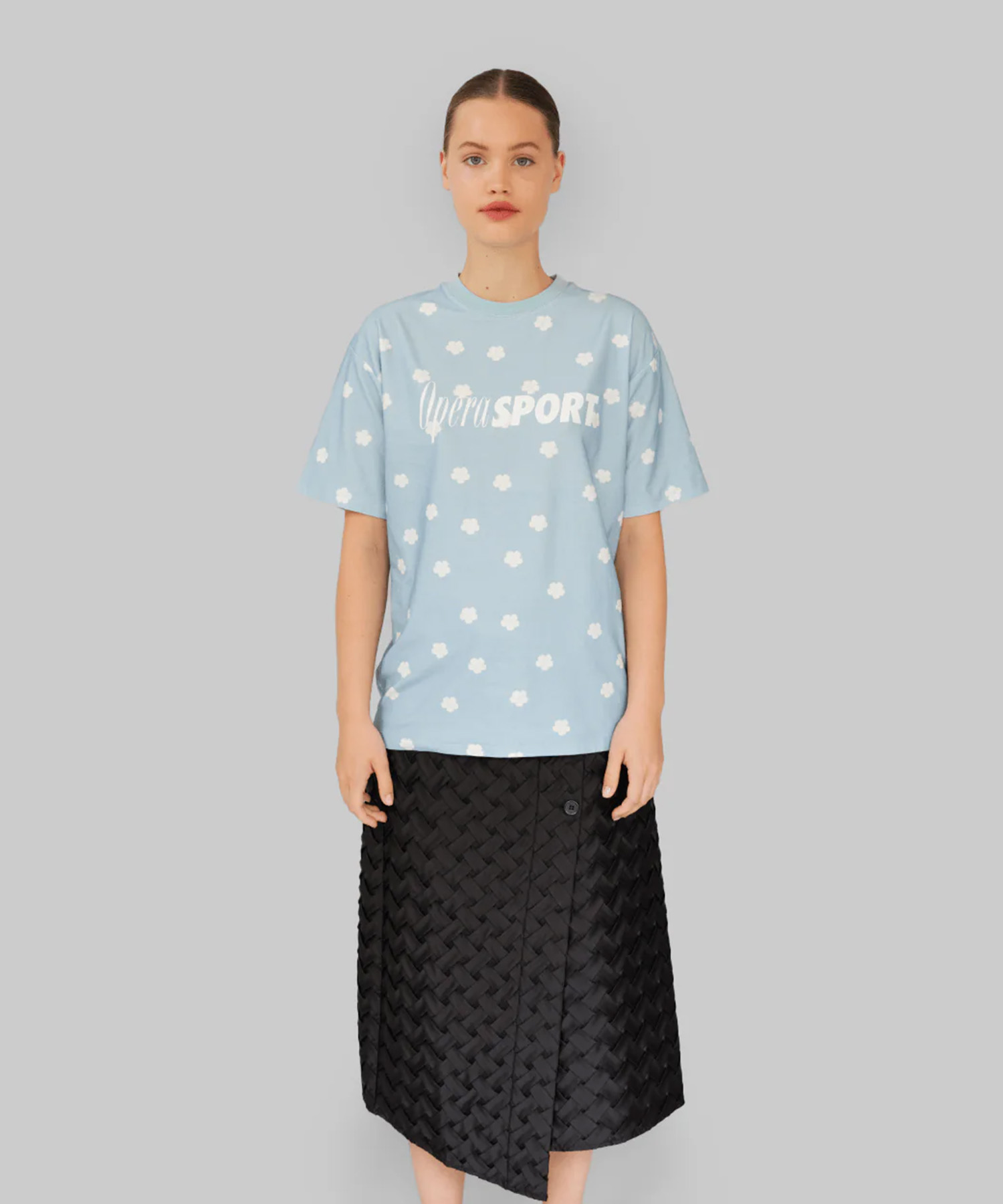 ベビーブルーの100%オーガニックコットン素材を使用したユニセックスTシャツ。 リラックス感のあるシルエットに、全体に施されたホワイトのフラワープリントと胸元のOperaSPORTロゴが印象的なデザイン。