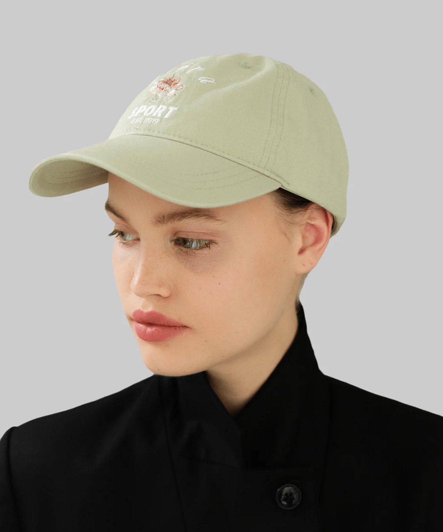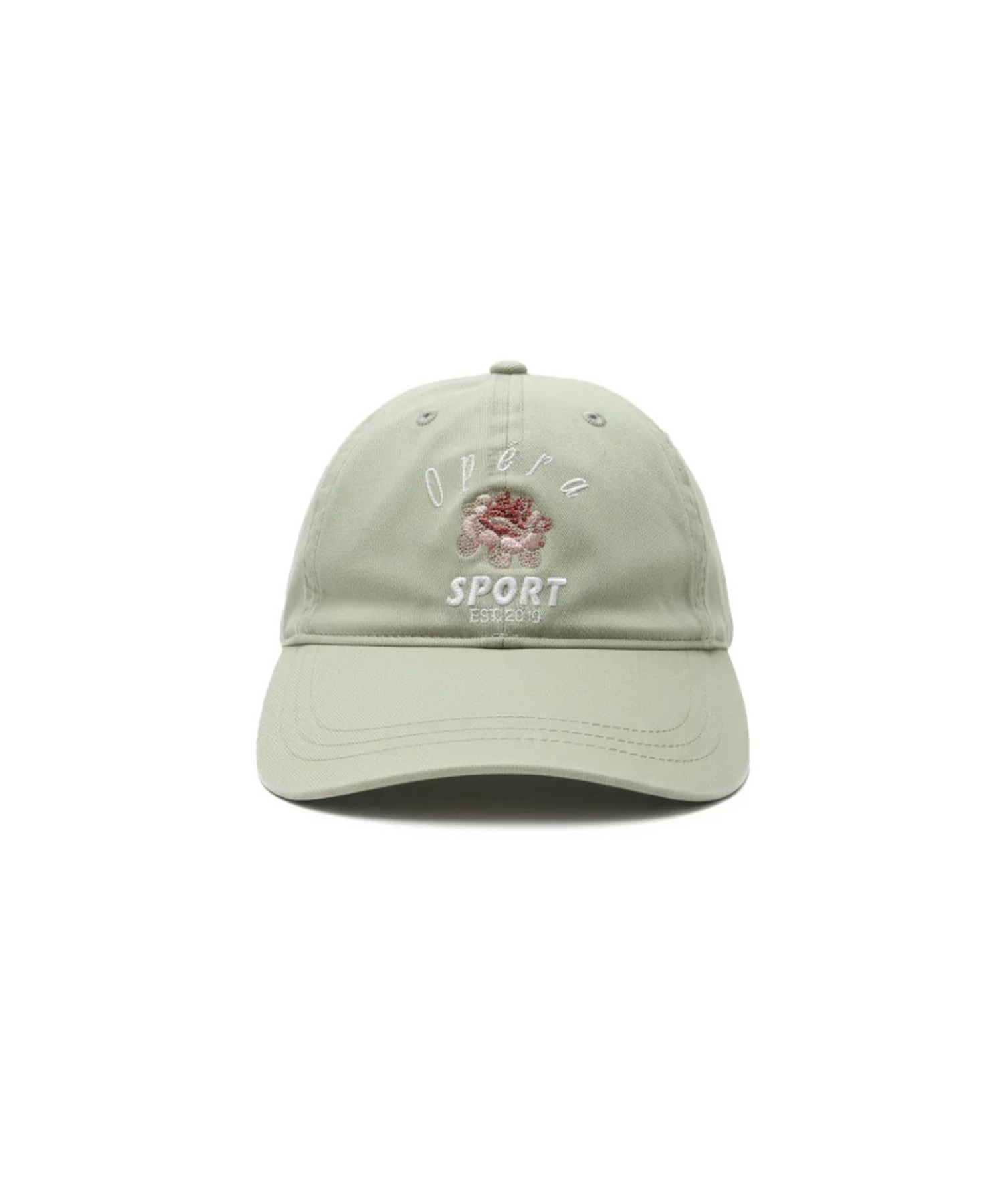 スモークグリーンの100%オーガニックコットン素材を使用したキャップ。 カーブドブリムのベーシックなシルエットに、OperaSPORTのロゴ刺繍と繊細なフローラルモチーフを配置。