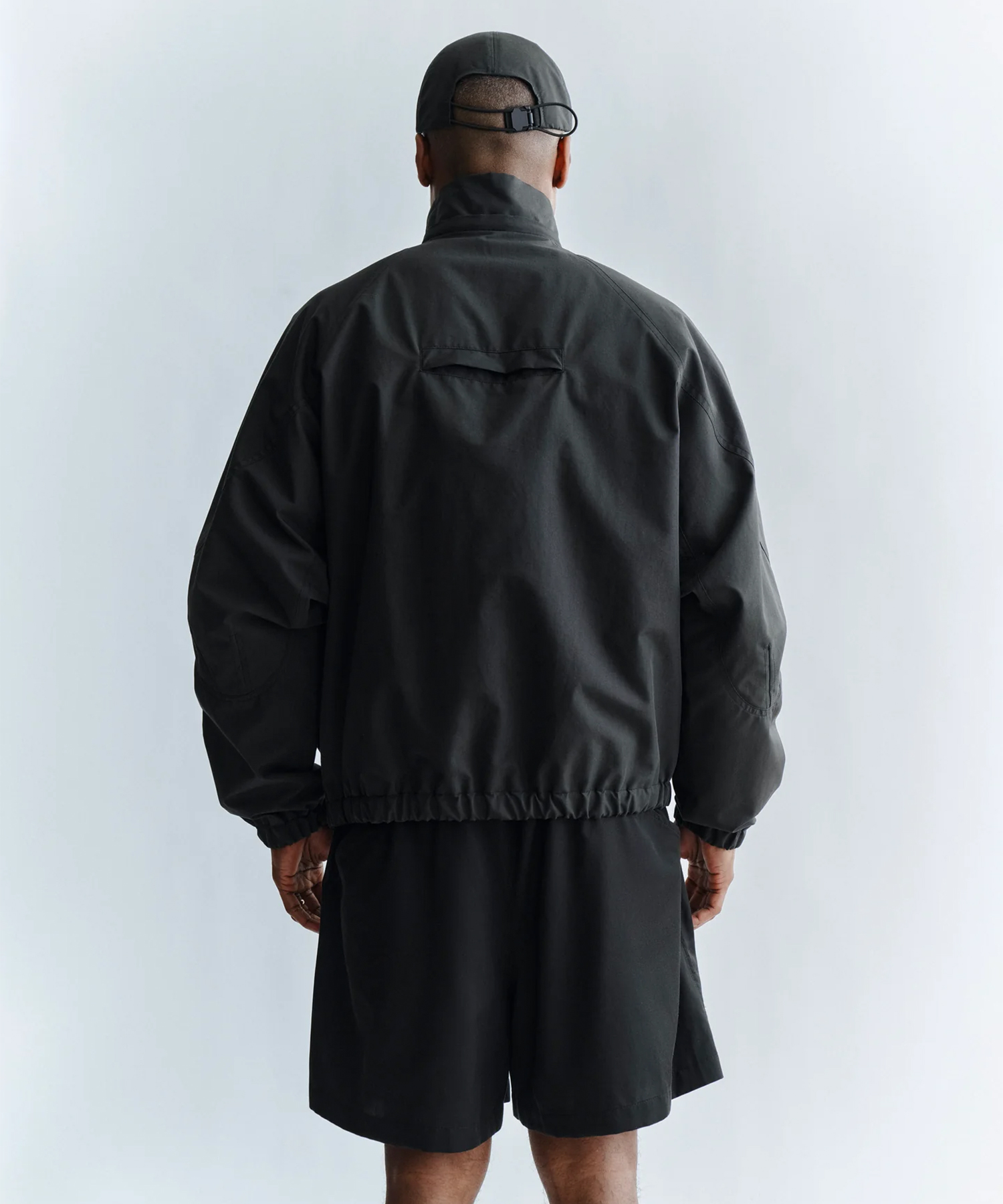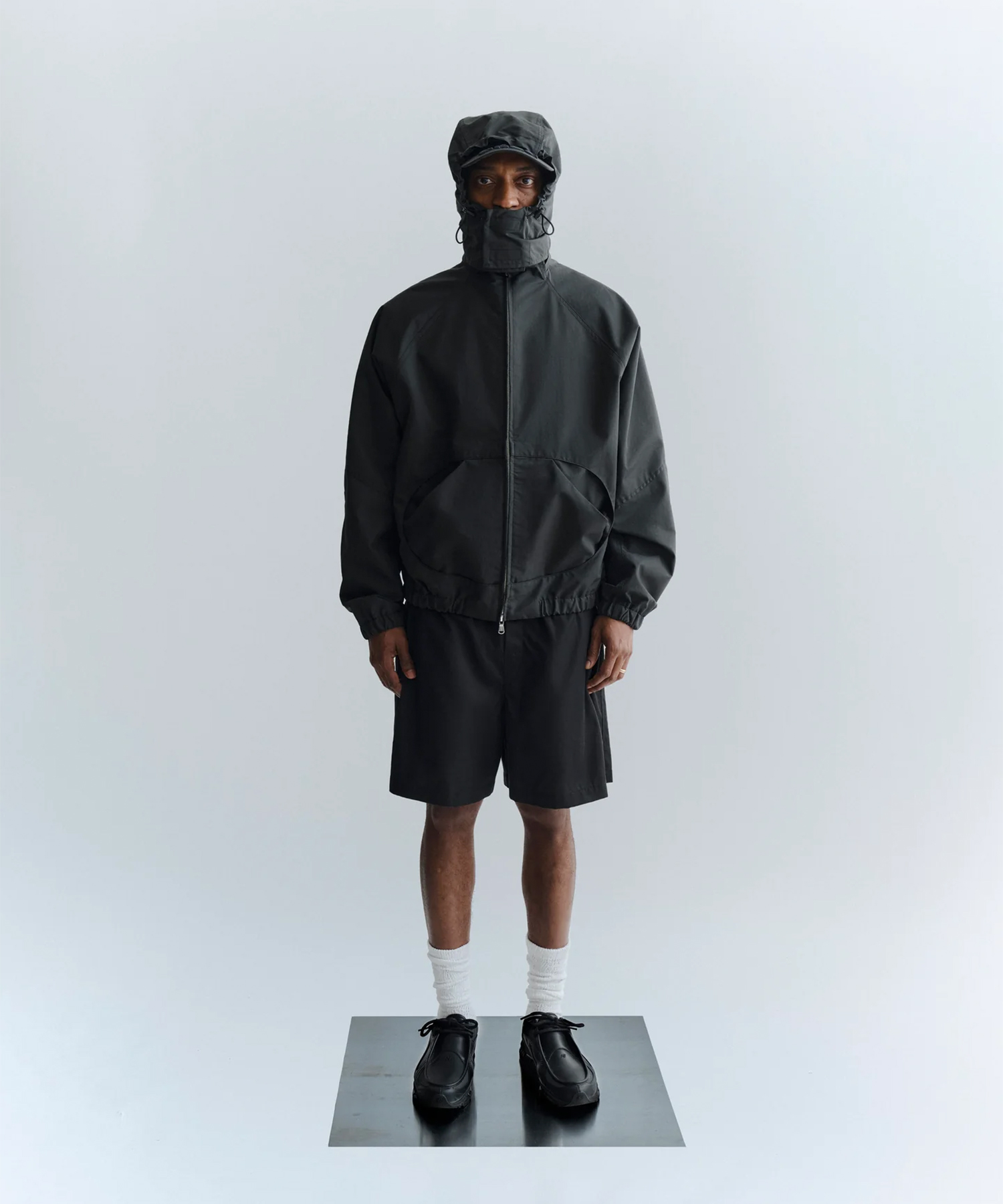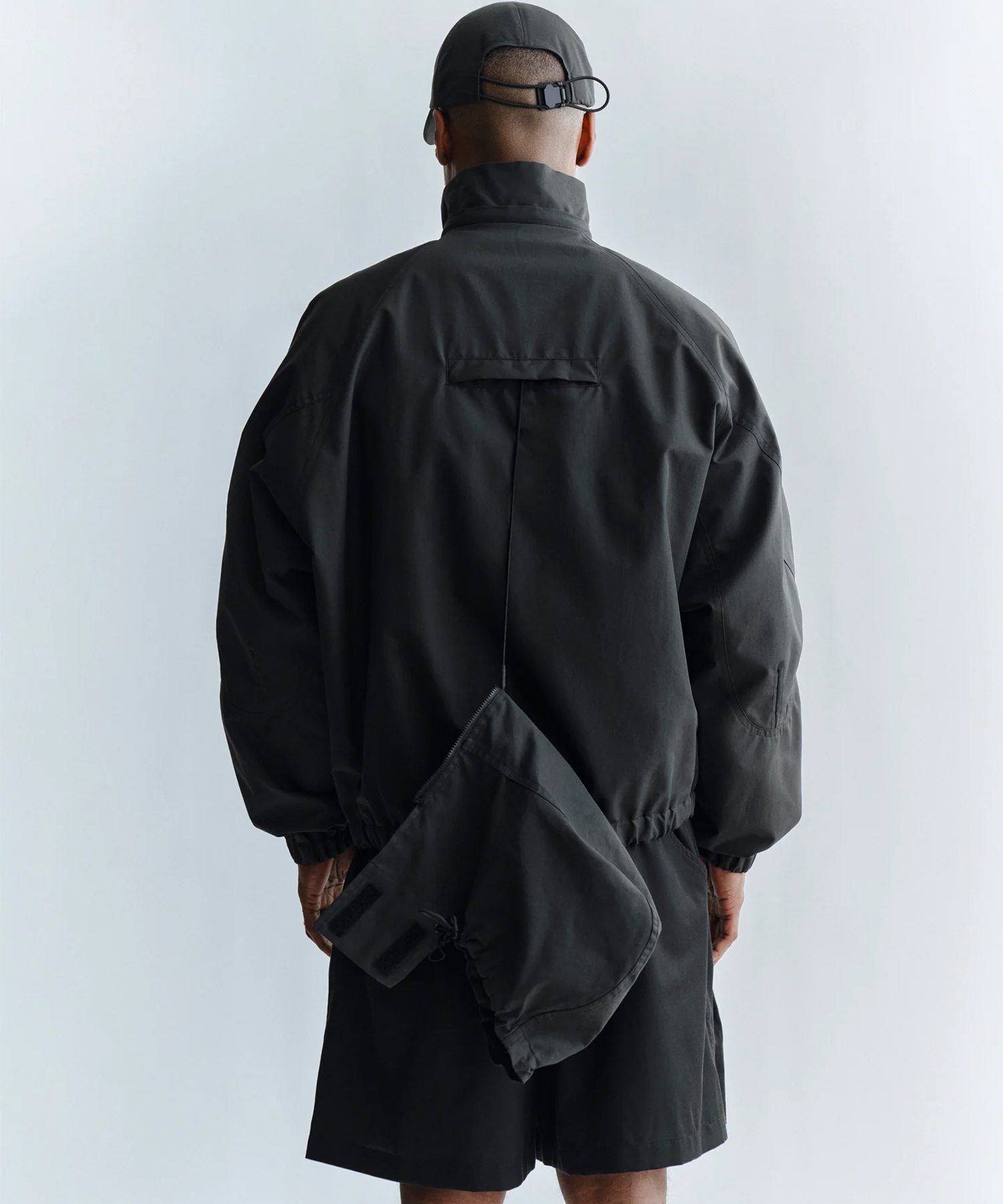 3パネル構造のパッカブルフードはリバースエントリーのウェルトポケットに収納可能で、バンジーシステムで固定しつつ、内蔵ジップで襟元への取り付けも可能です。袖口と裾はゴム仕様で、トラックウェアの機能性を備えています。