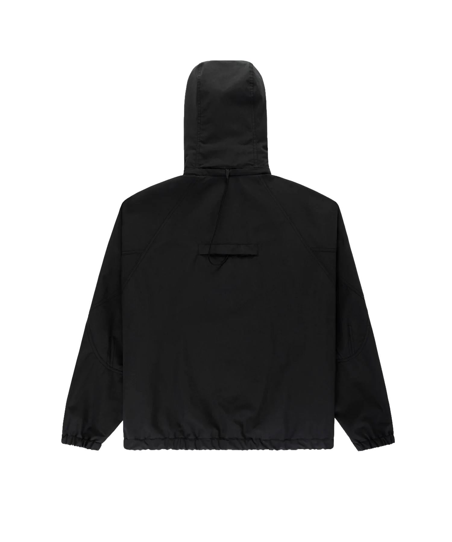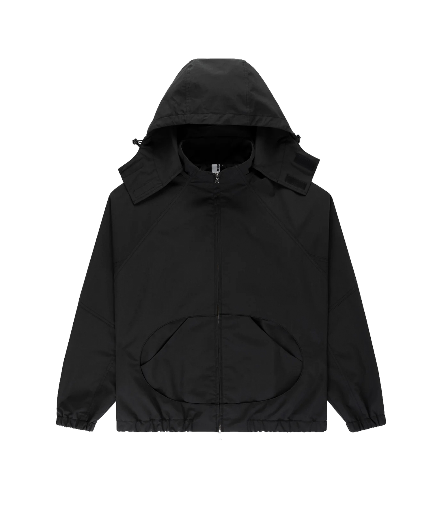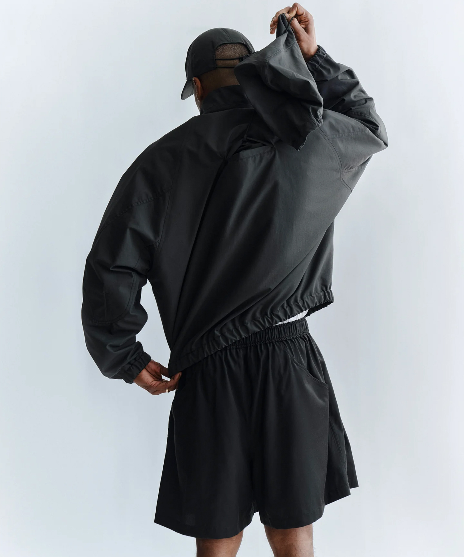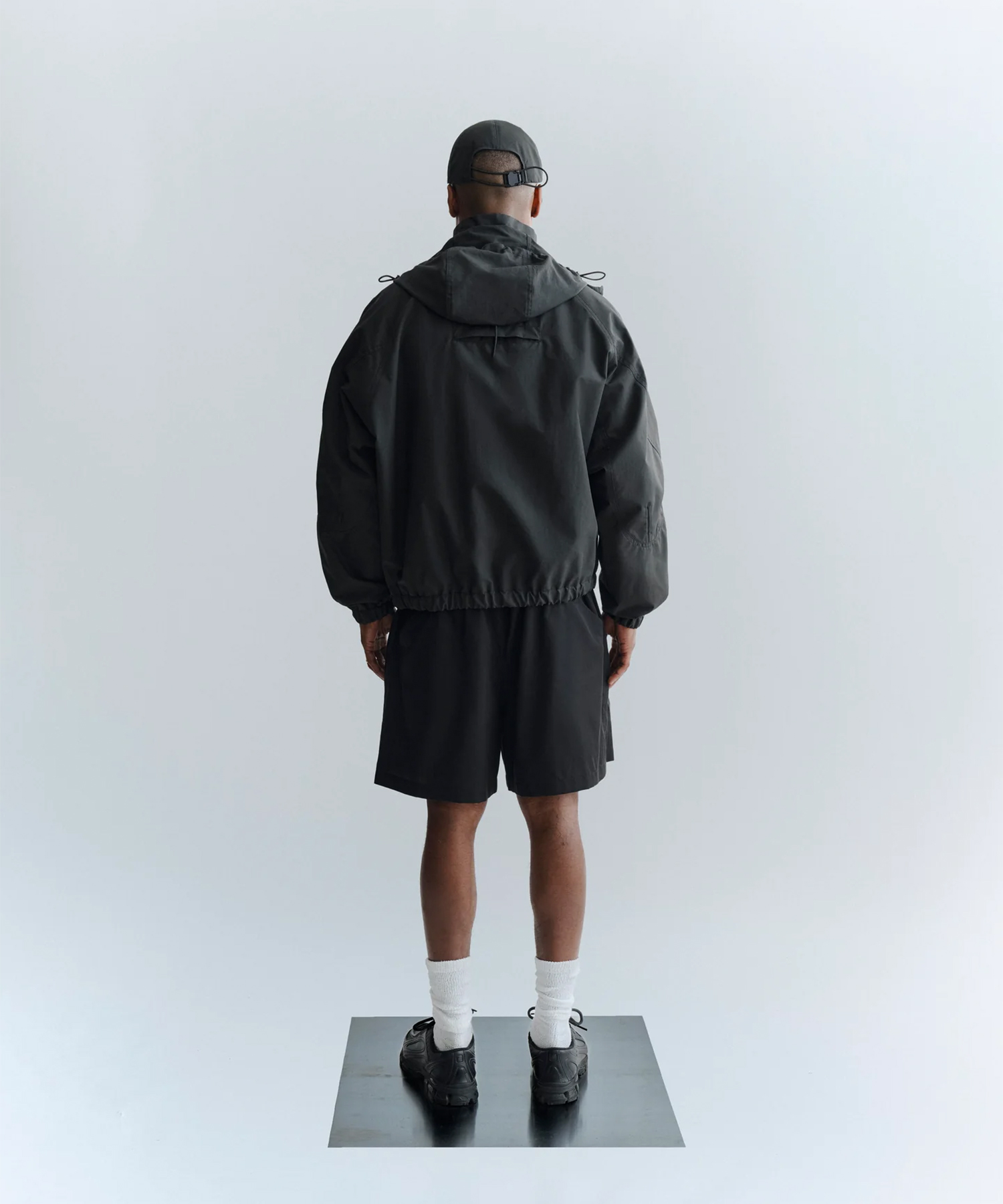 3パネル構造のパッカブルフードはリバースエントリーのウェルトポケットに収納可能で、バンジーシステムで固定しつつ、内蔵ジップで襟元への取り付けも可能です。袖口と裾はゴム仕様で、トラックウェアの機能性を備えています。