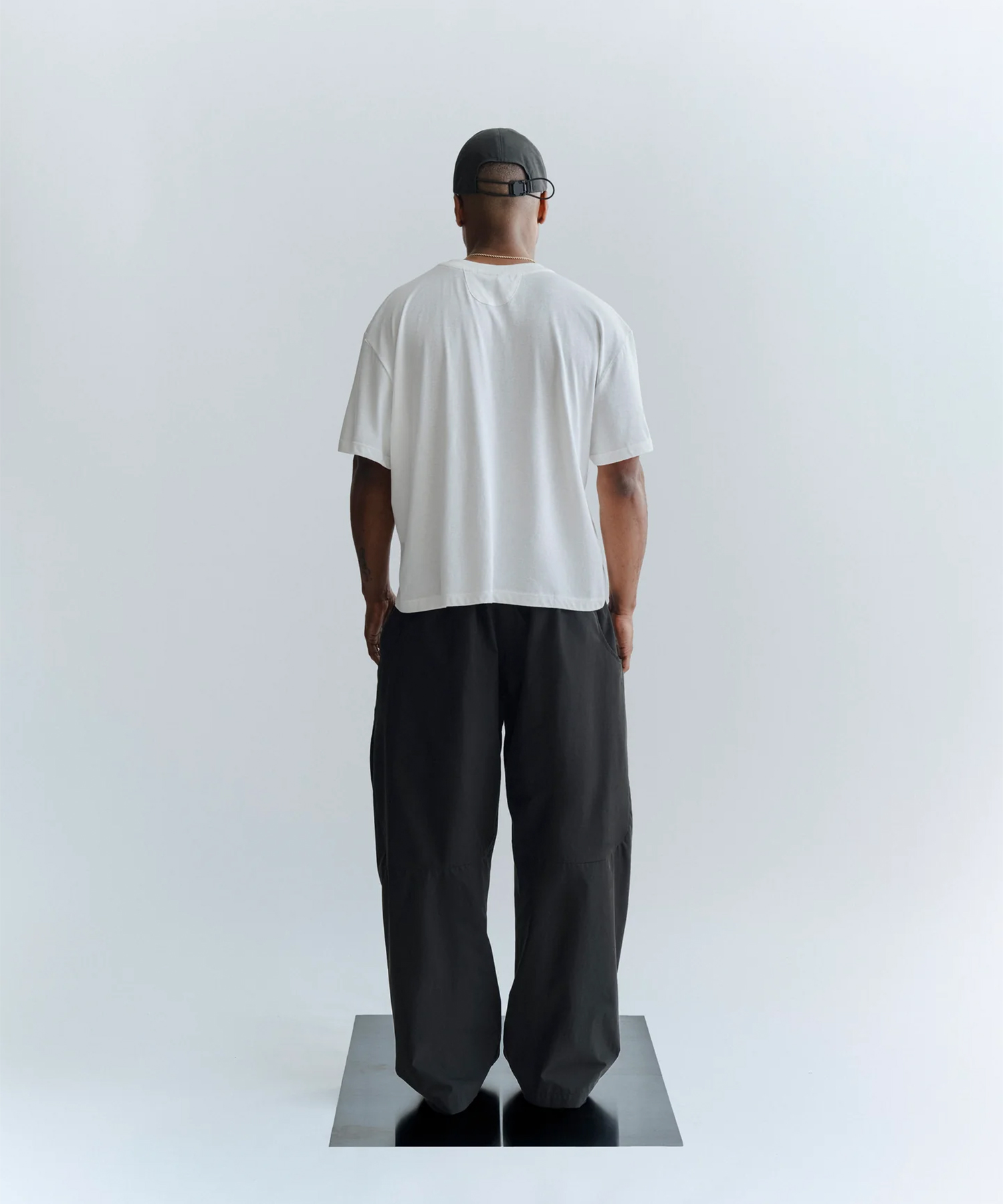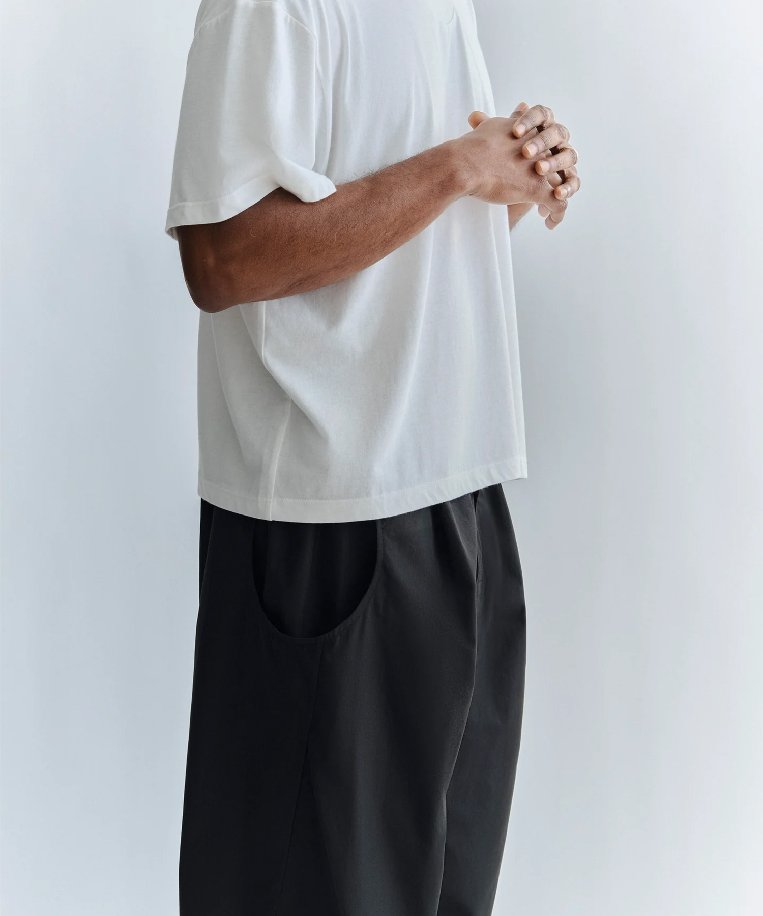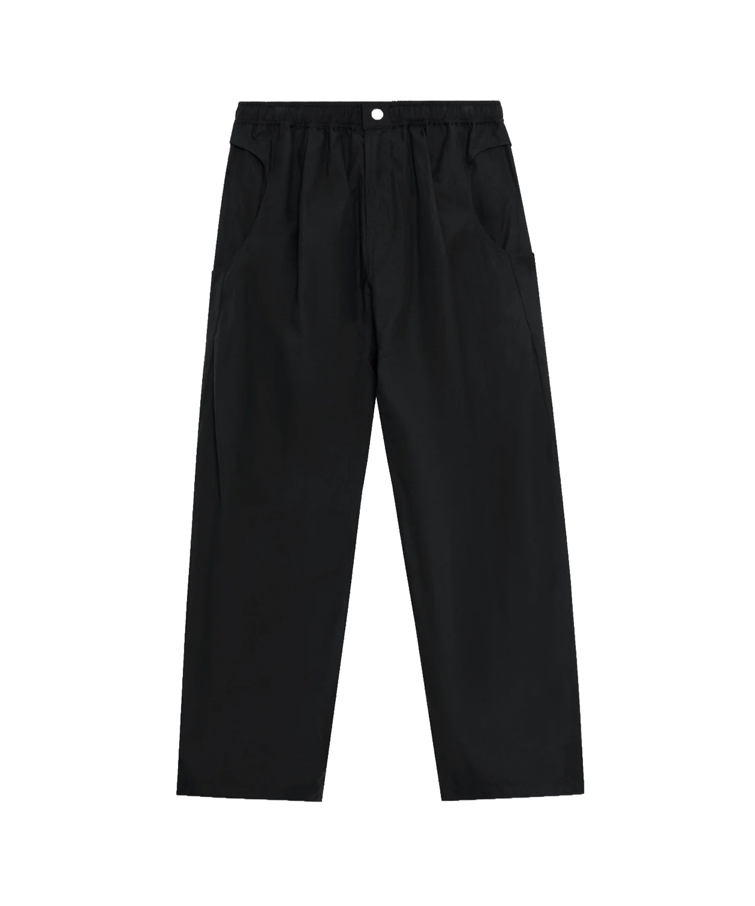 ウエストはゴム仕様で、内側のドローコードシステムをスナップで固定可能。シグネチャーであるサーキュラーハンドポケットが機能的なディテールとして配置されています。