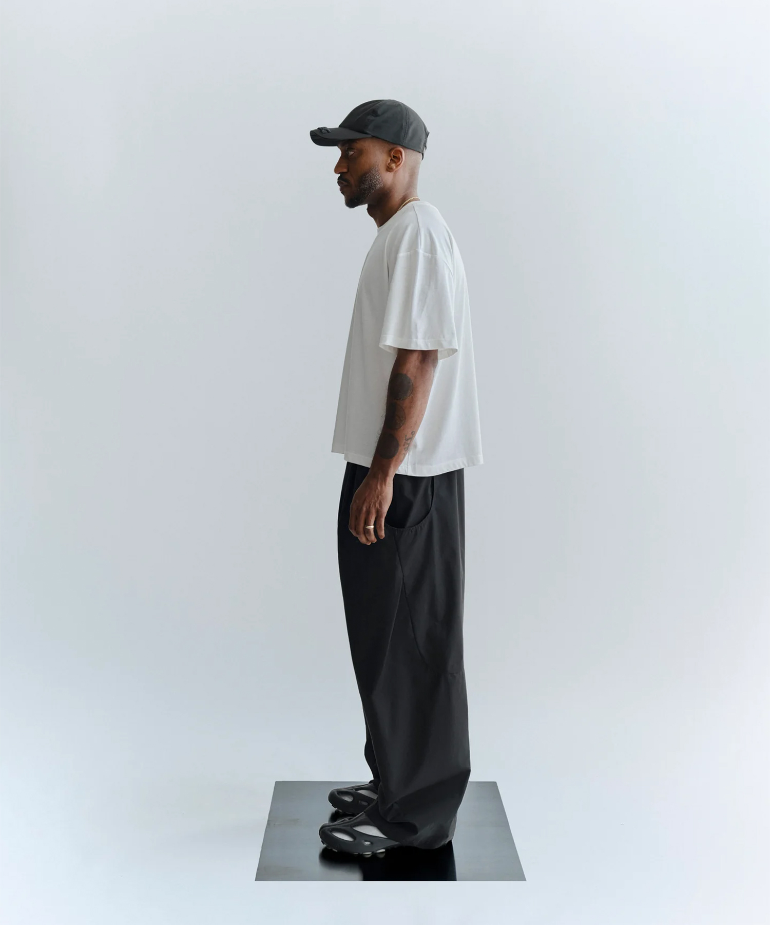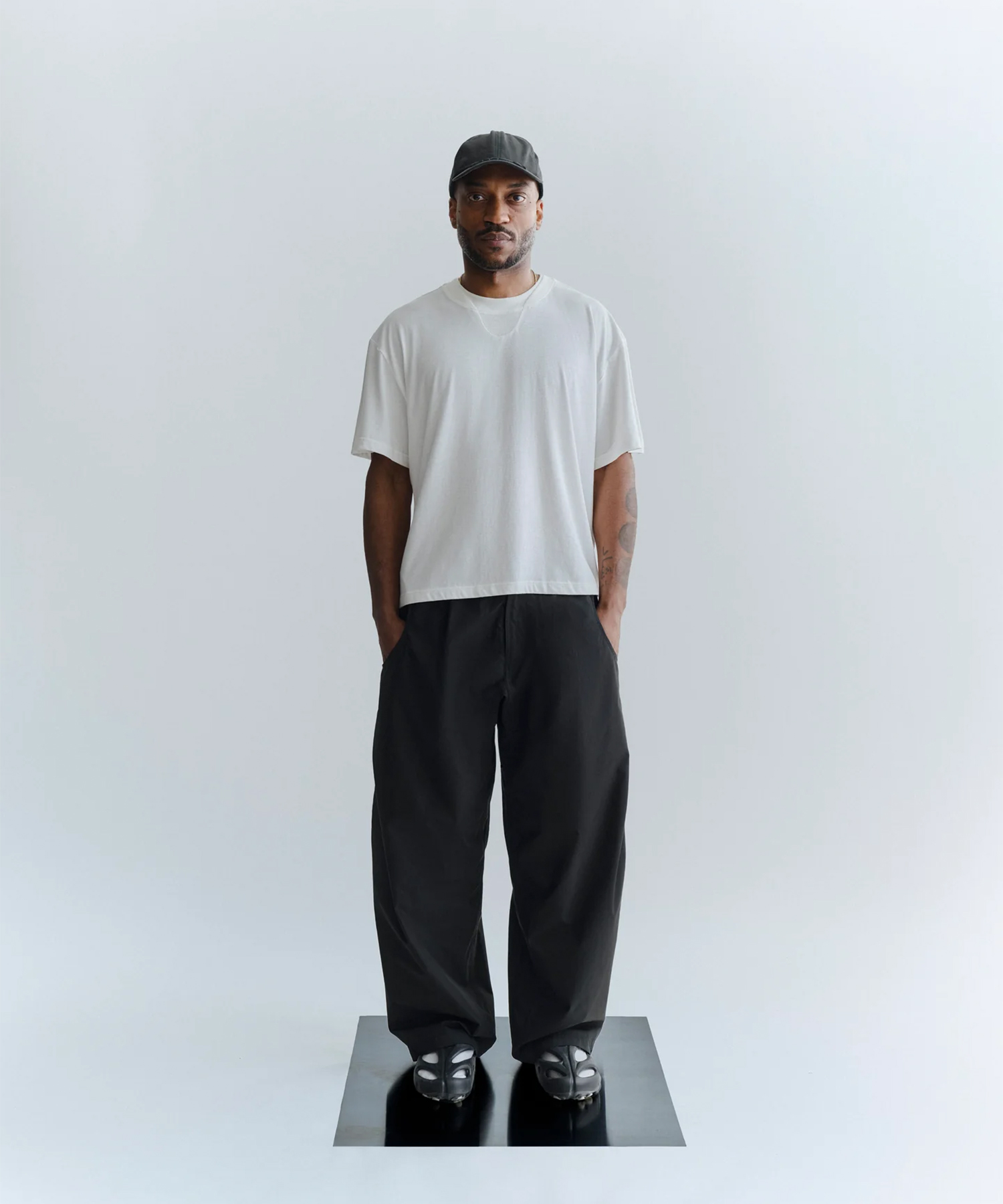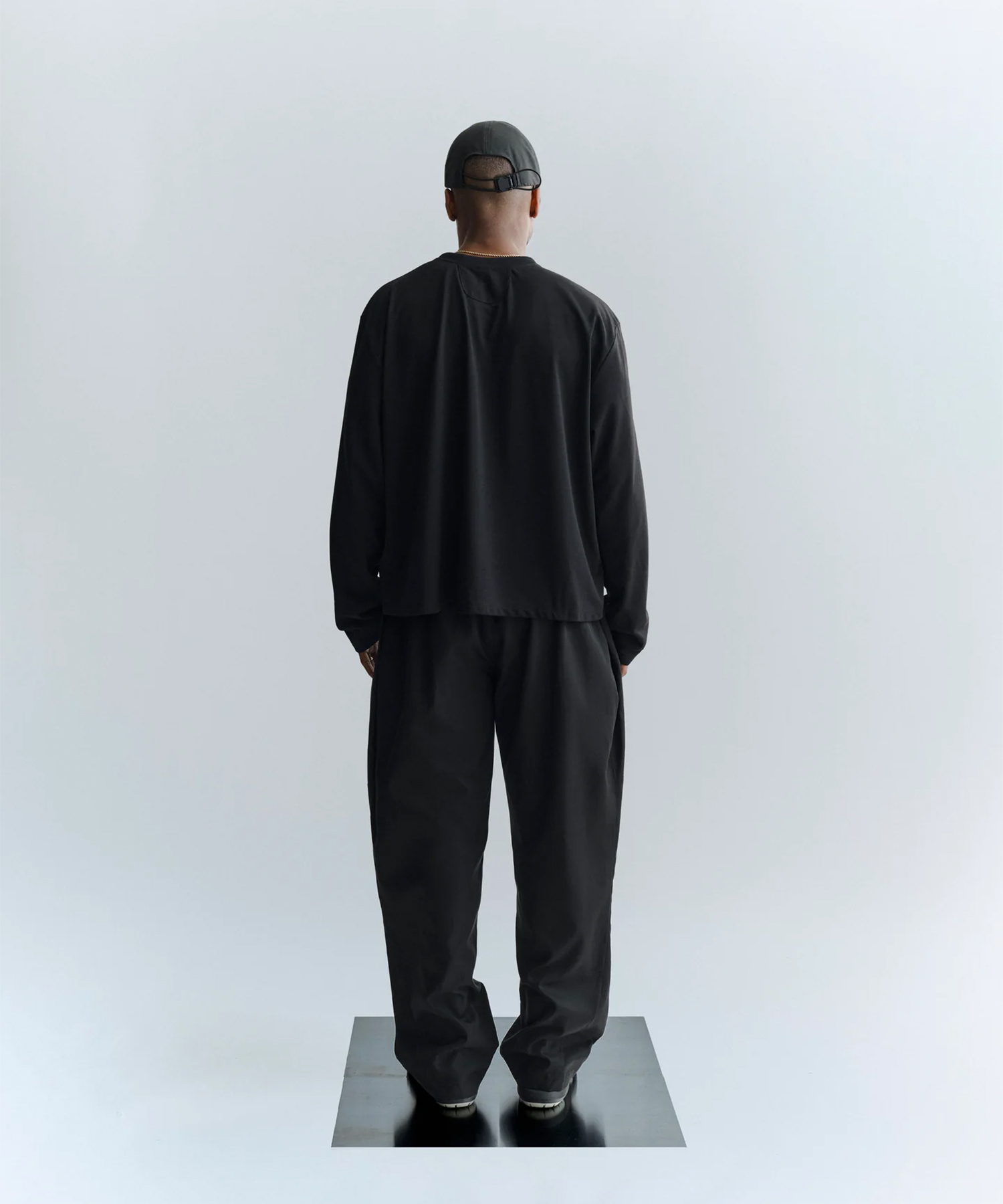 帯電防止機能を備えたポリエステルストレッチツイル素材を使用し、自然なストレッチ性とともにリラックス感のあるワイドレッグシルエットに仕上げたスタンダードパンツ。アーティキュレートされた膝構造と戦略的に配置されたプリーツにより、立体的なシルエットと快適な可動性を実現しています。