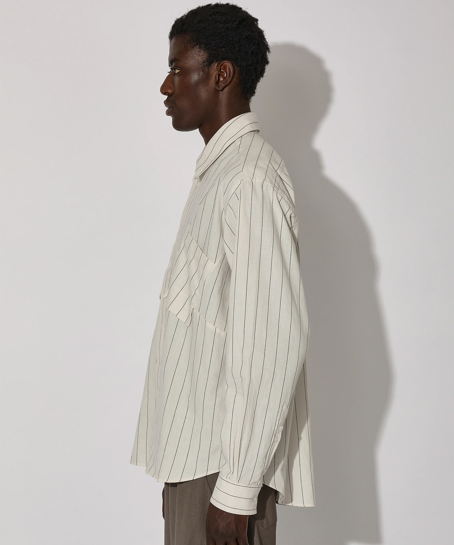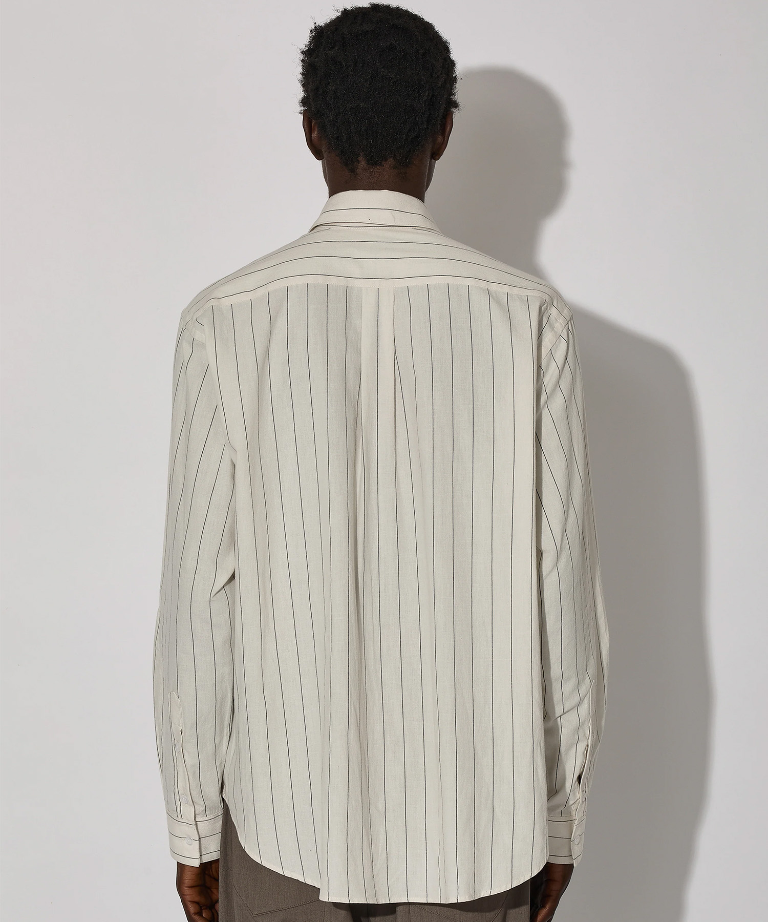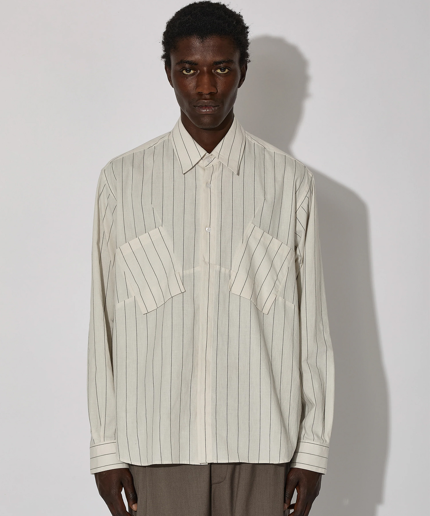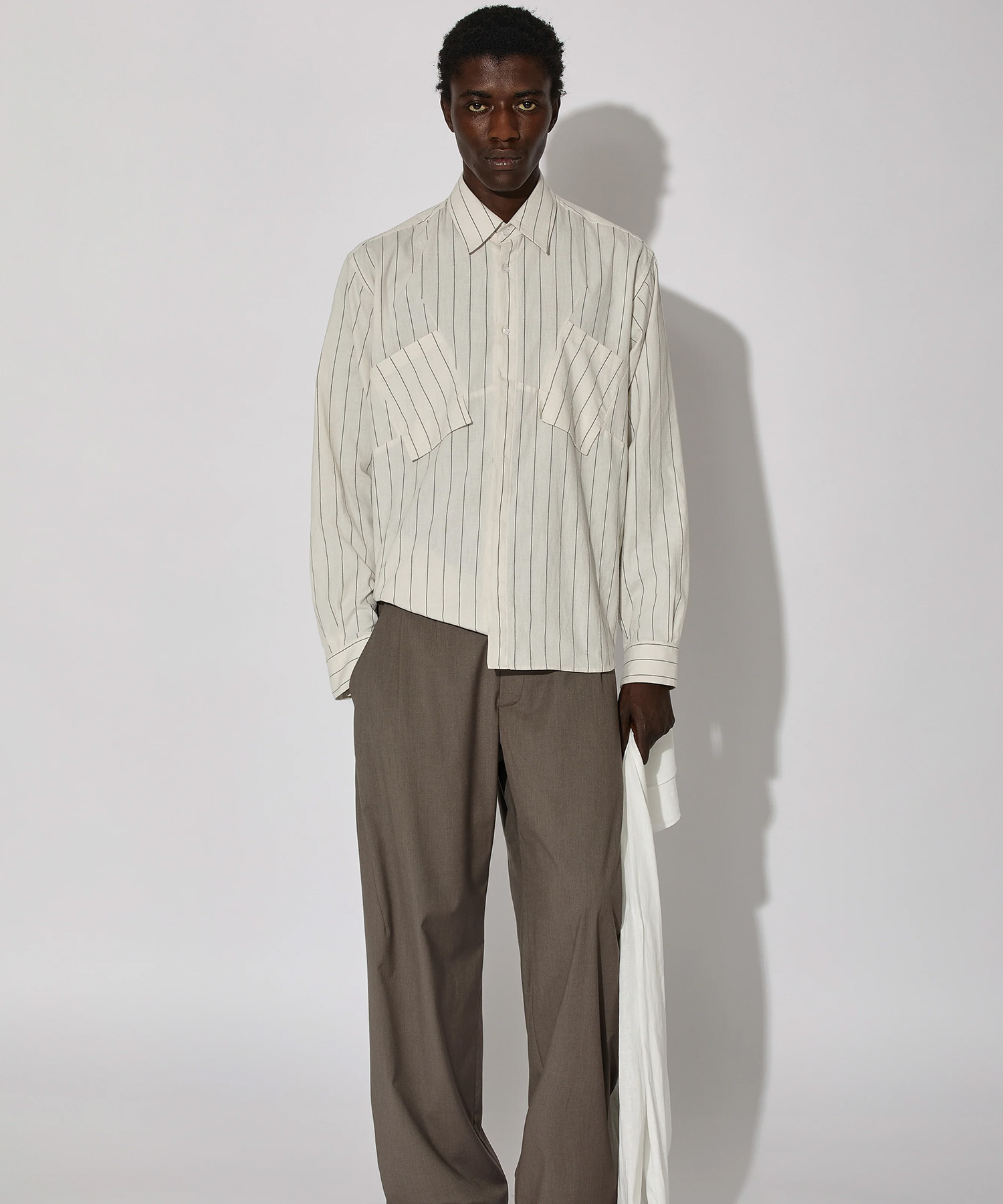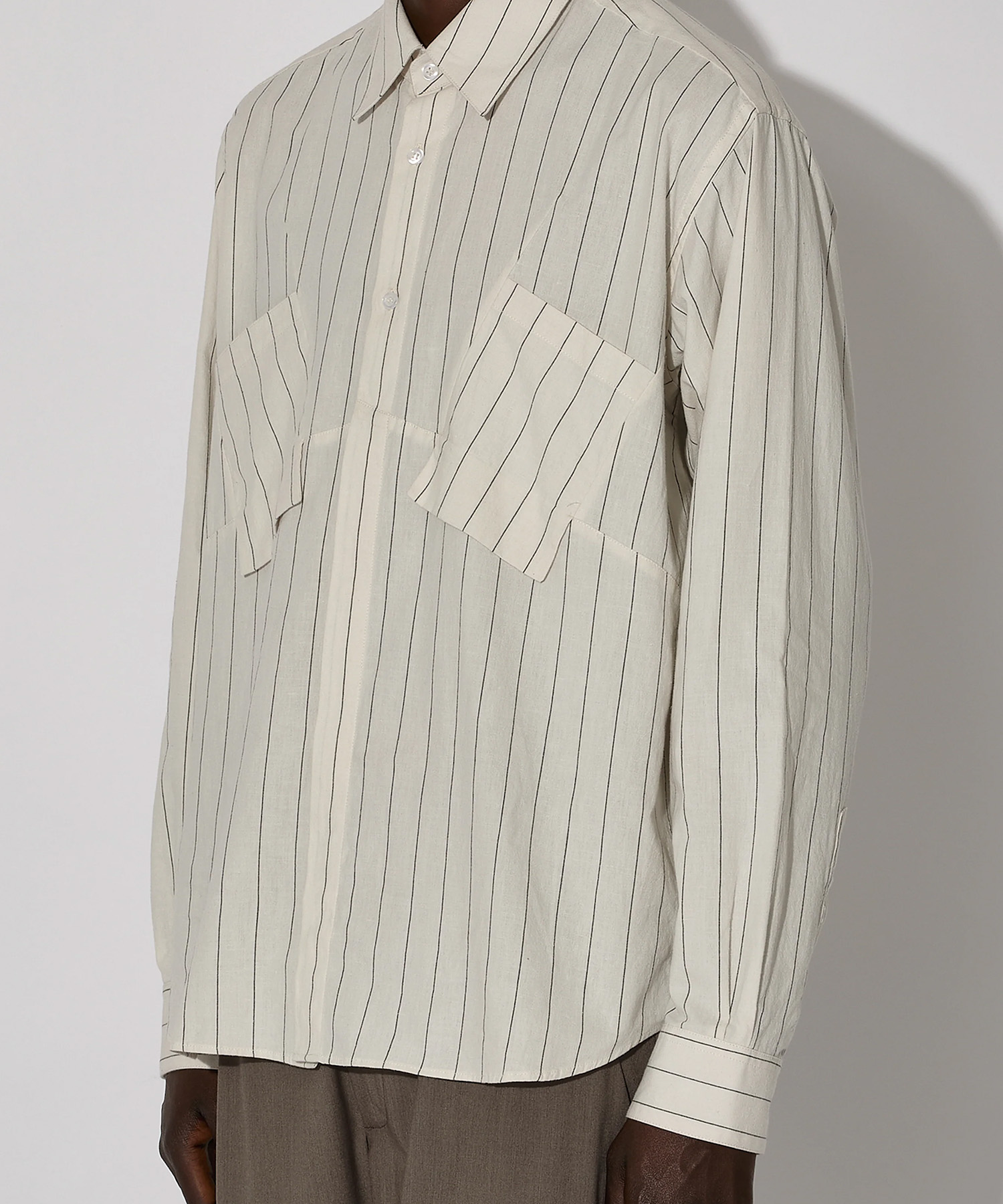 ストライプ柄とオールブラックのバリエーションで展開されるピエックシャツは、斜めに配されたヨークの上にダーツ入りポケットを重ねることで、ミニマルなシルエットにさりげない構造的な緊張感をもたらしています。