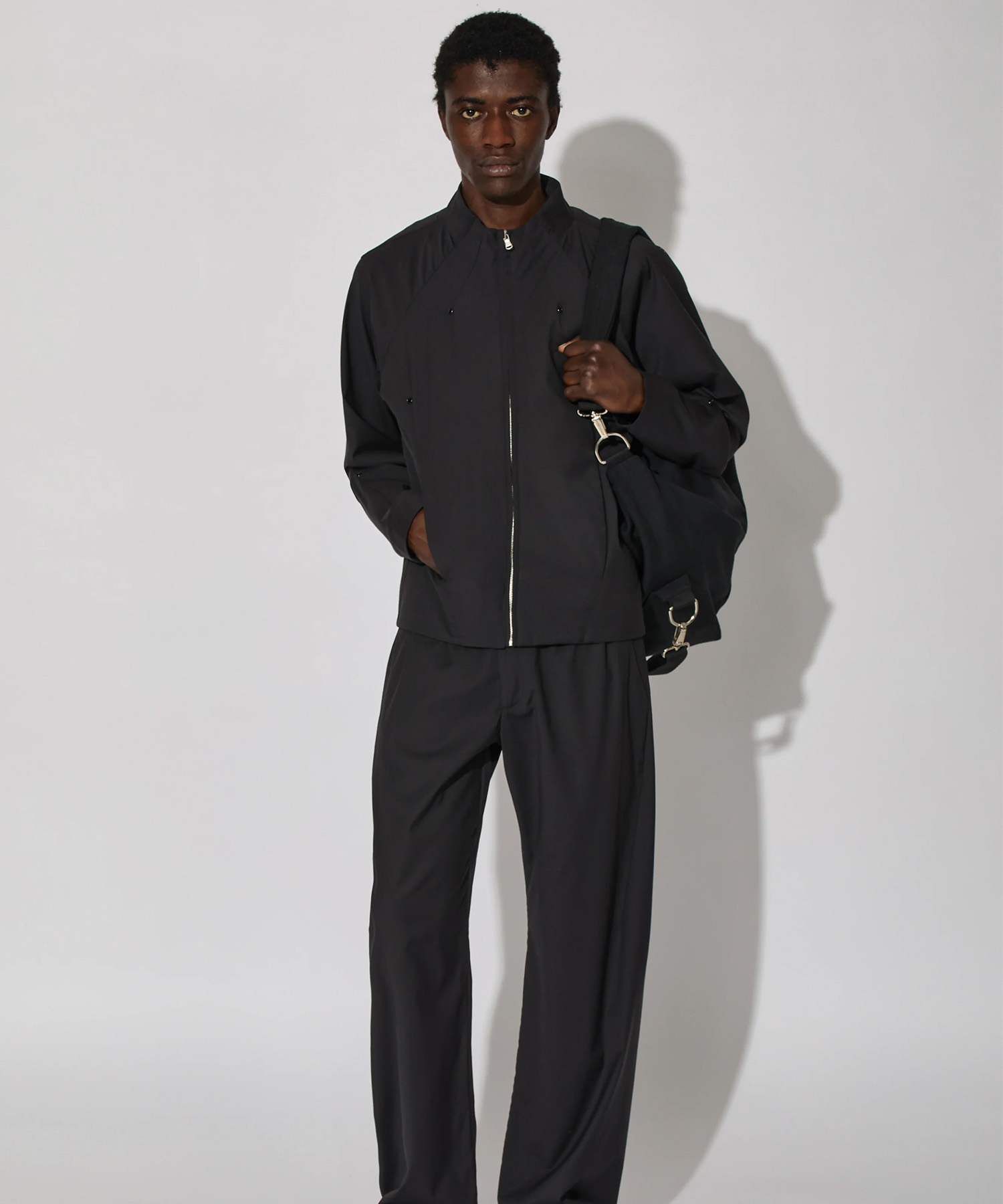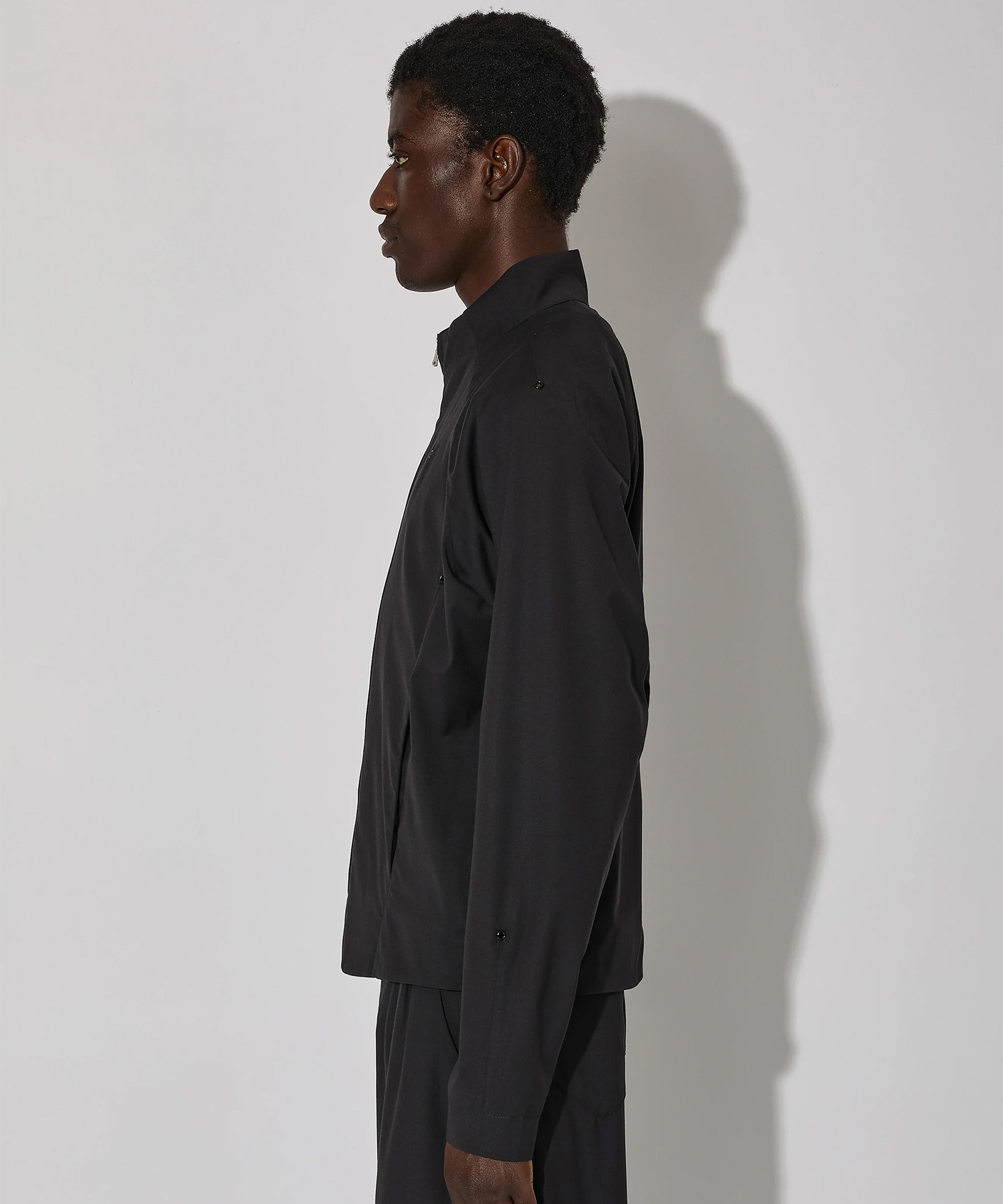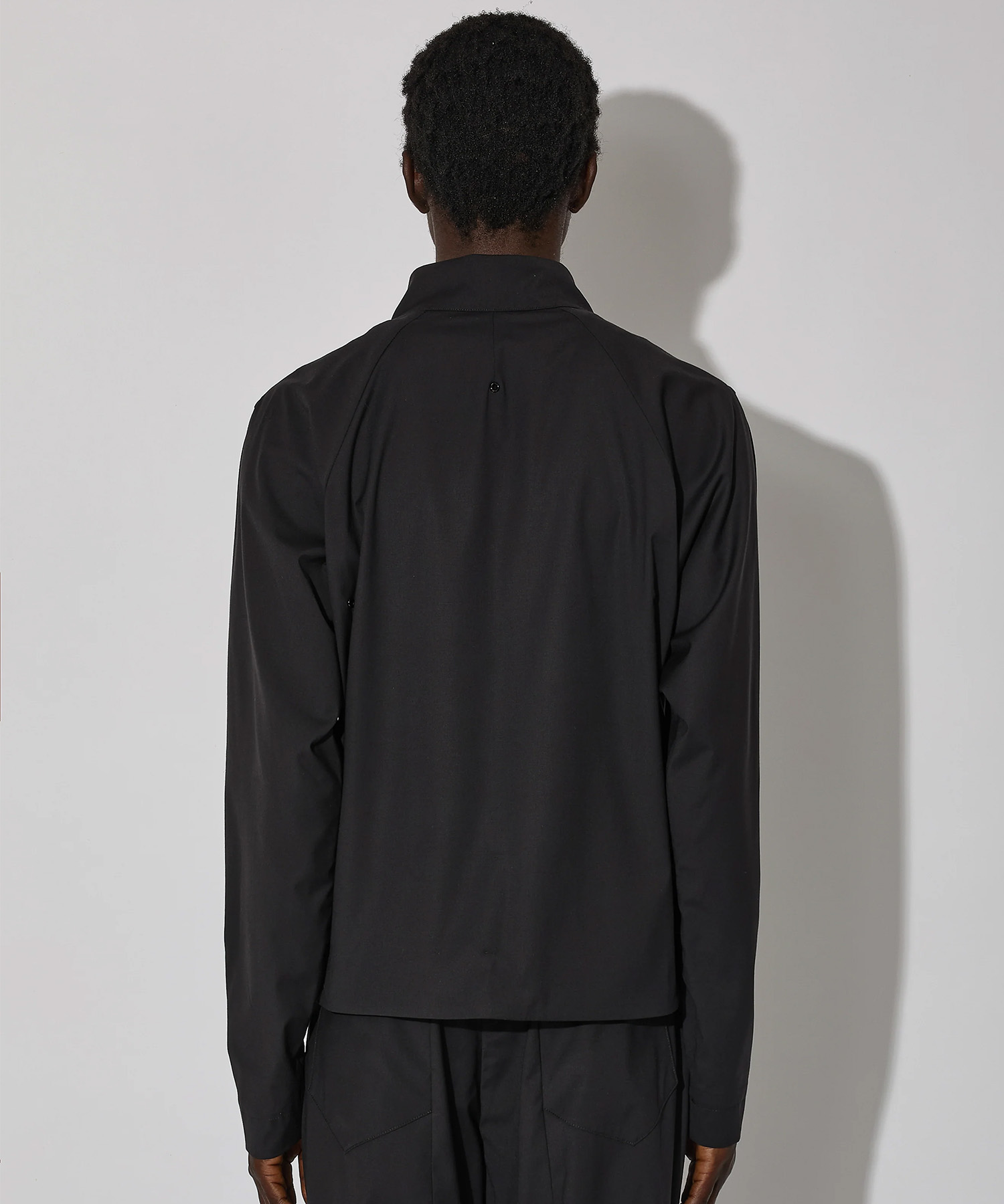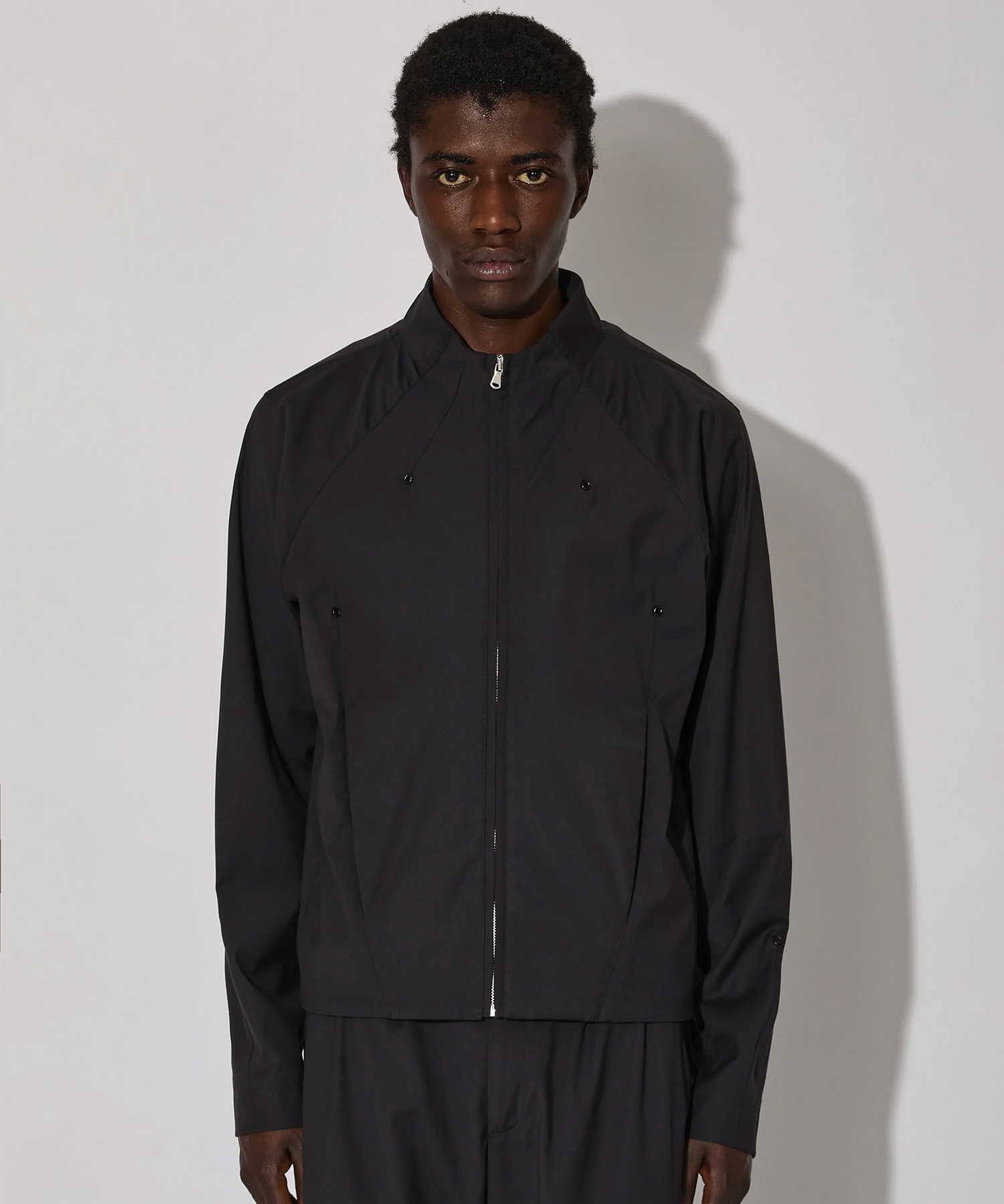 フロントのダーツはサイドエントリーポケットをさりげなく隠し、ジャケット全体の構造的な明快さを強調しています。