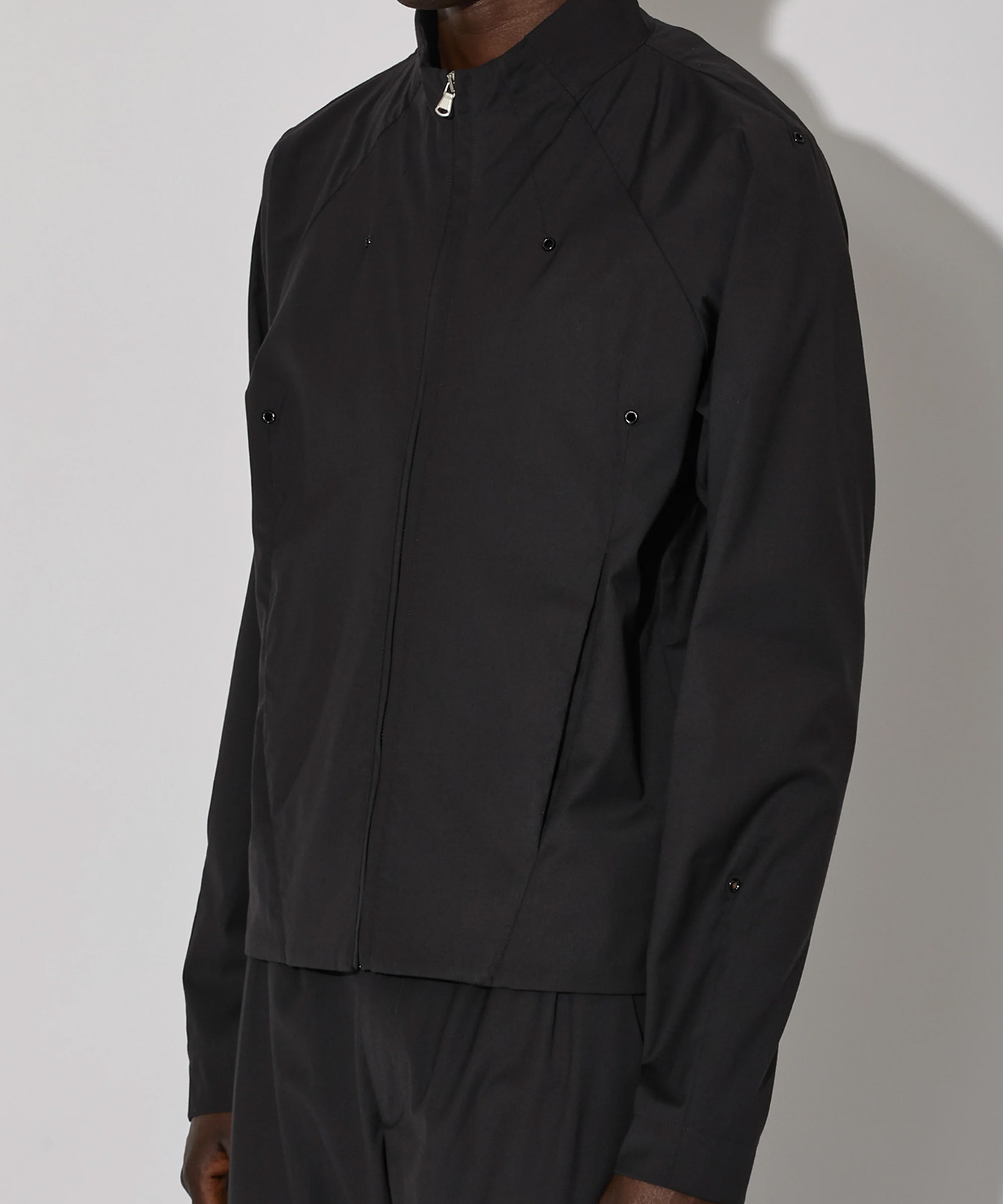 J.L-A.Lの代表的なシルエットを進化させたミトレジャケットは、ハリのあるポリエステル素材で仕立てられ、正確なダーツワークによって立体感を表現。各ダーツにはシングルアイレットが施されています。