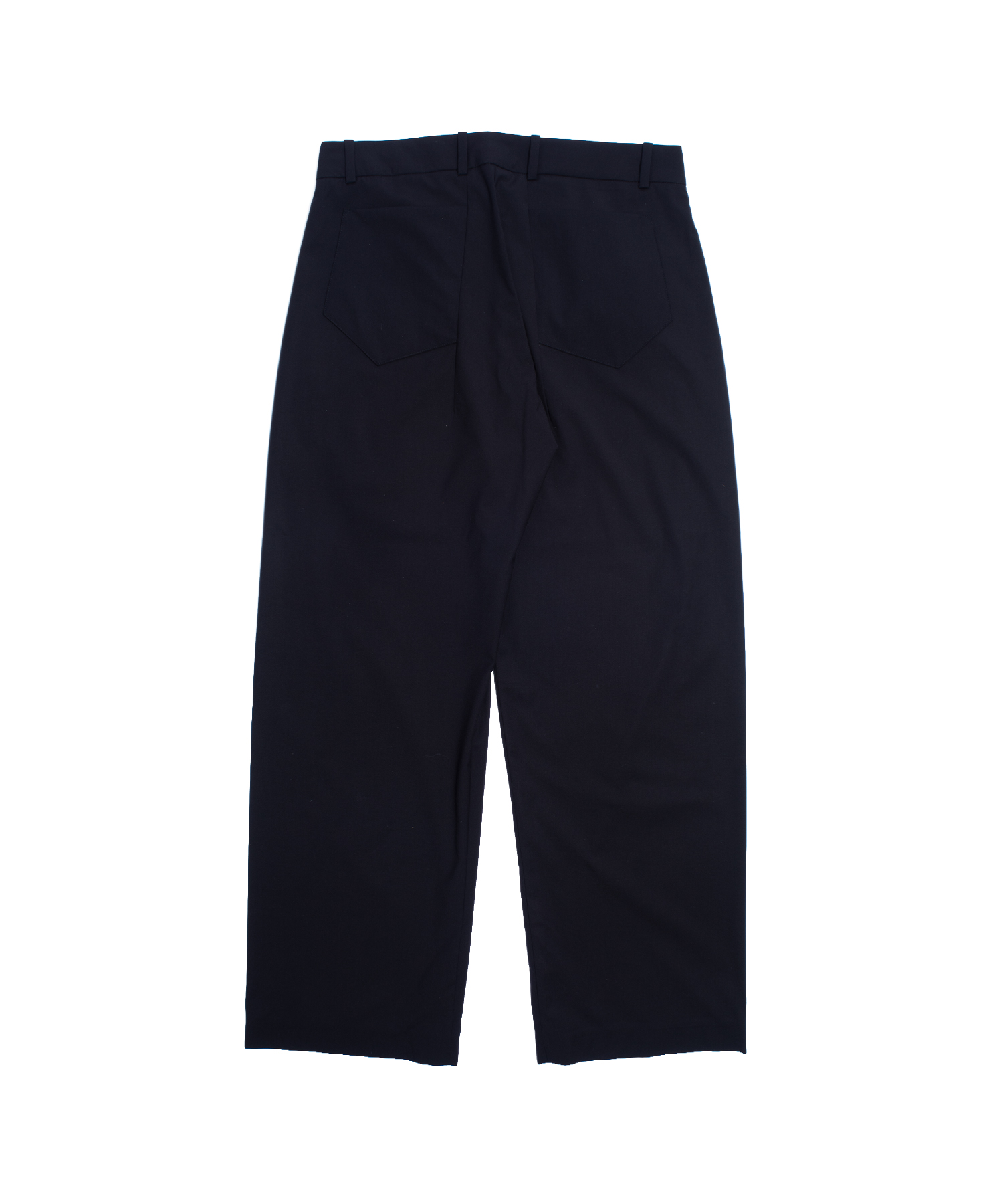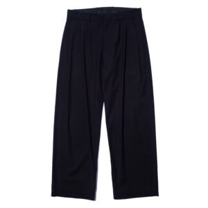 ハリのあるポリエステル素材で仕立てられたミトレトラウザーズは、フロントに2本のタックを配し、従来のサイドシームの代わりにダーツを用いた一体型レッグ構造を採用しています。