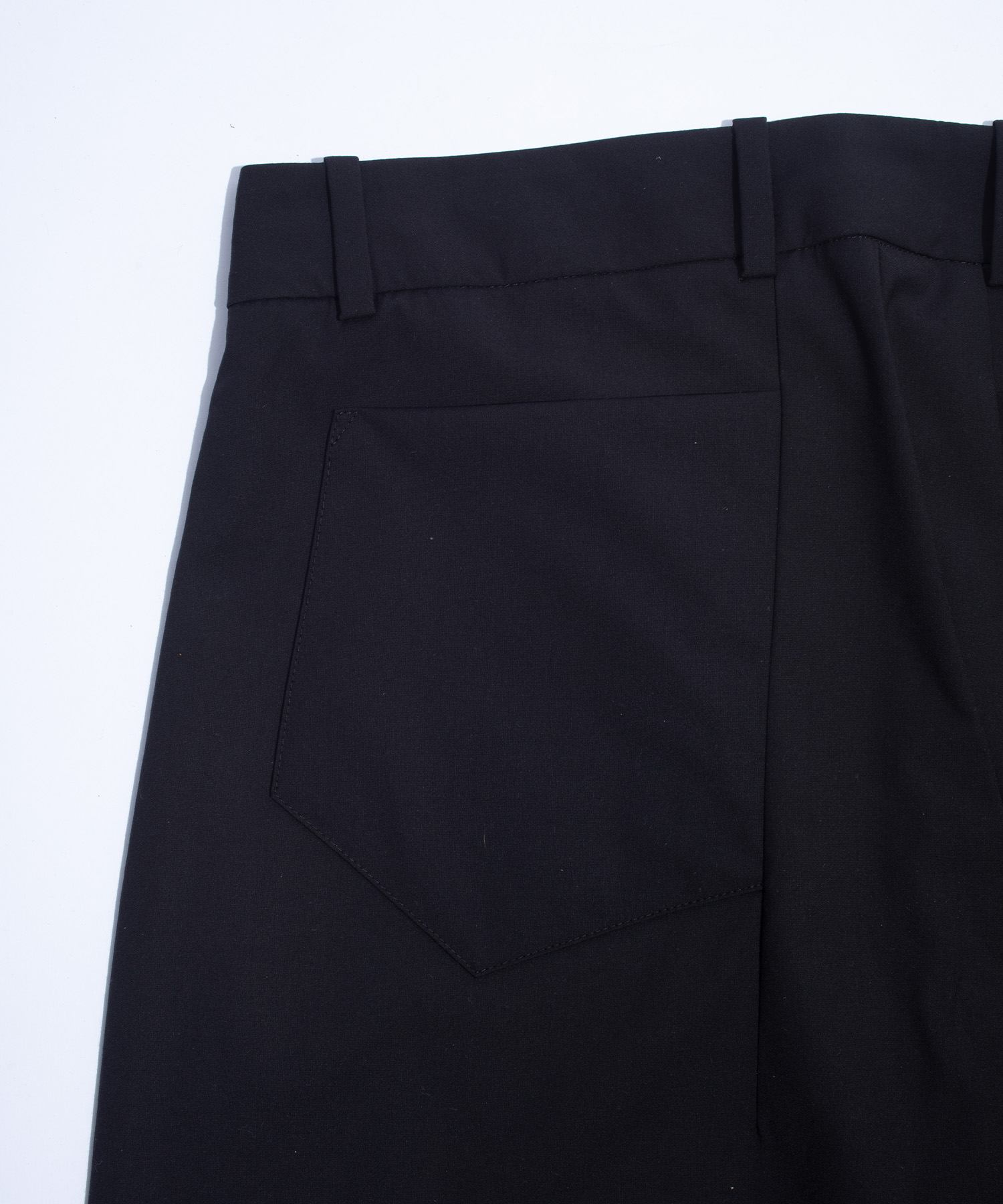 サイドエントリーポケットはシームレスに溶け込み、バックポケットは内側のダーツに沿ってテーパードさせることで、精密に計算された立体的なシルエットを実現しています。