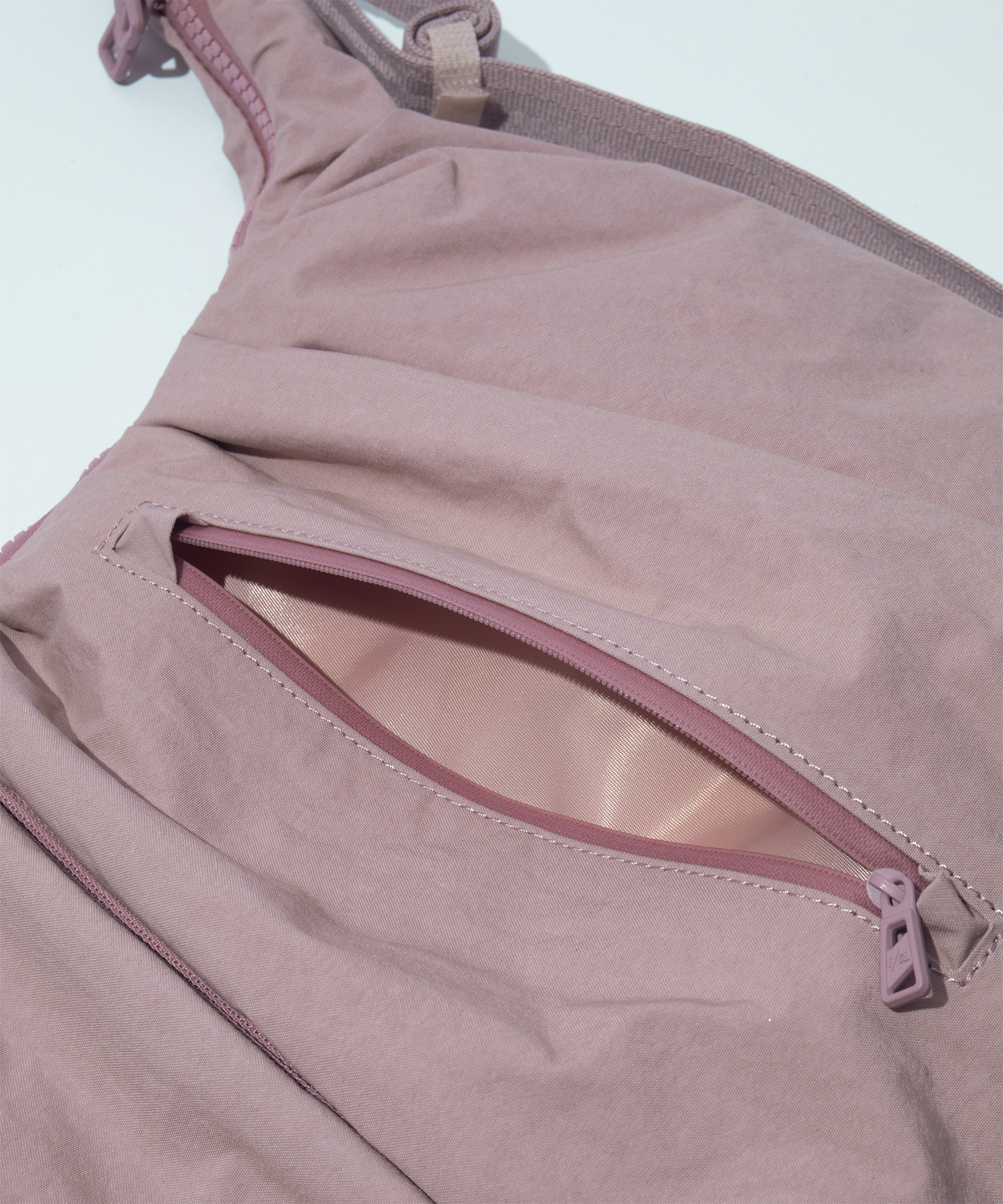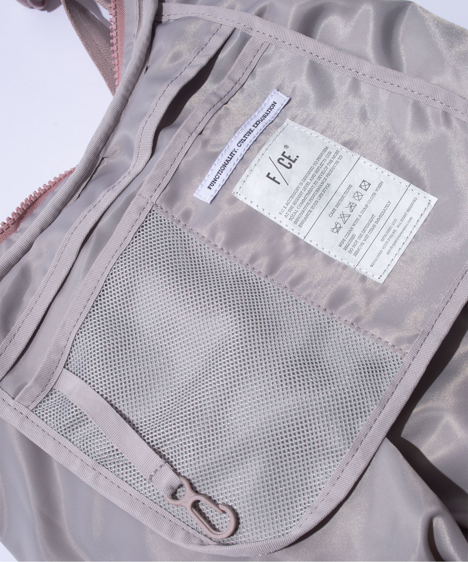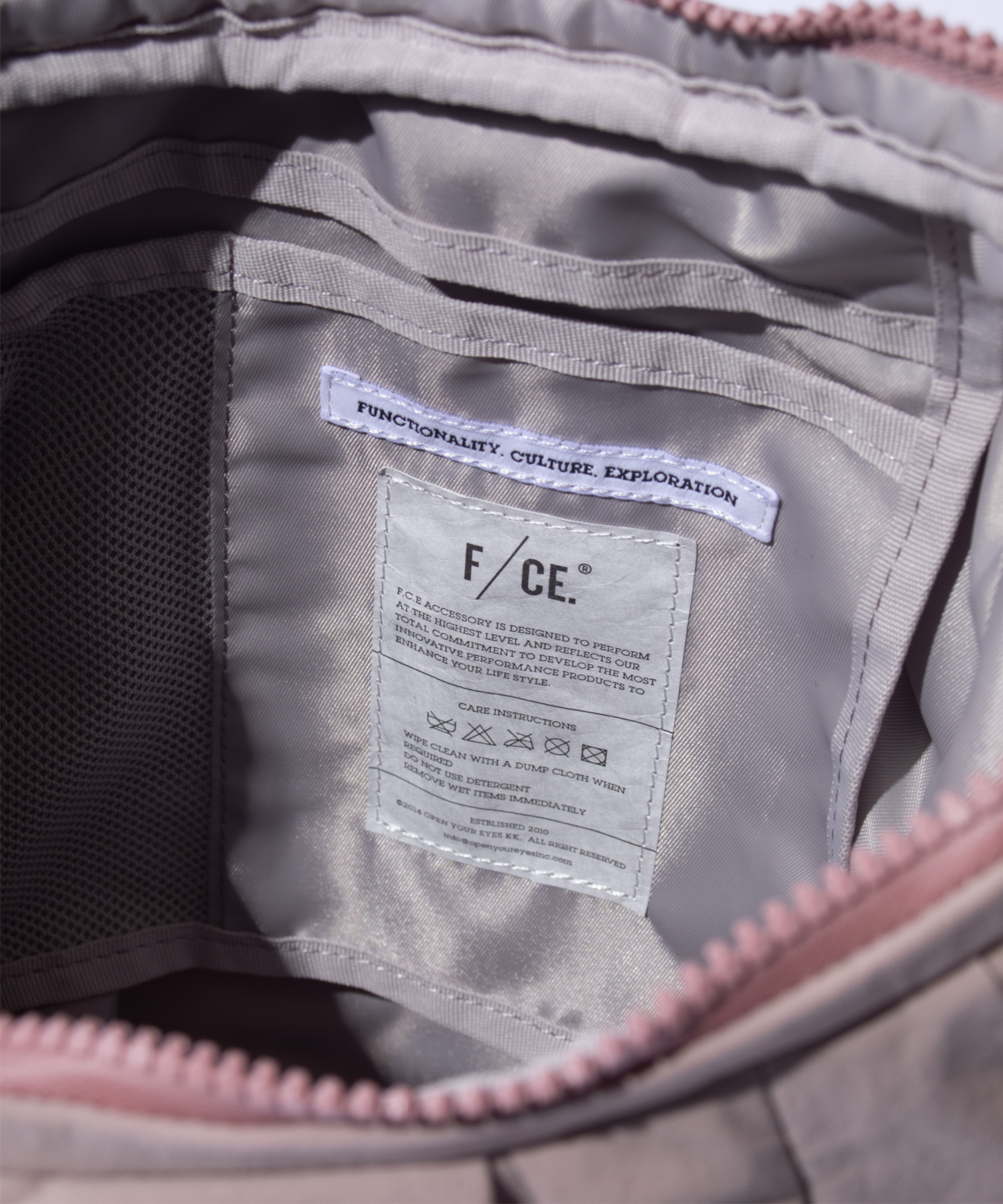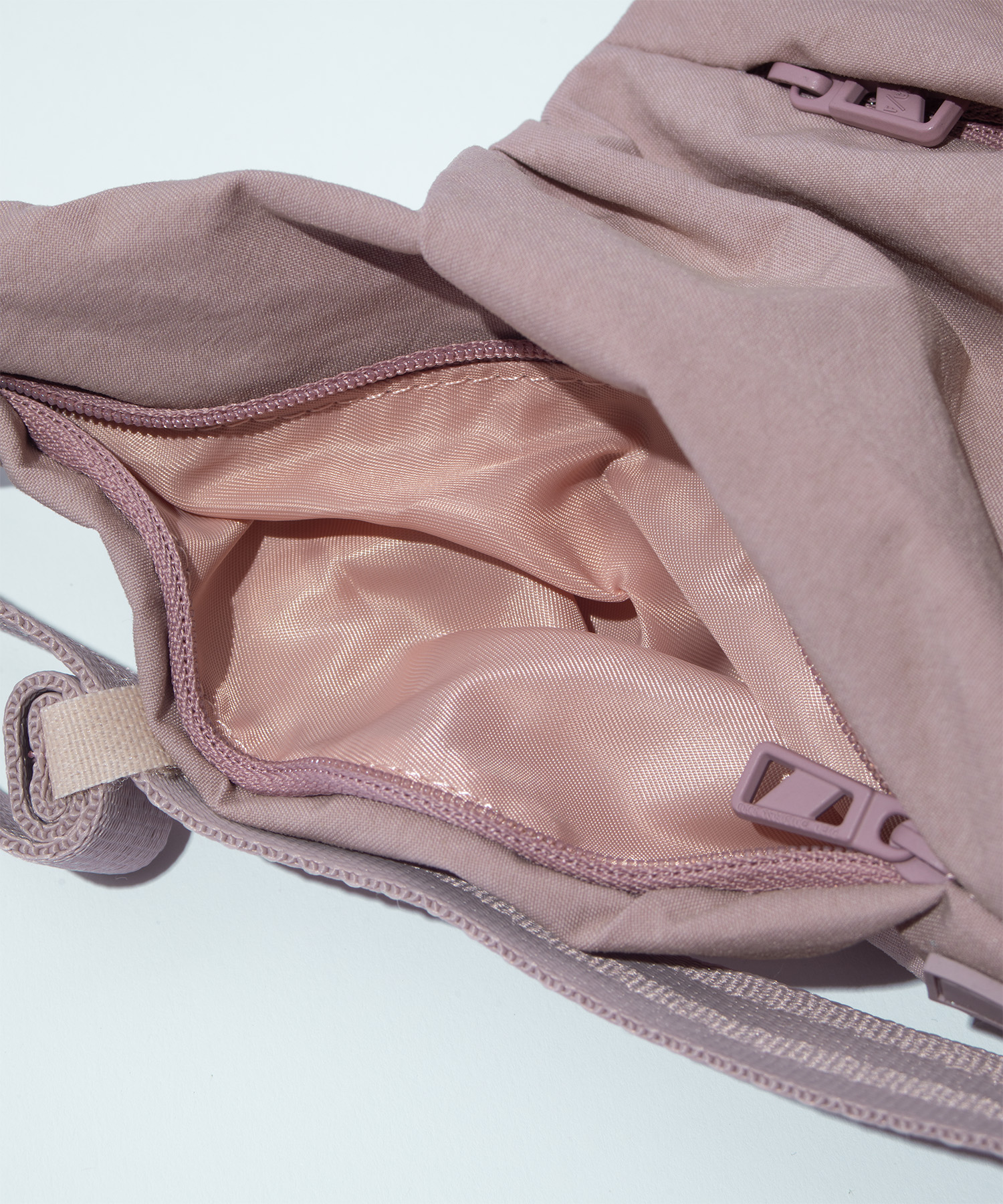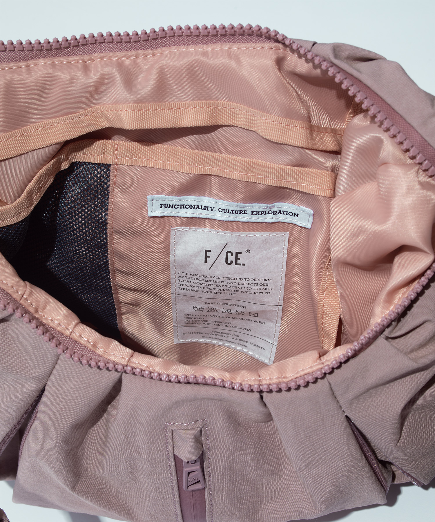 フロントのジップを開くとマチが現れ、フォルムが立体的に変化するユニークな設計です。