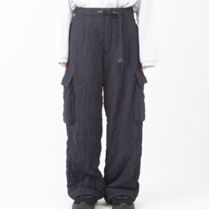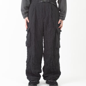 新素材として提案するキャッチワッシャーという特殊加工を施した半永久的に皴化工が楽しめるハイスペックなミリタリーパンツ。中綿には軽量かつ高い保温性を持つ**Primaloft(プリマロフト)**を使用し、暖かさと軽やかさを両立。表地にはポリエステル生地を櫛毛引き加工し、ウールに近い質感と上品な仕上がりを実現。