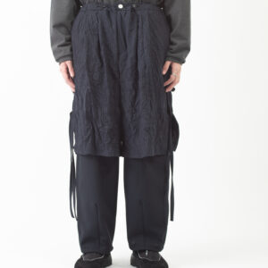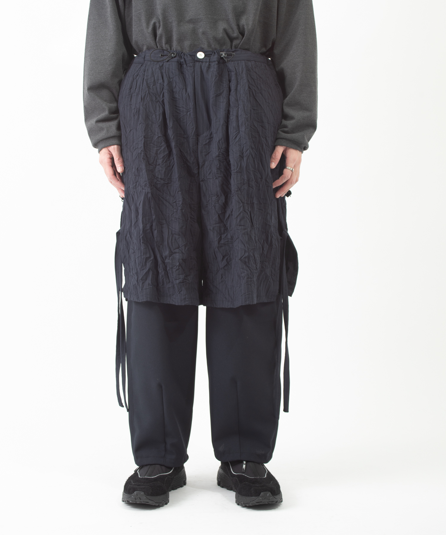 ワッシャー加工された生地とシャリ感のある生地を組み合わせたレイヤード風パンツ。