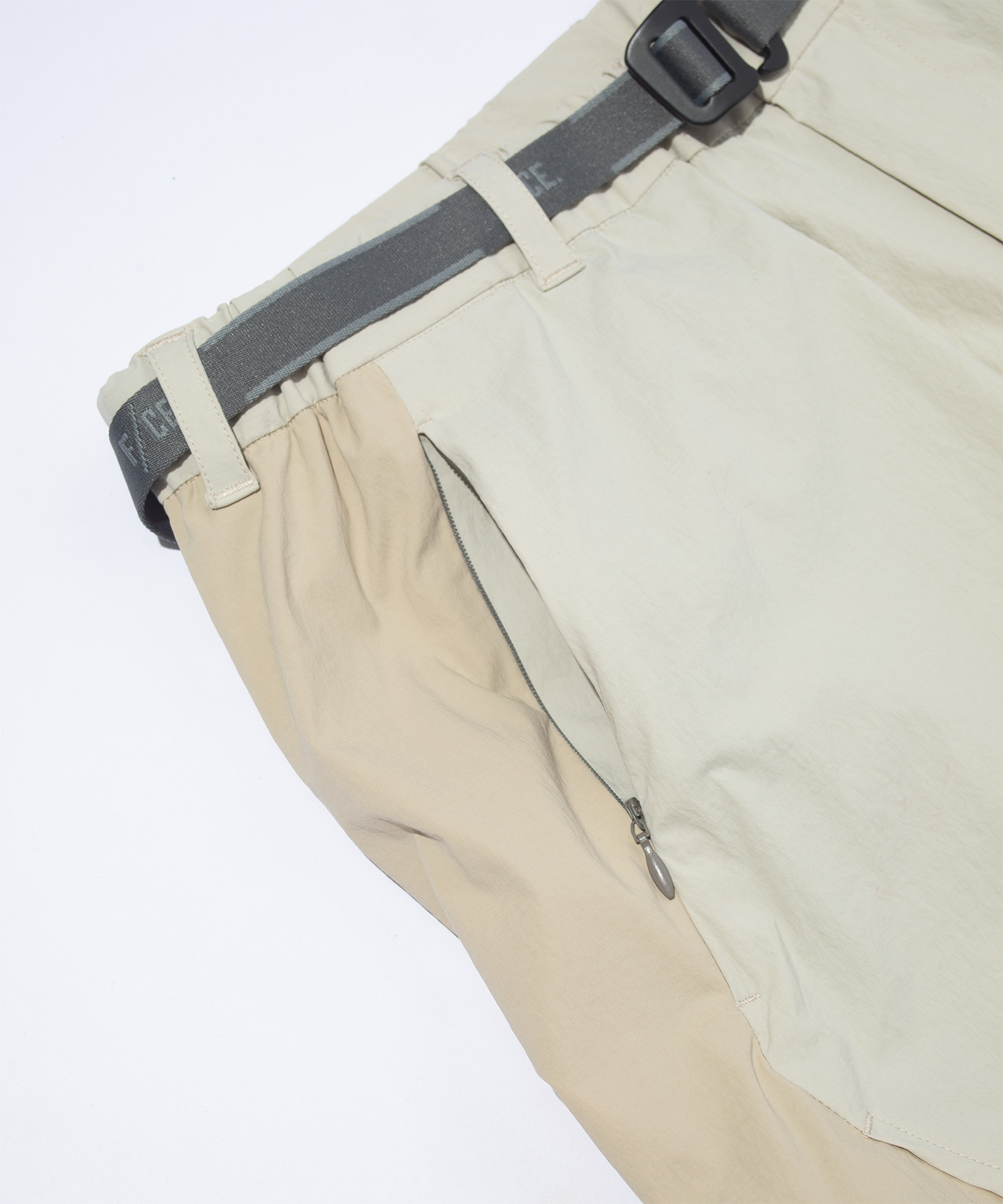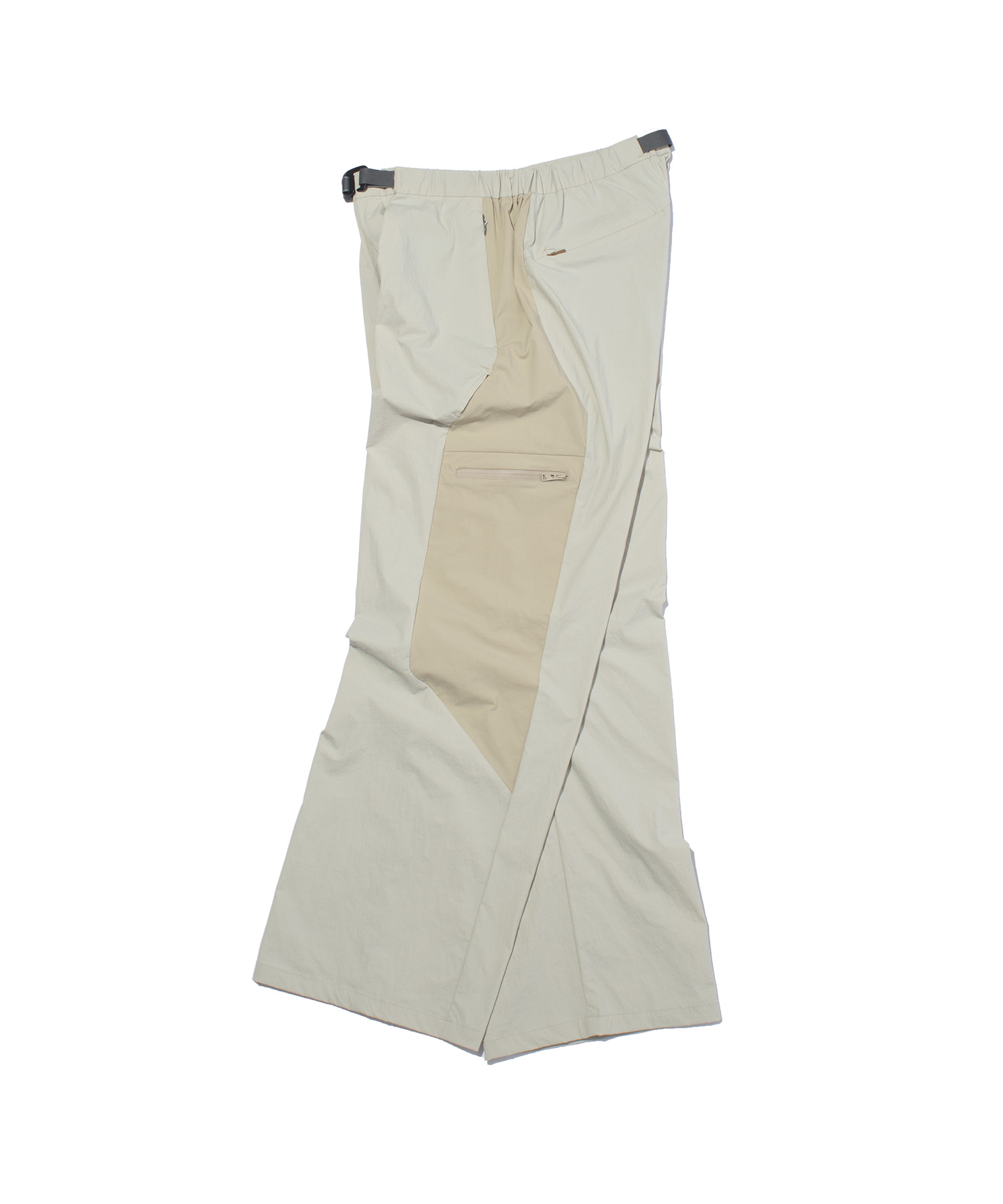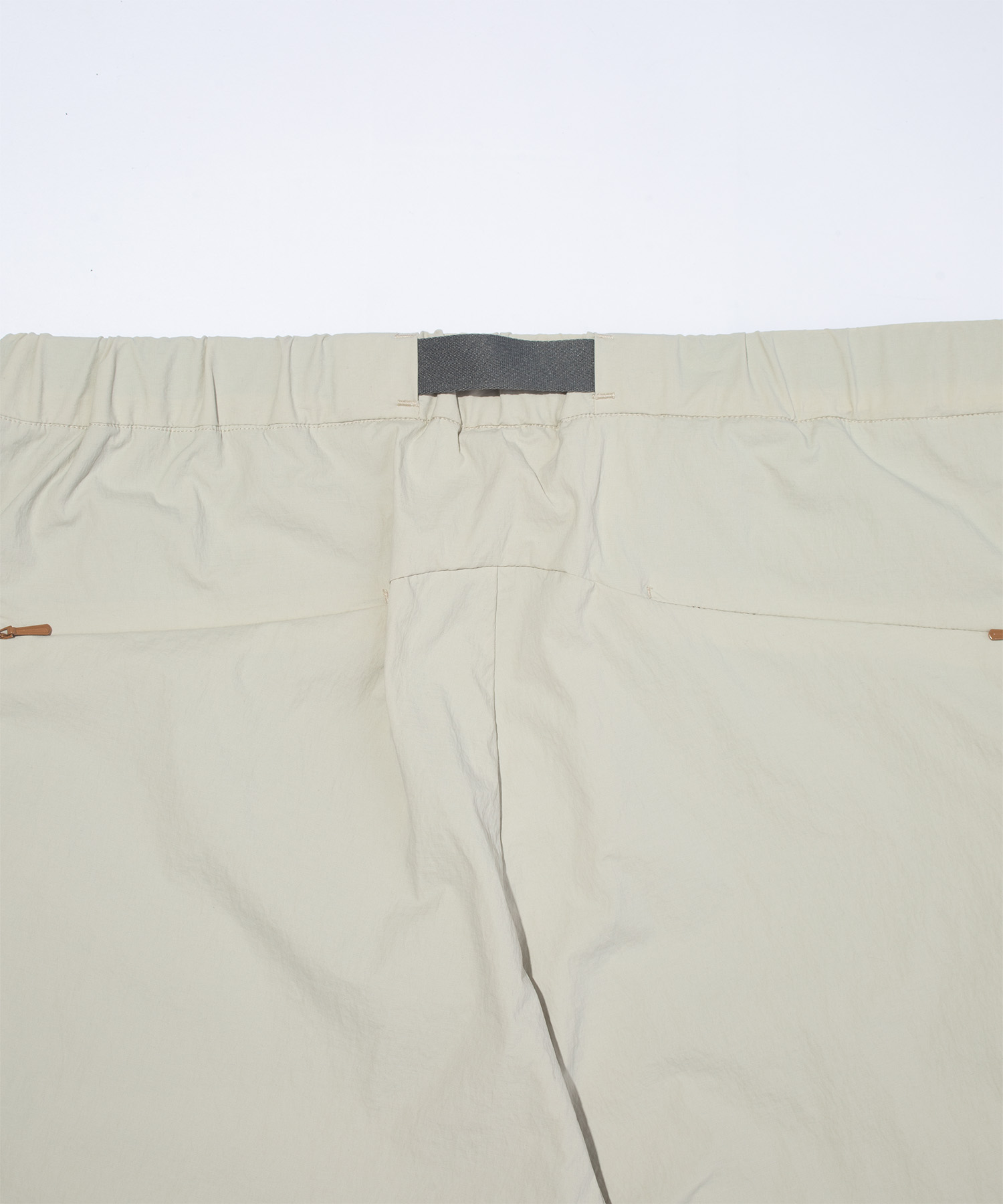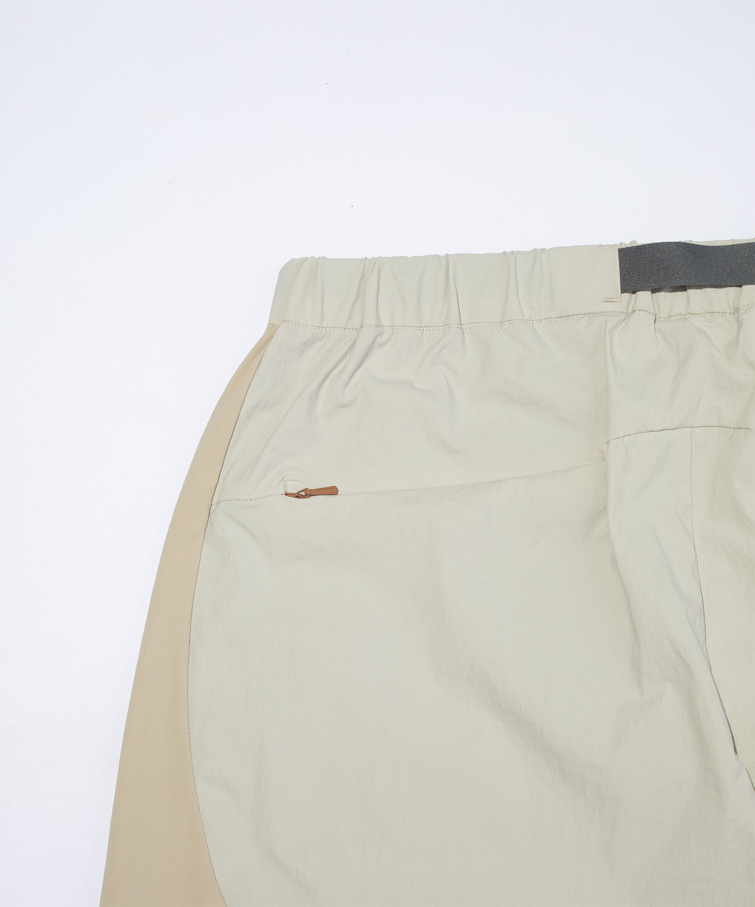 ミニマルな印象を損なうことなく収納力を持たせるため、 コンシールファスナーポケットを配置。 ウエストは内蔵ベルトでフィット感の調整が可能です。