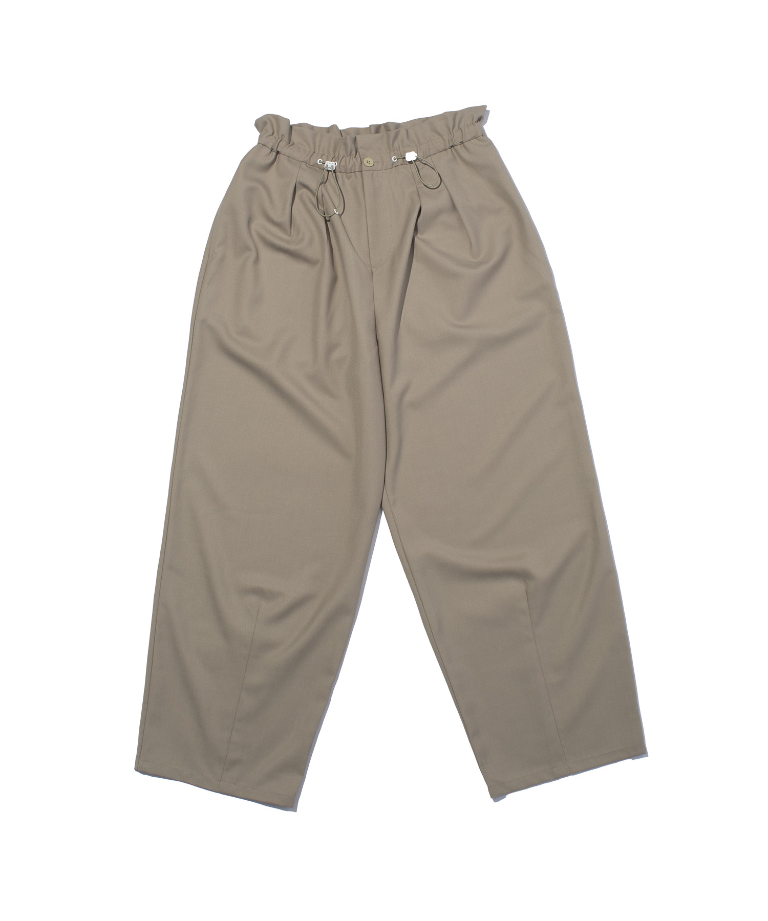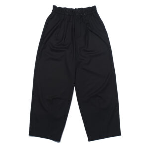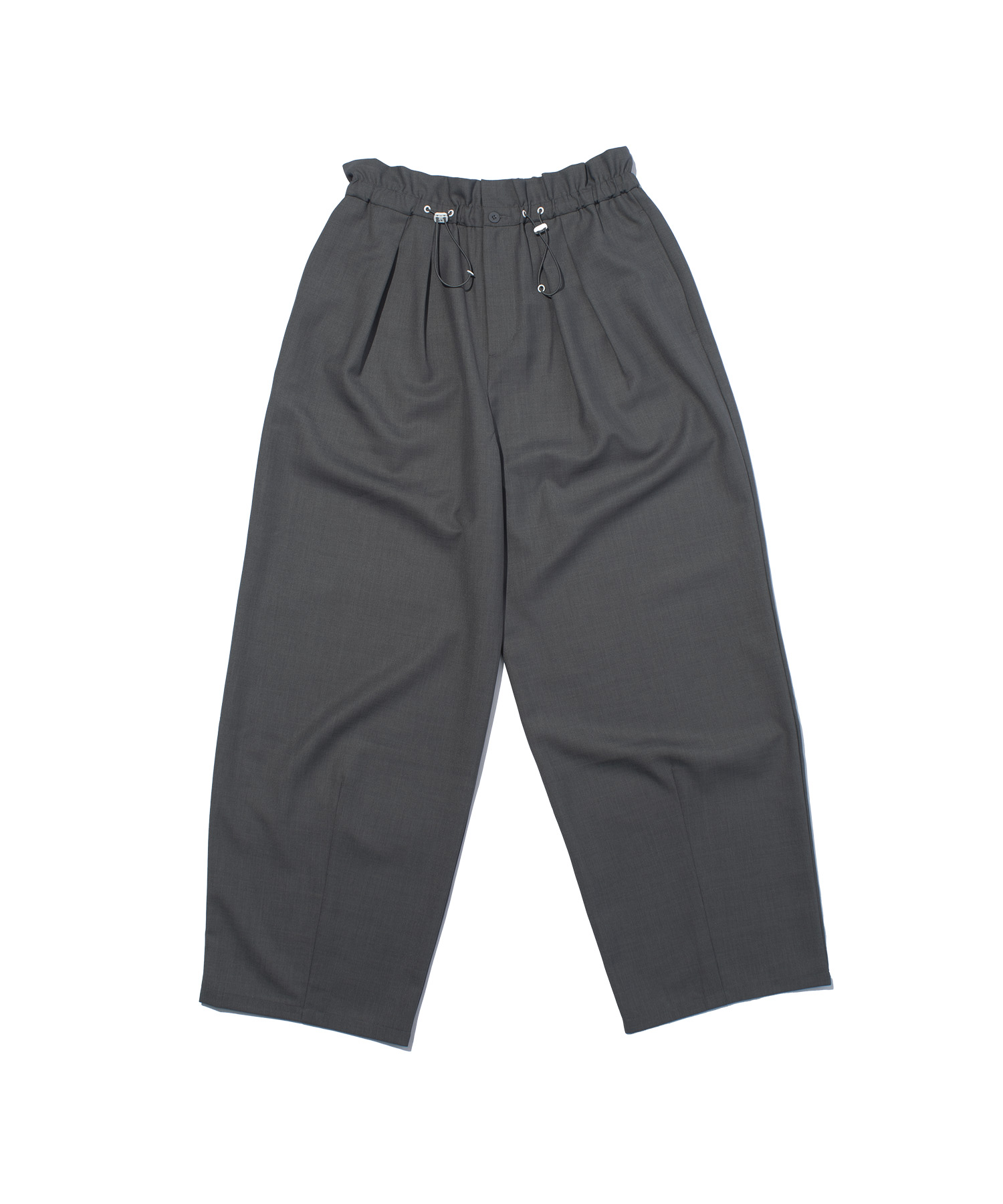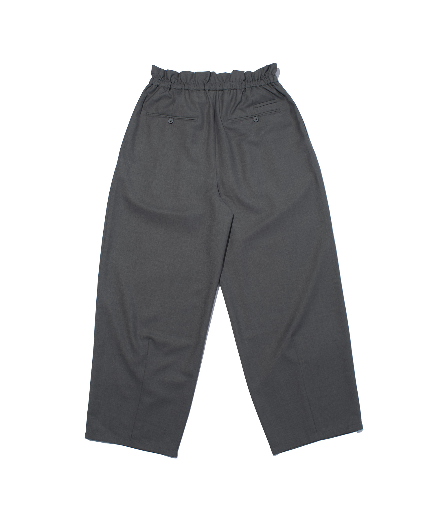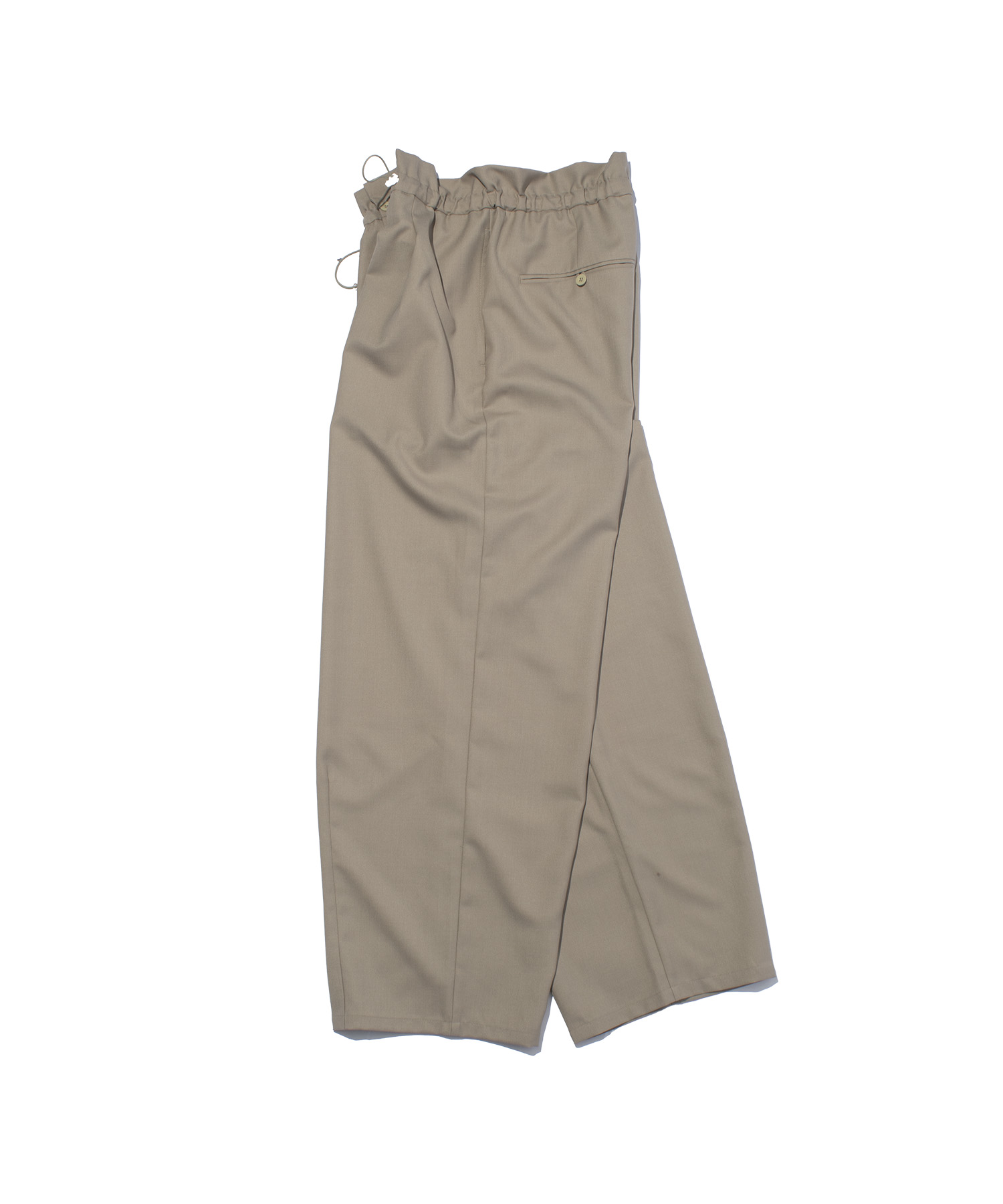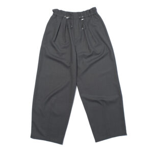 170デニールのポリエステル糸を追撚し、ウールのような風合いに仕上げた梳毛調ファブリックを使用した、軽量でドレープ感のあるハイウエストワイドパンツ。