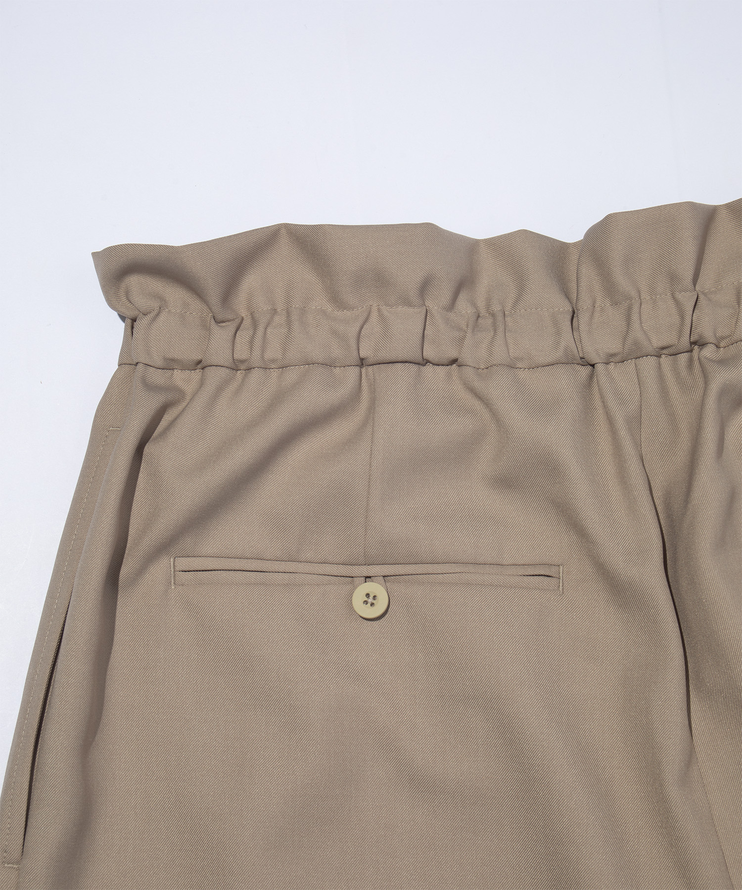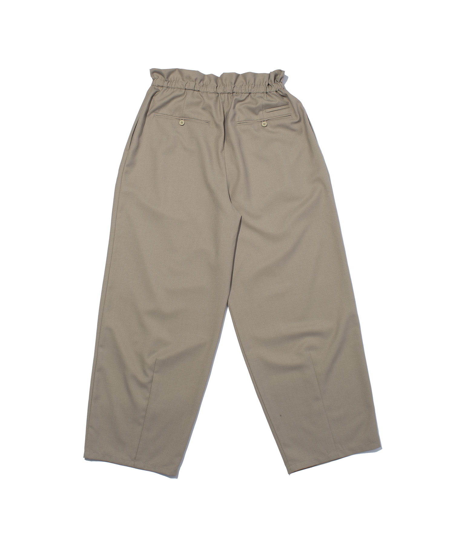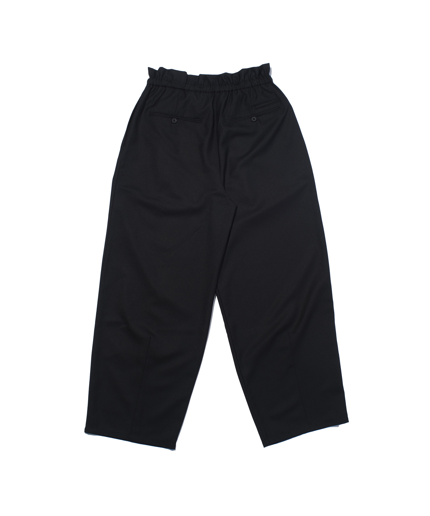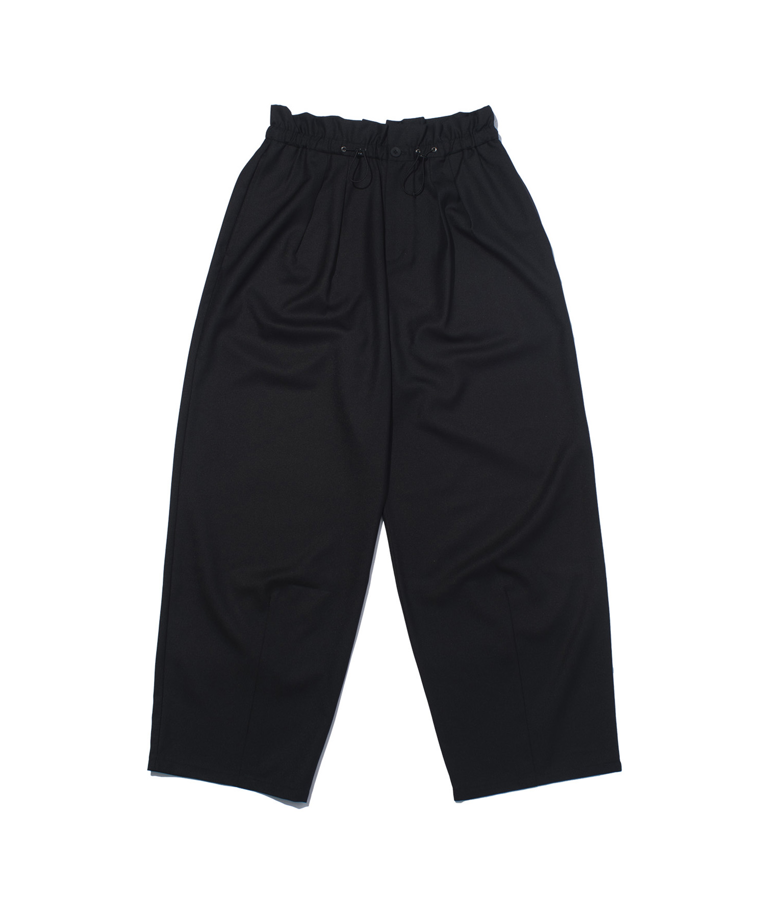 170デニールのポリエステル糸を追撚し、ウールのような風合いに仕上げた梳毛調ファブリックを使用した、軽量でドレープ感のあるハイウエストワイドパンツ。