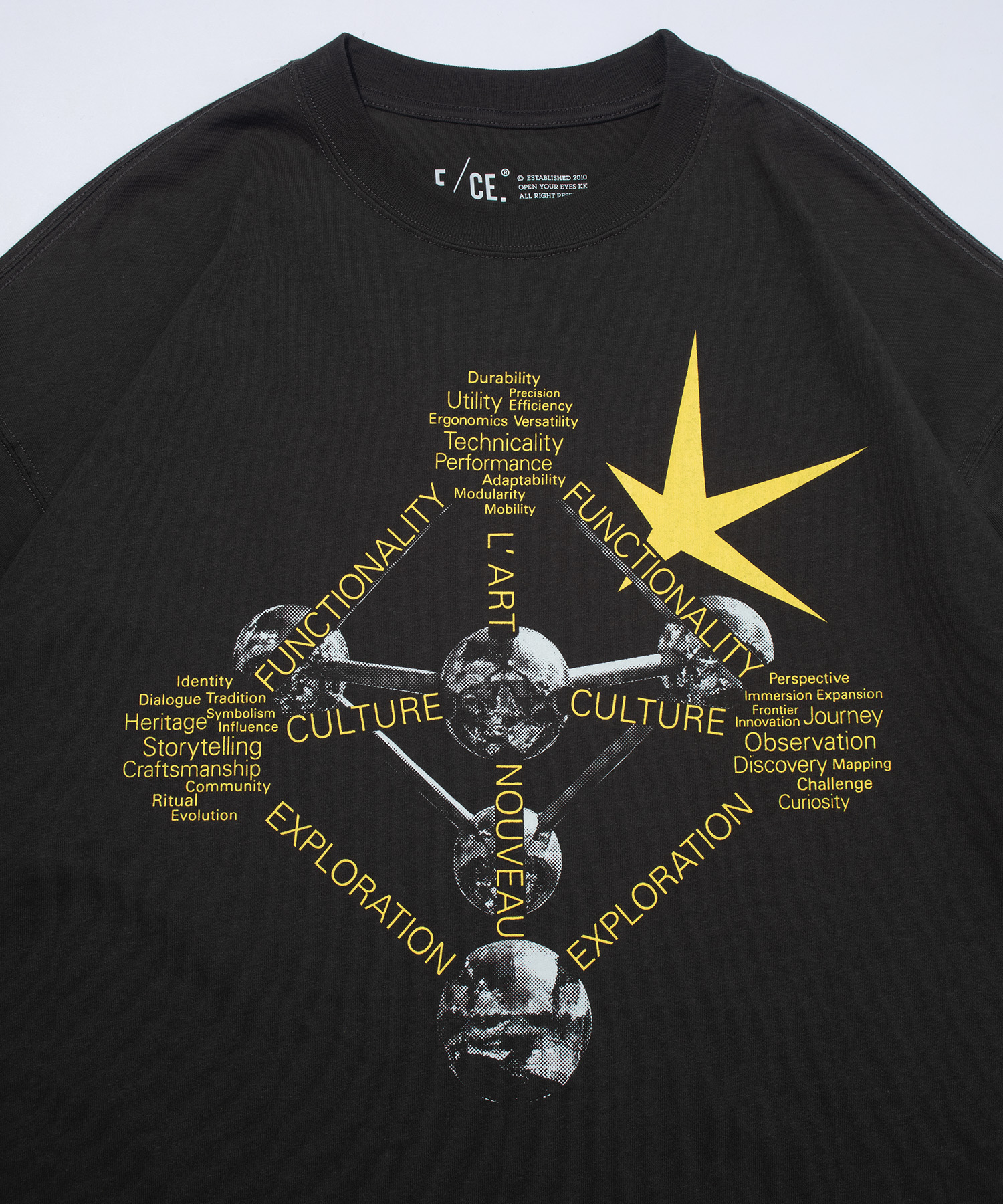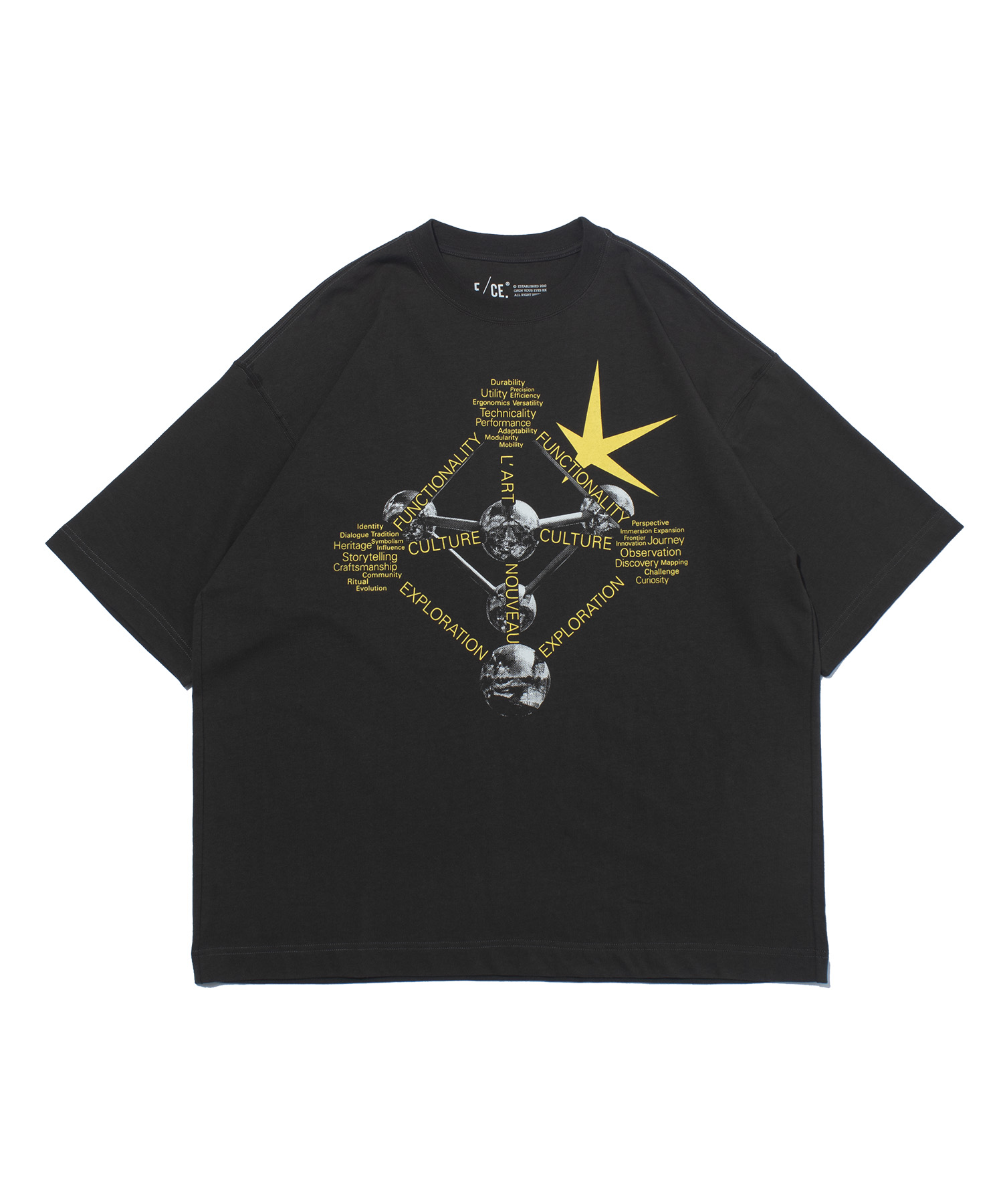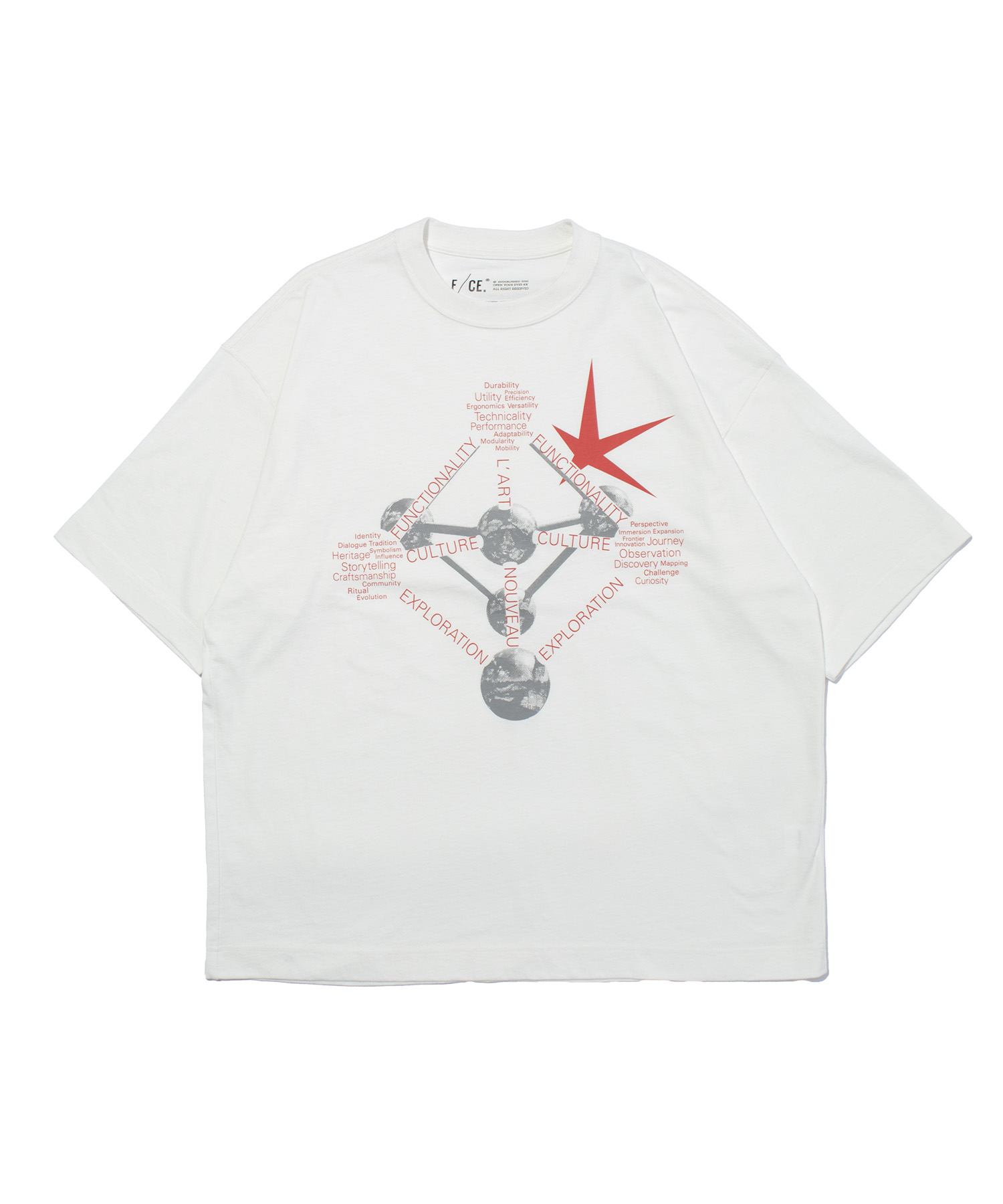 F/CE.のキーワードである “FUNCTIONALITY / CULTURE / EXPLORATION” を、分子構造のように幾何学的に配置し、ブランドの哲学を視覚化した1枚です。