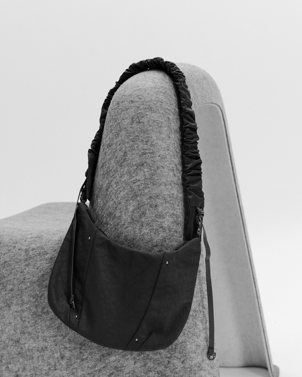 切り替え線と曲線ジップが印象的な、ミニマルかつ立体的なフォルムをもつポーチ。