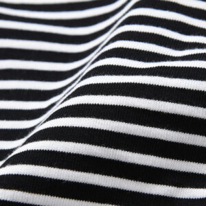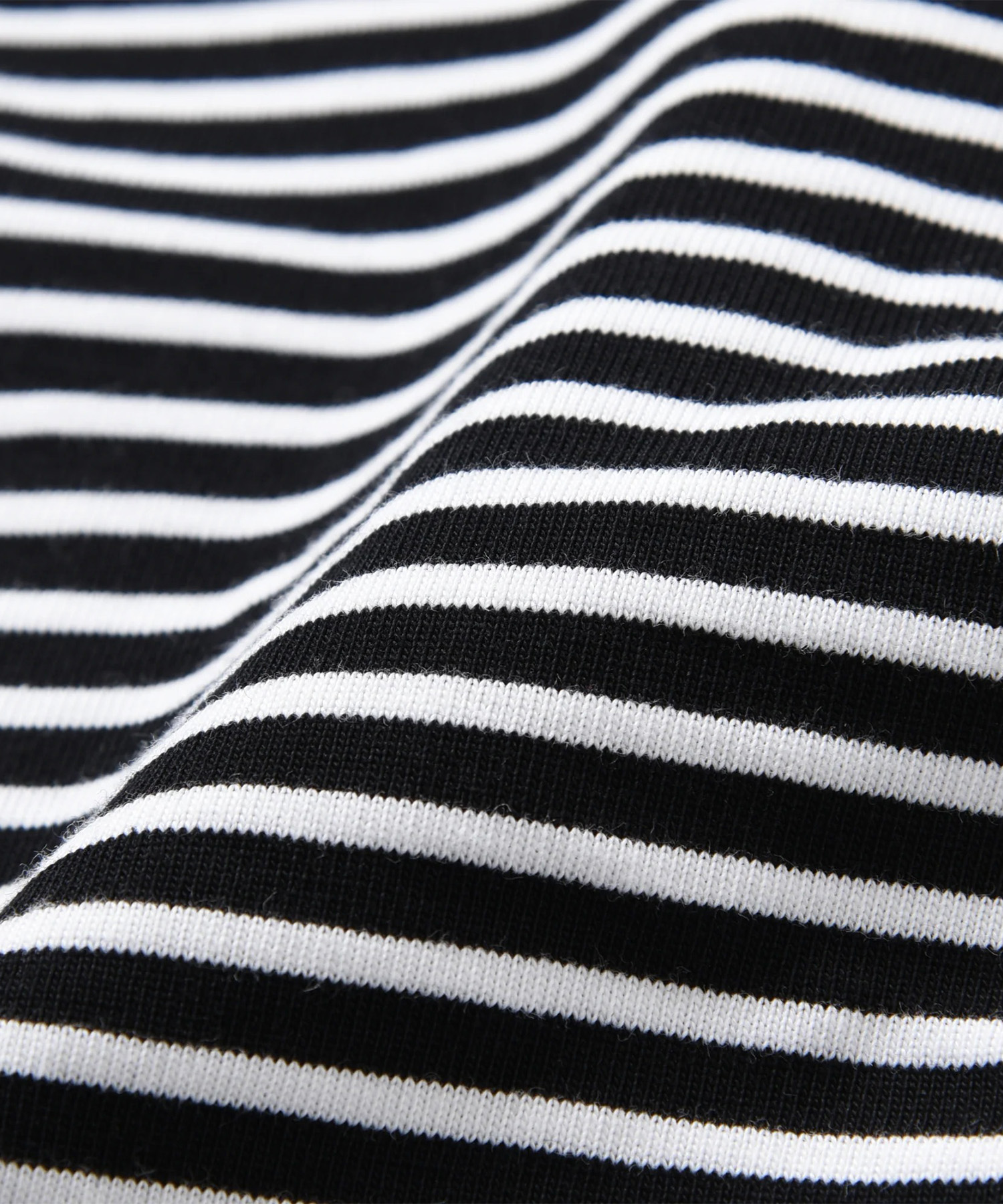 30/2 コーマ糸で編み立てた、オリジナルの細ボーダー天竺。 濃紺に杢チャコールの縞、黒にオフ白の縞の2色展開です。