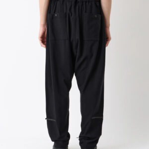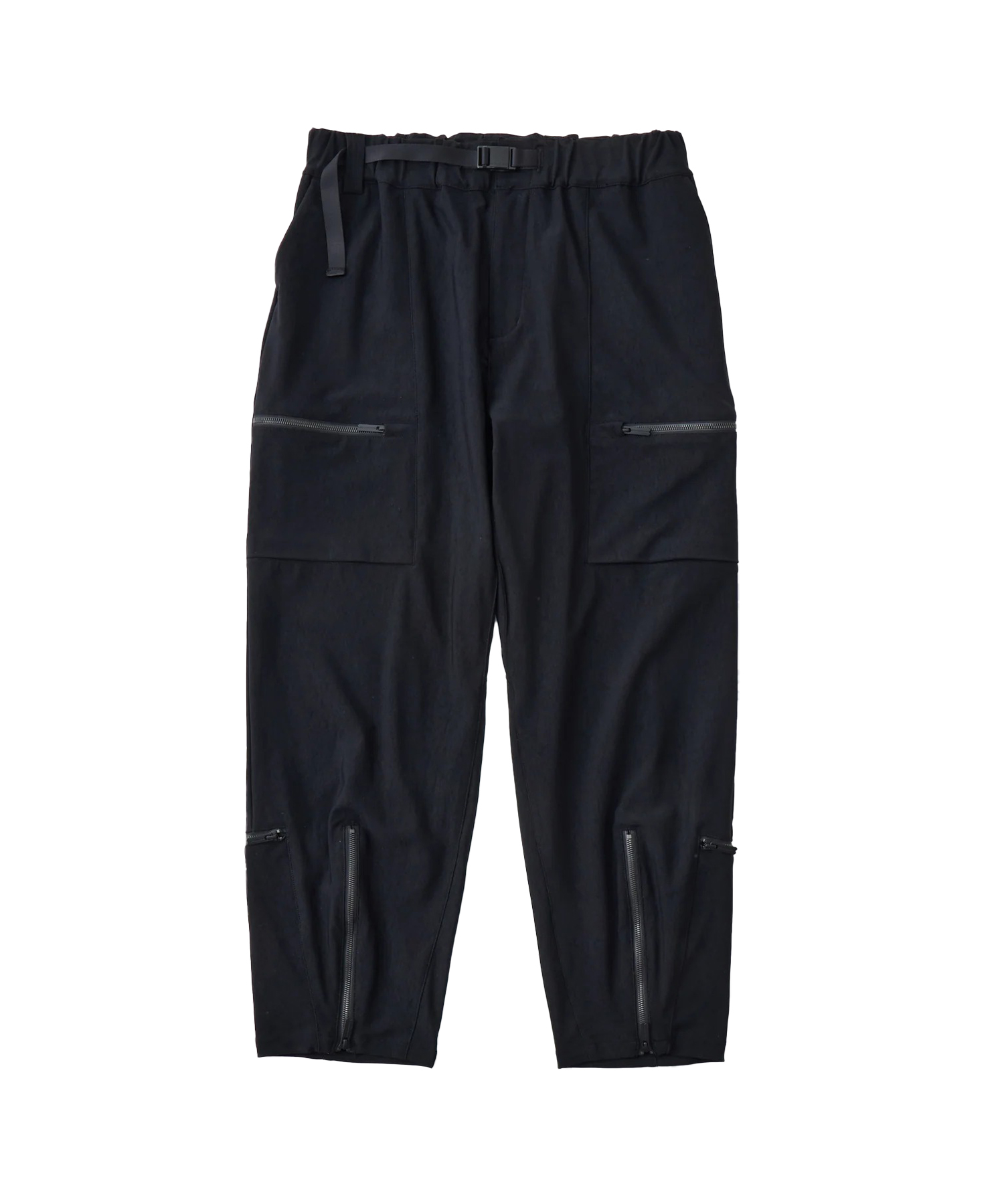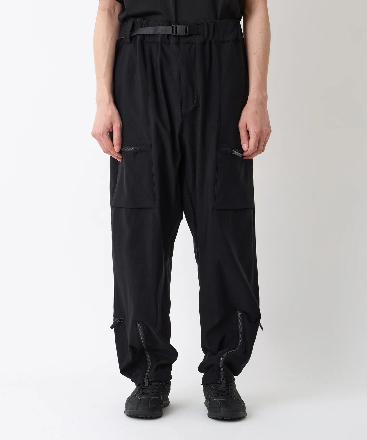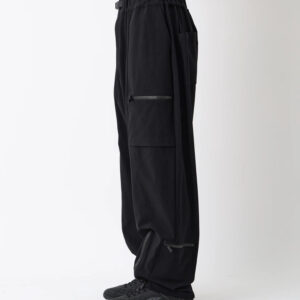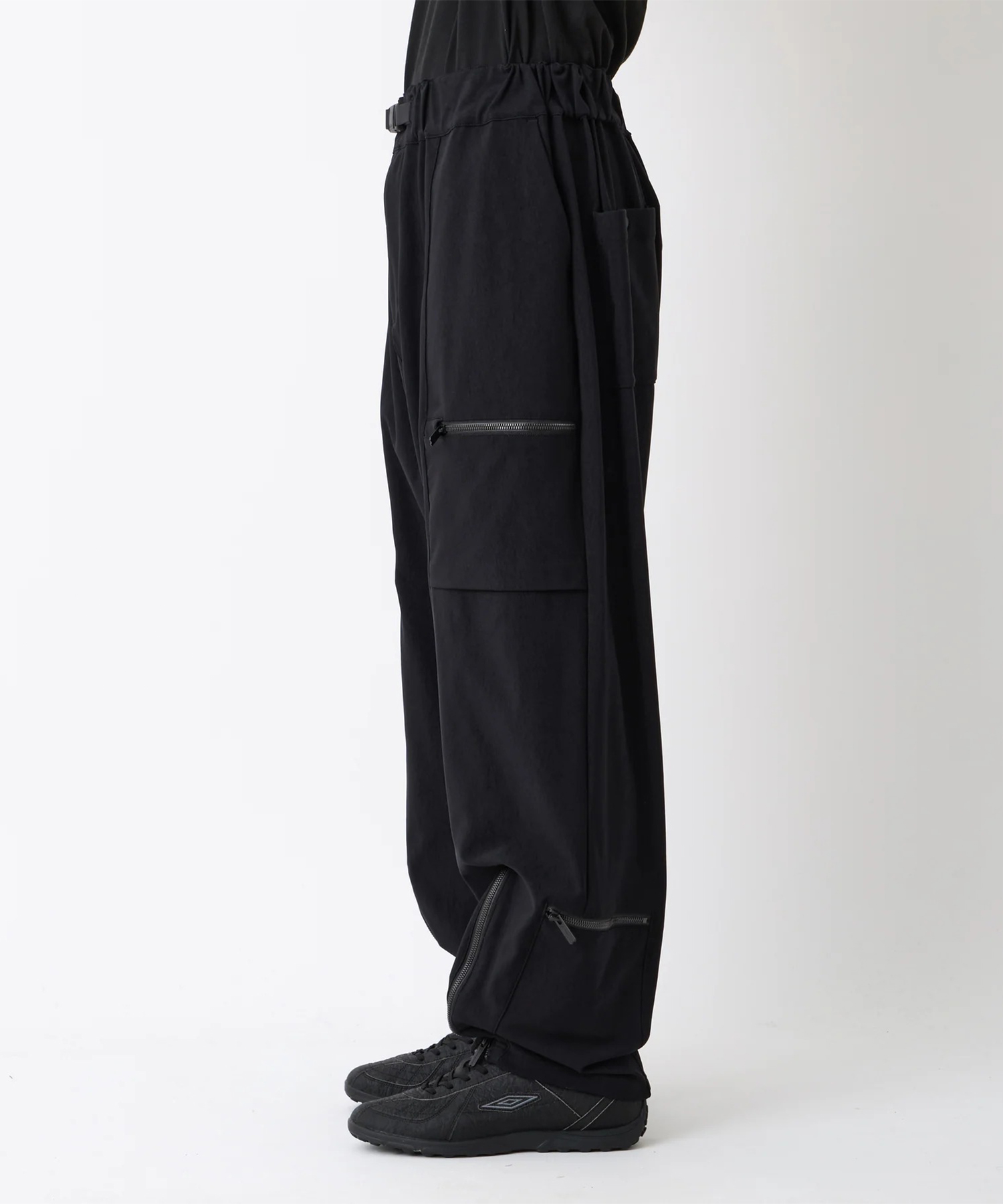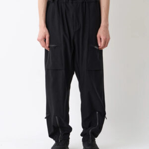 ストレッチトリコットパラシュートパンツ。フロントにジップポケット、裾にジップポケット、バックにパッチポケットを配置。FIDLOCK社製バックル仕様の伸縮性のあるウエスト。股下のガゼットクロッチにより履き心地を向上させた。裾のジッパー開閉でシルエットの調節が可能。トリコットハイテンション素材で伸縮性が高く、ストレスフリーな着用感。陰影のある独特な表情で高級感のある素材です。