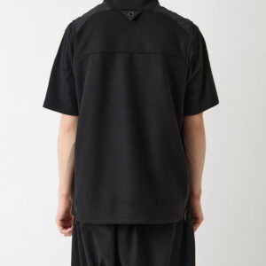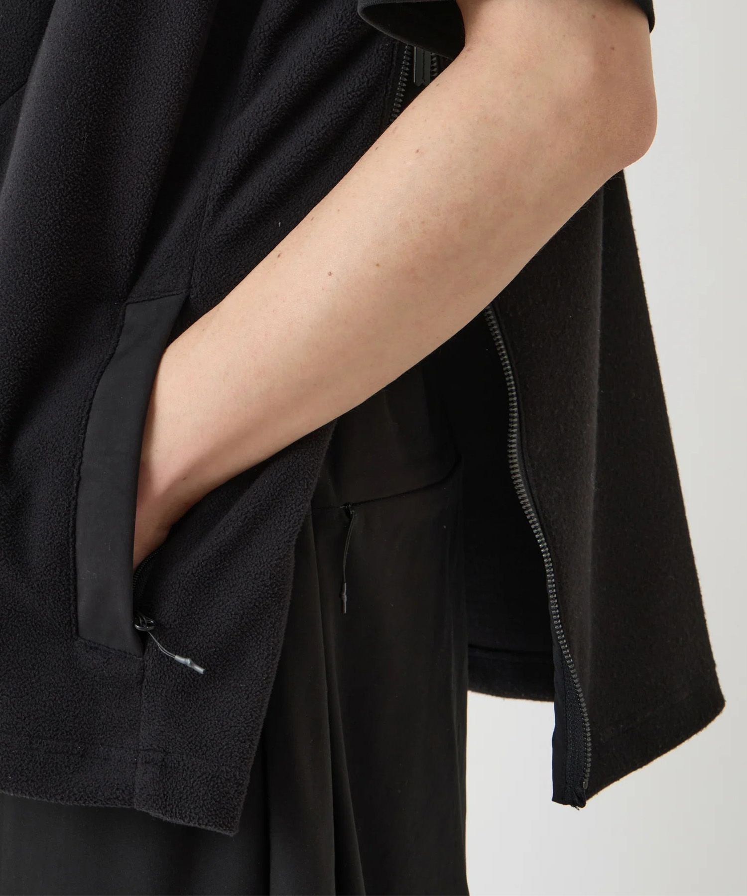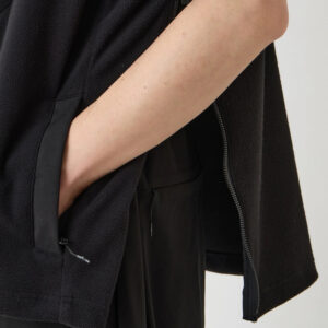 前中心のファスナーポケットが機能的なプルオーバータイプのベスト。両脇に大きくファスナーあきがあり着脱を容易にした。表地にはDiAPLEXを採用。