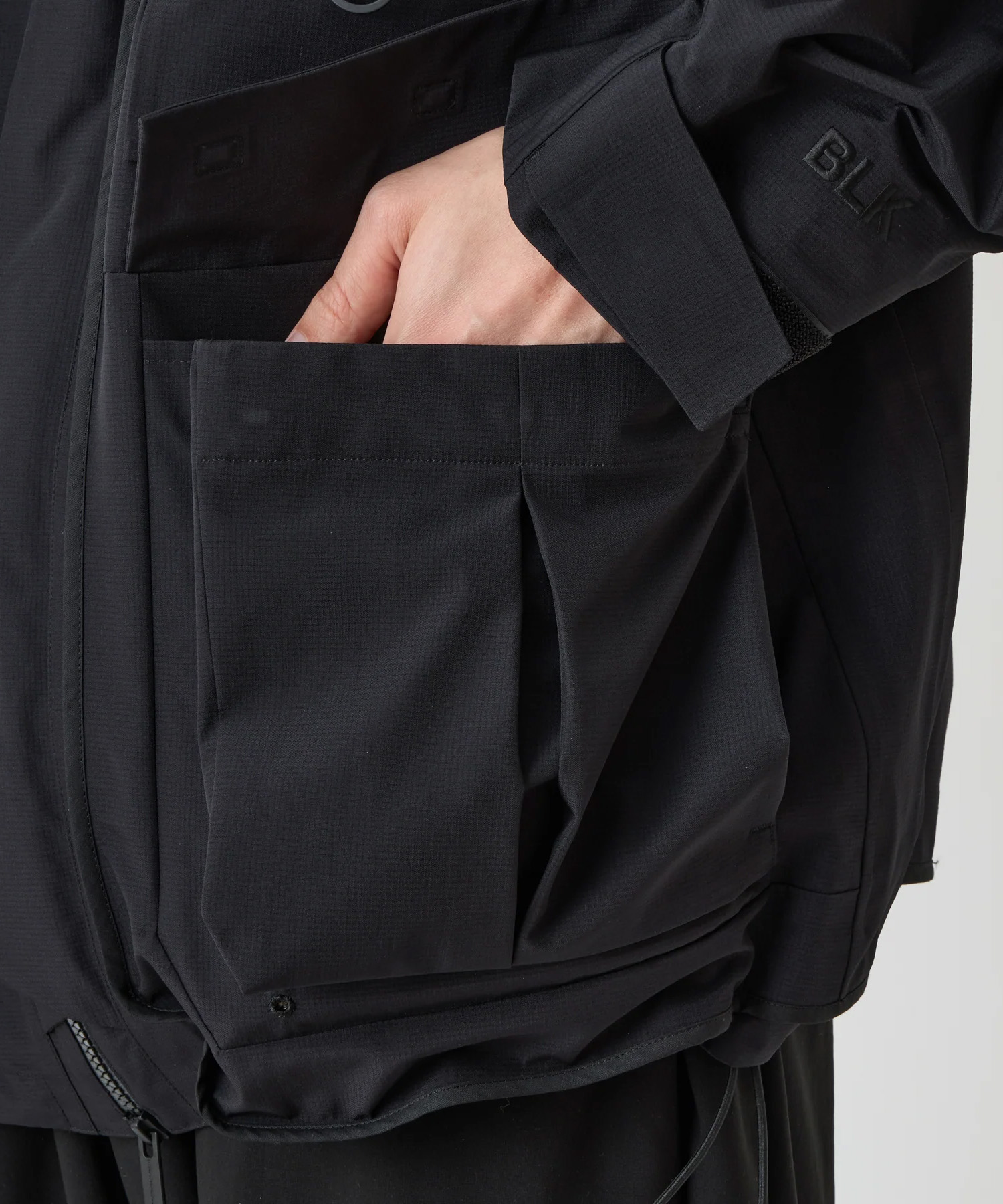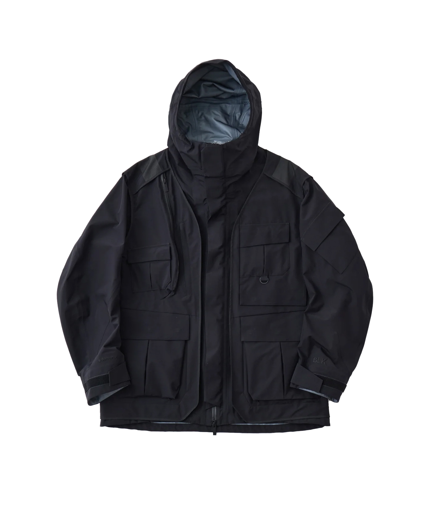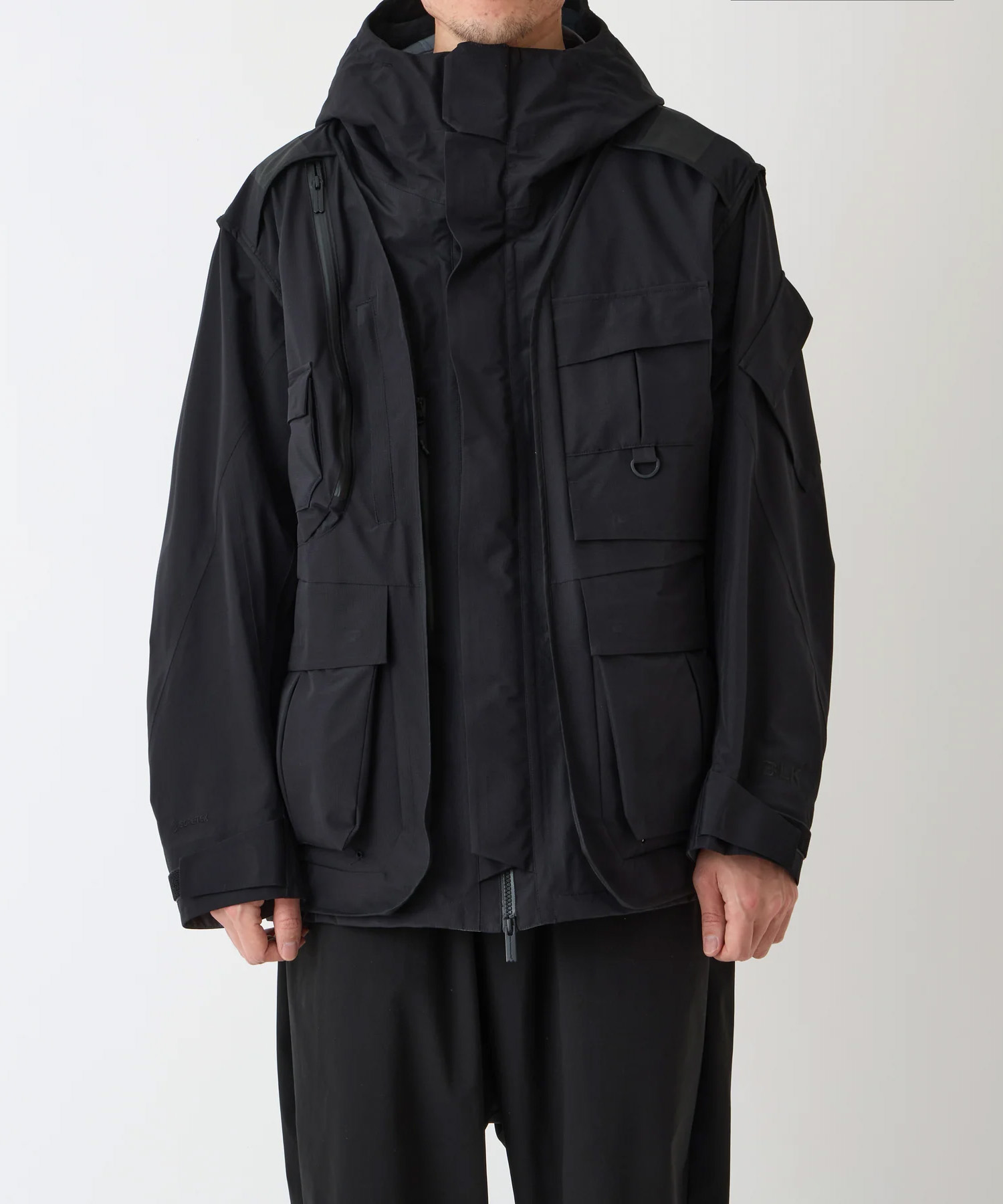身頃にレイヤード風のディテールを取り入れて、アシンメトリーに多数のポケットを配置し収納力十分なGORE-TEXジャケット。肩に沿った帯状のプリントがポイント。