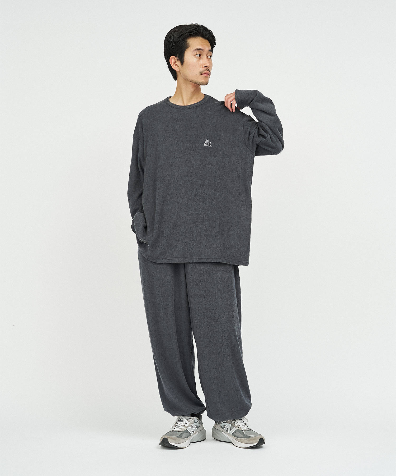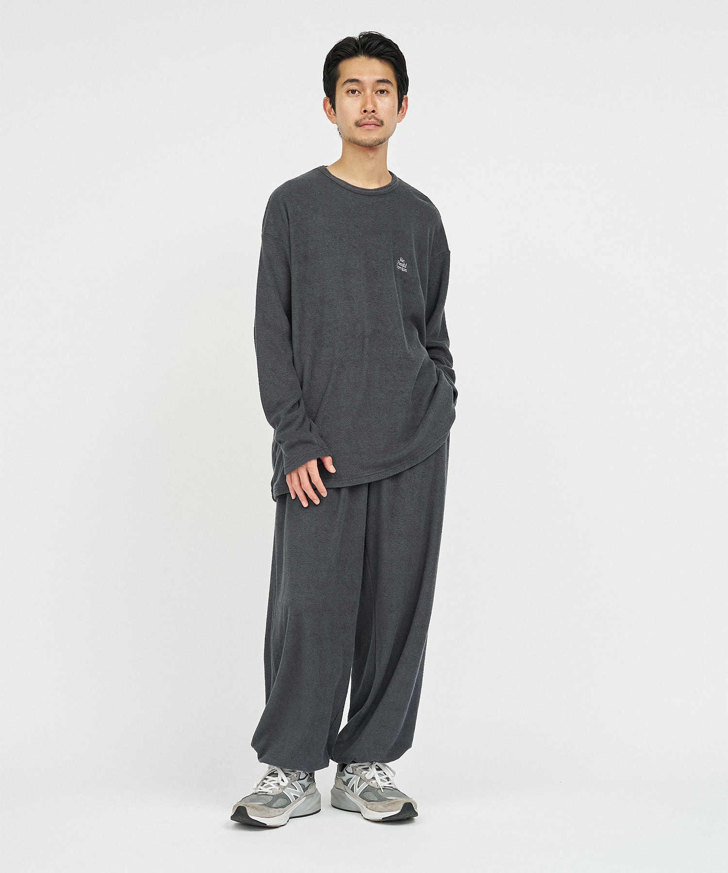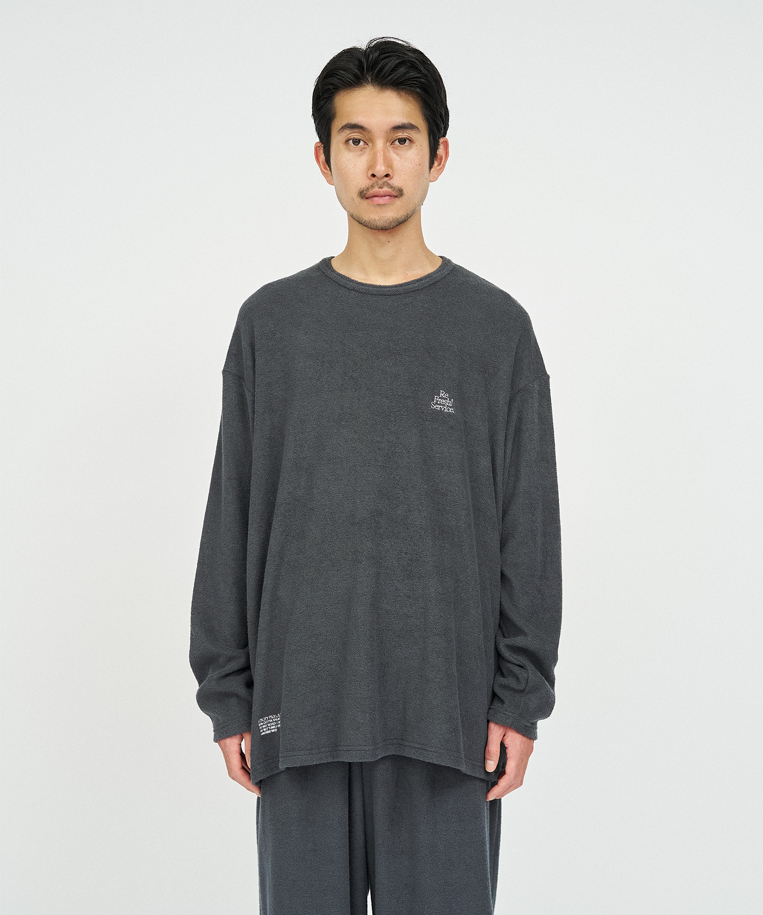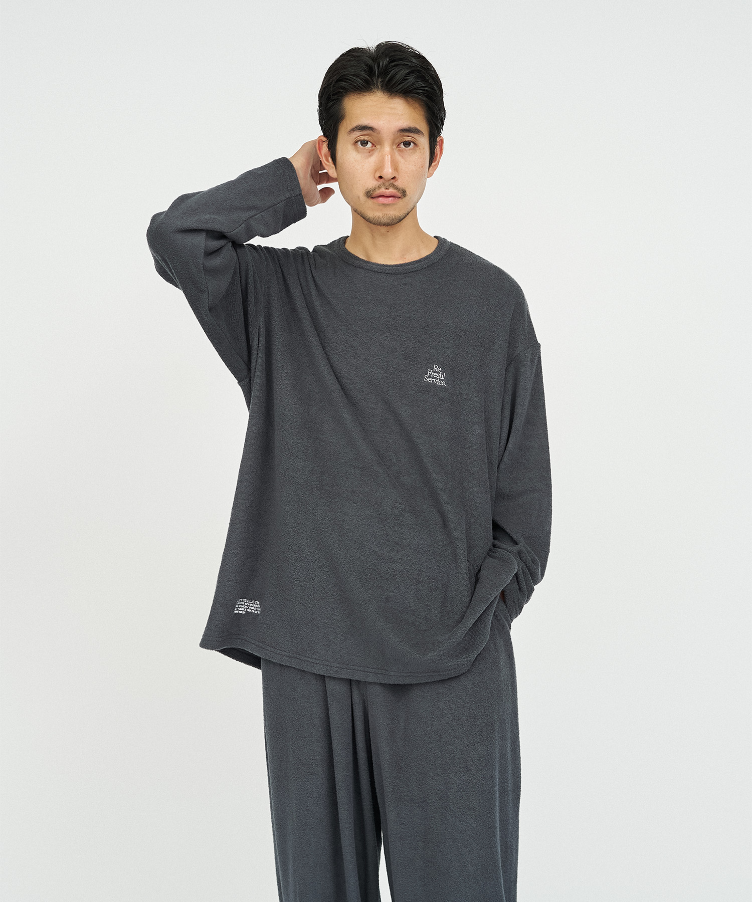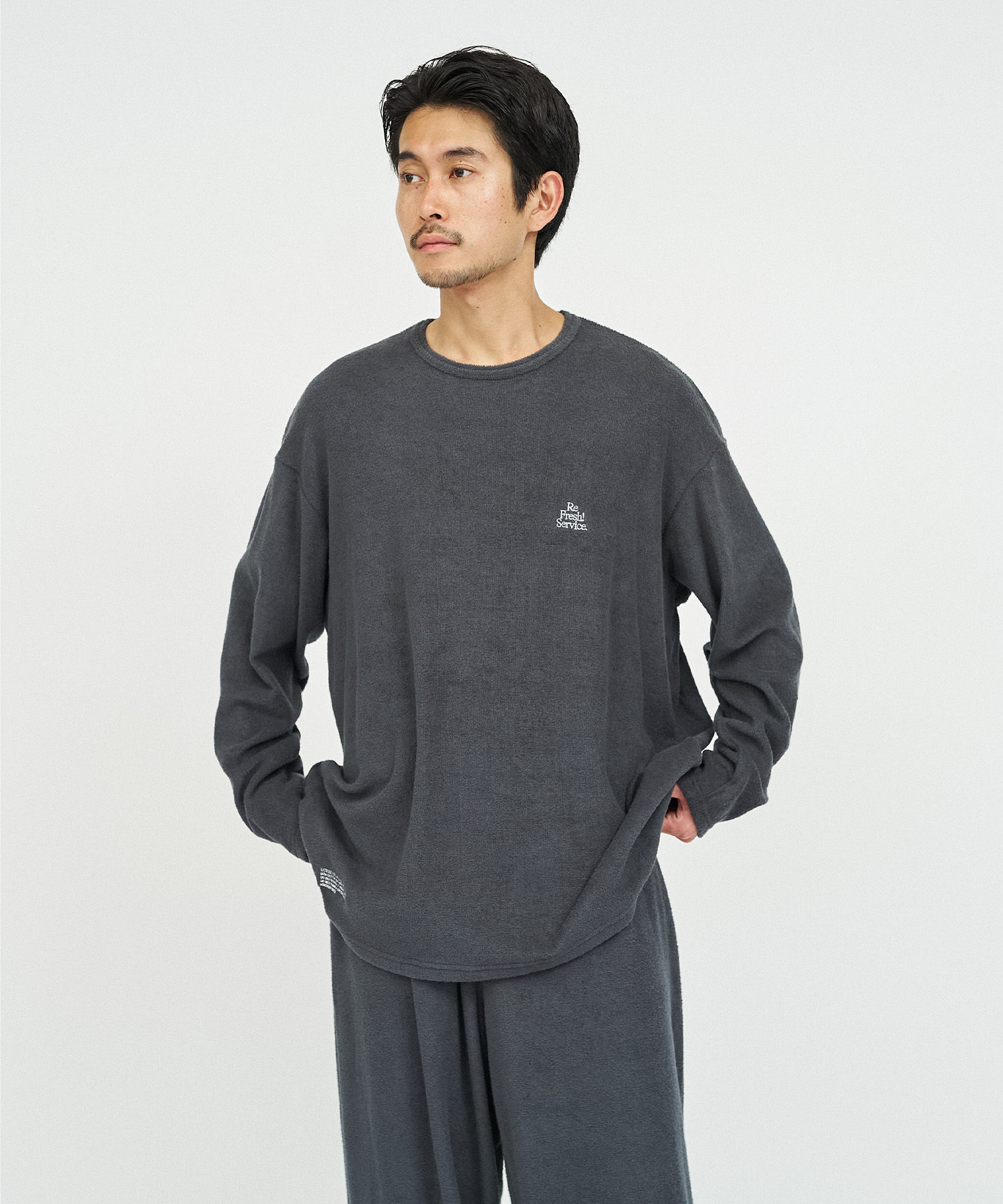 柔らかな肌触りでリラックス感溢れるパイル地を使用したReFresh!ServiceのロングスリーブTシャツとイージーパンツのセットアップ。ゆったりとしたサイジングで伸縮性も抜群。通気性も良くルームウェアとしても快適。