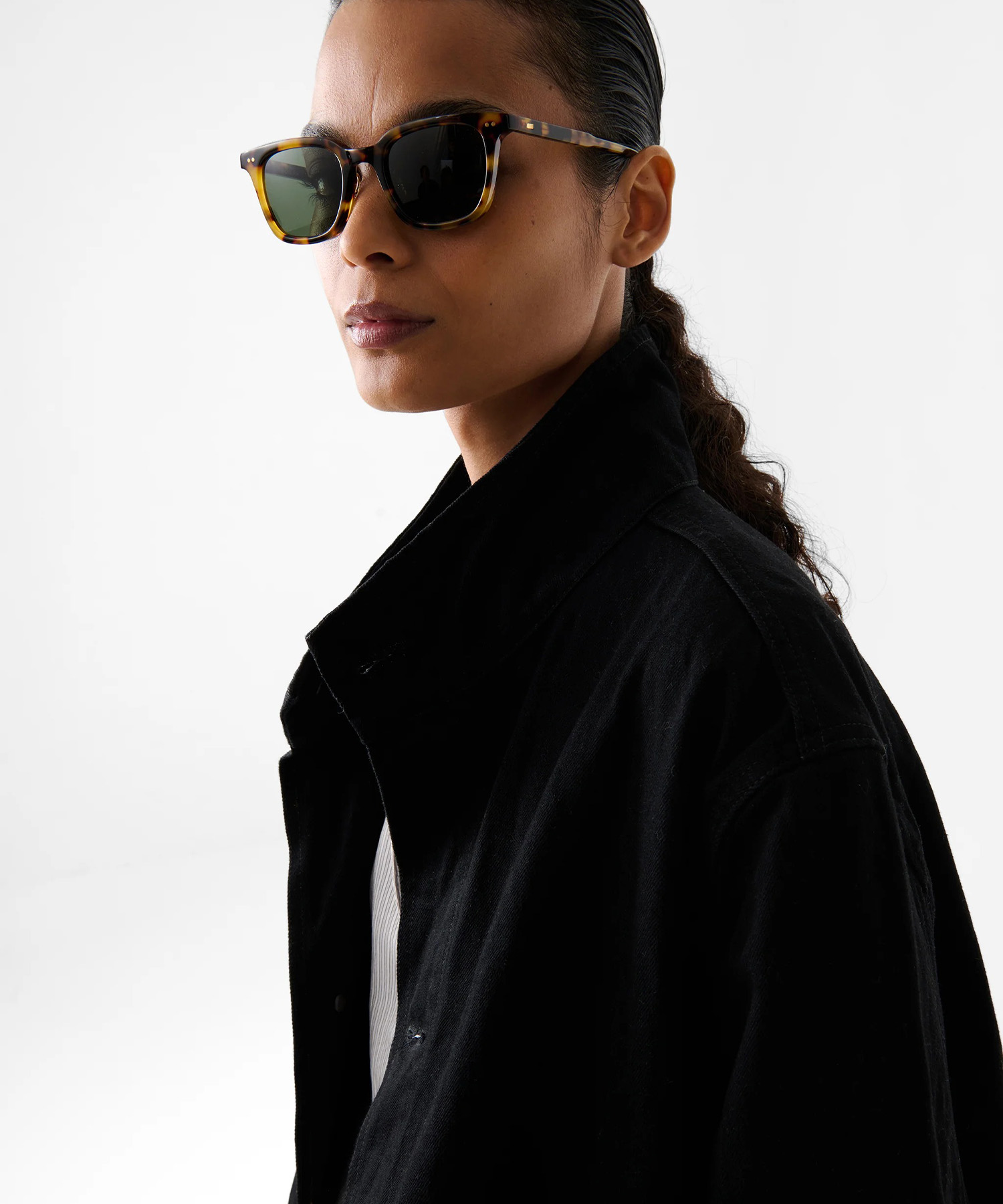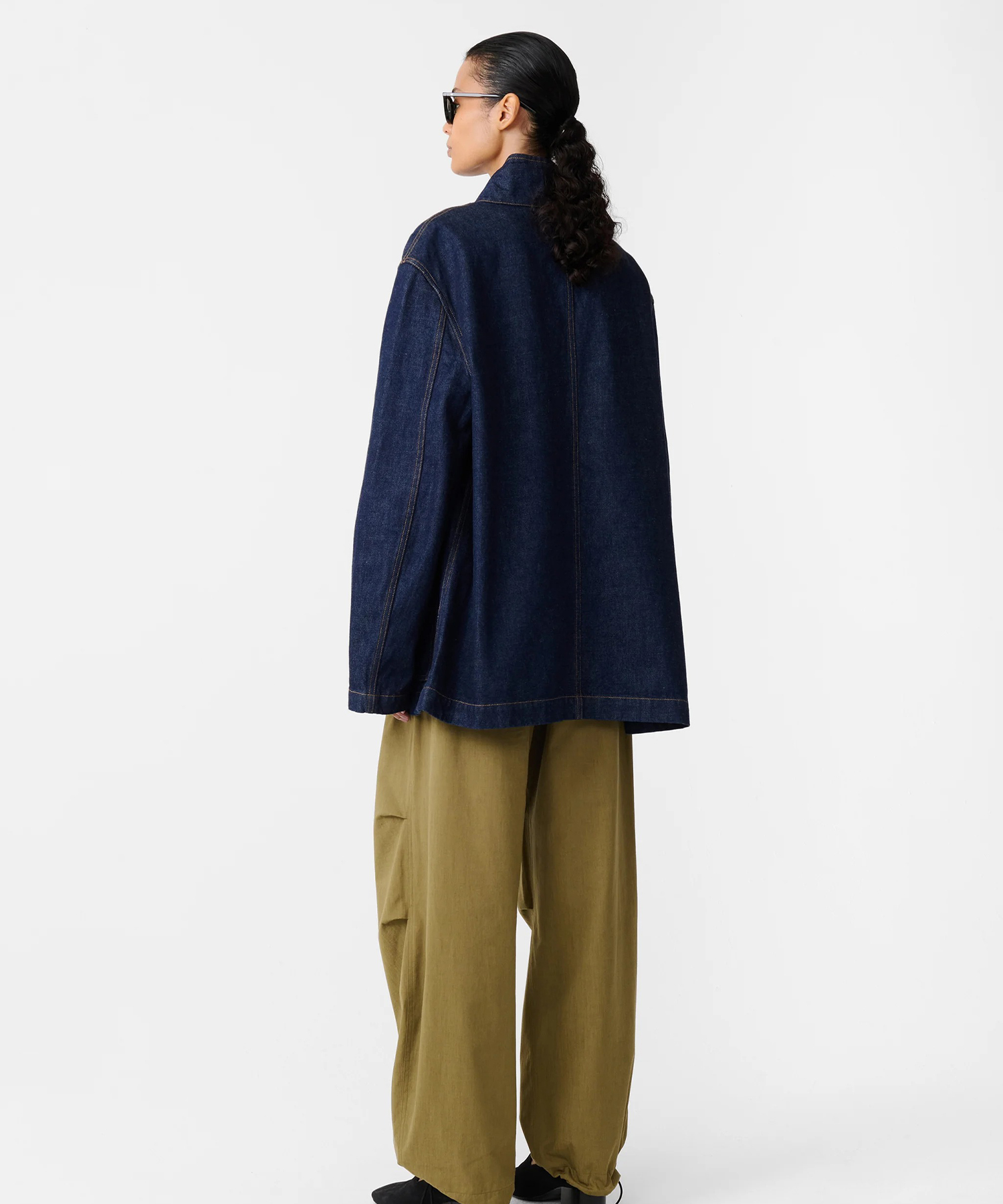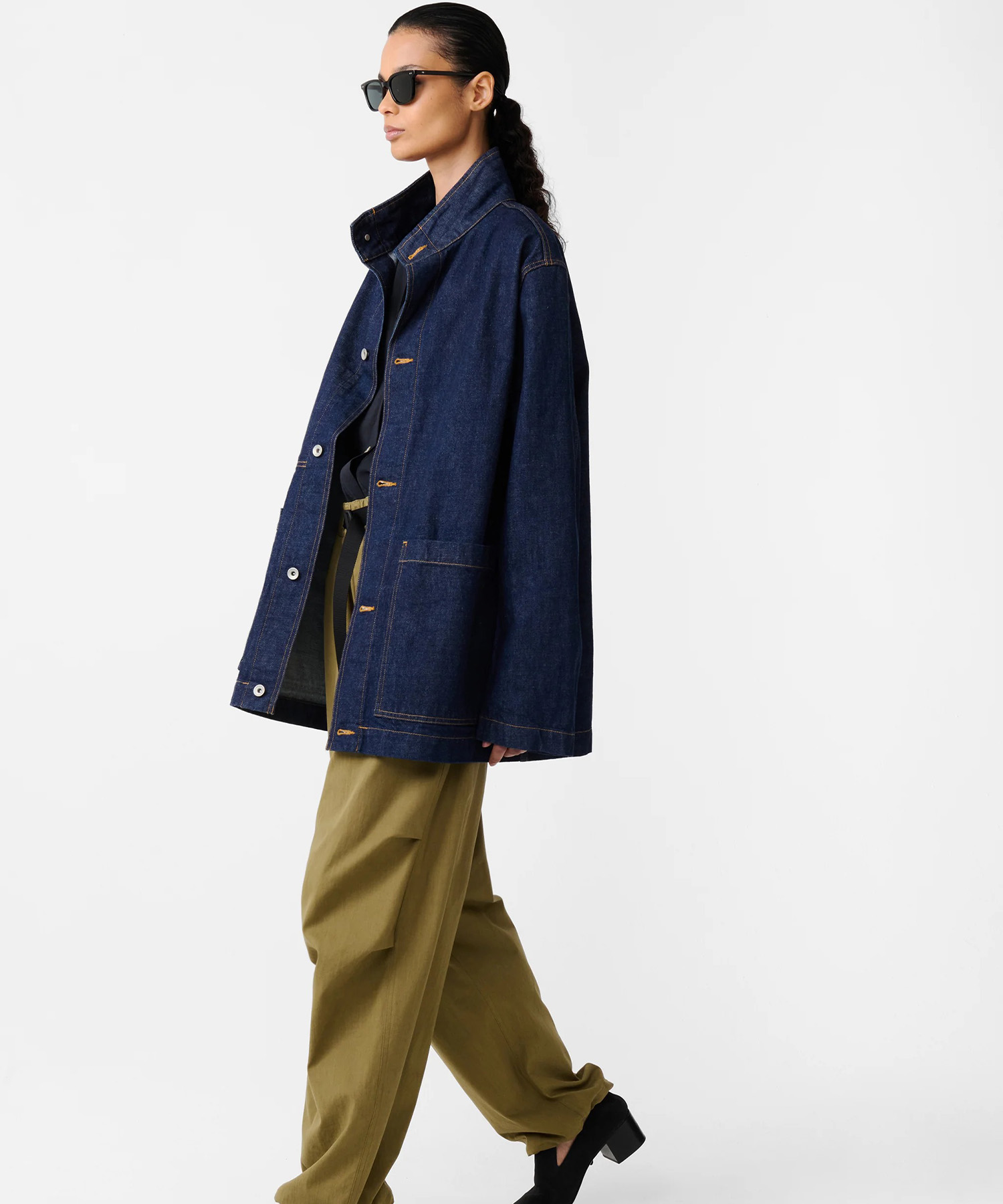 たっぷりとしたパッチポケット、すっきりとしたボタン留め仕様の前立て、ストレートヘムが特徴で、トップステッチで縁取りが施されている。