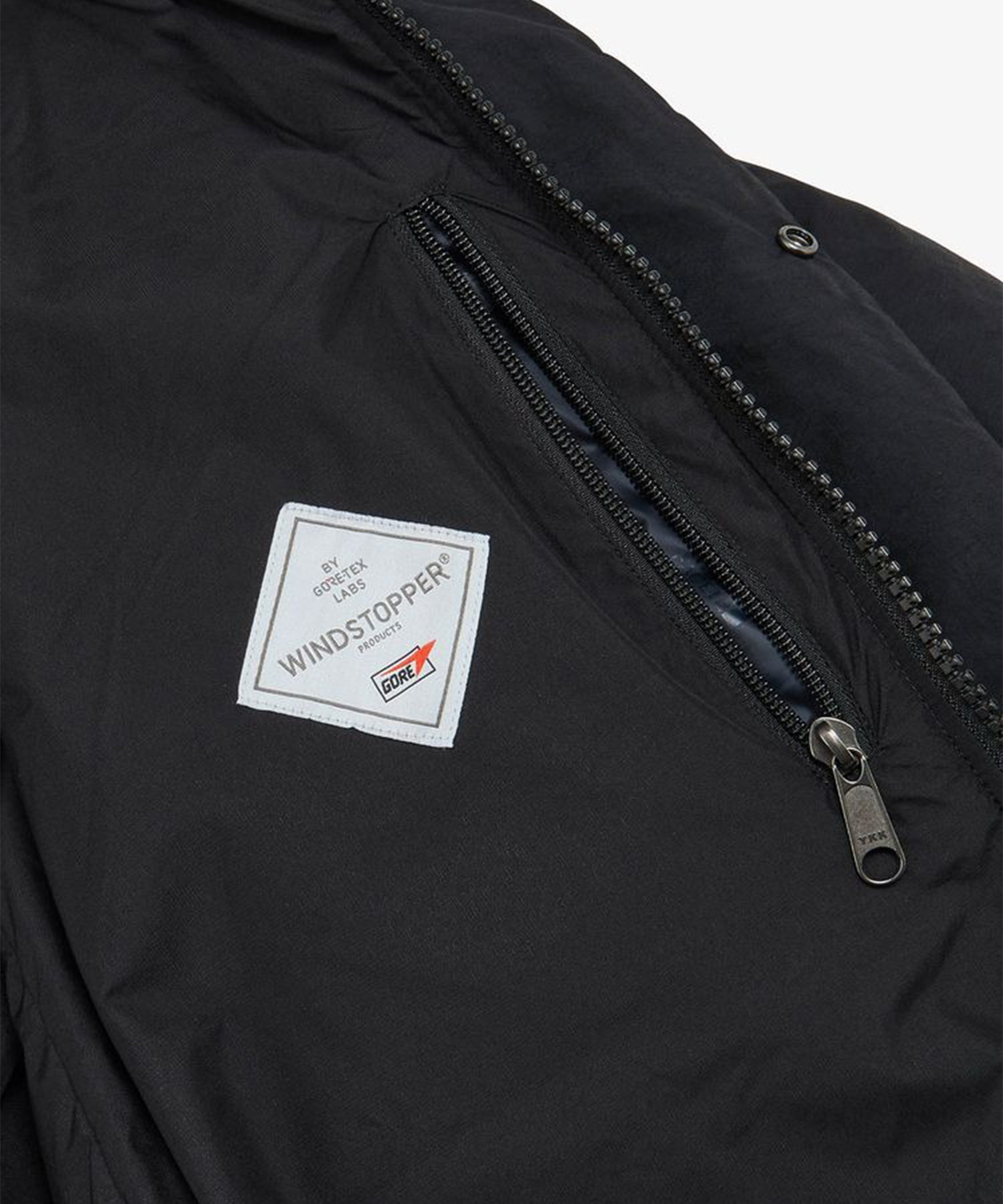 。中わたの一部にリサイクルダウンを使用し、保温性と軽さを追求。裏地にGORE-TEX WINDSTOPPER 2層構造を使用し、風の侵入を軽減しています。