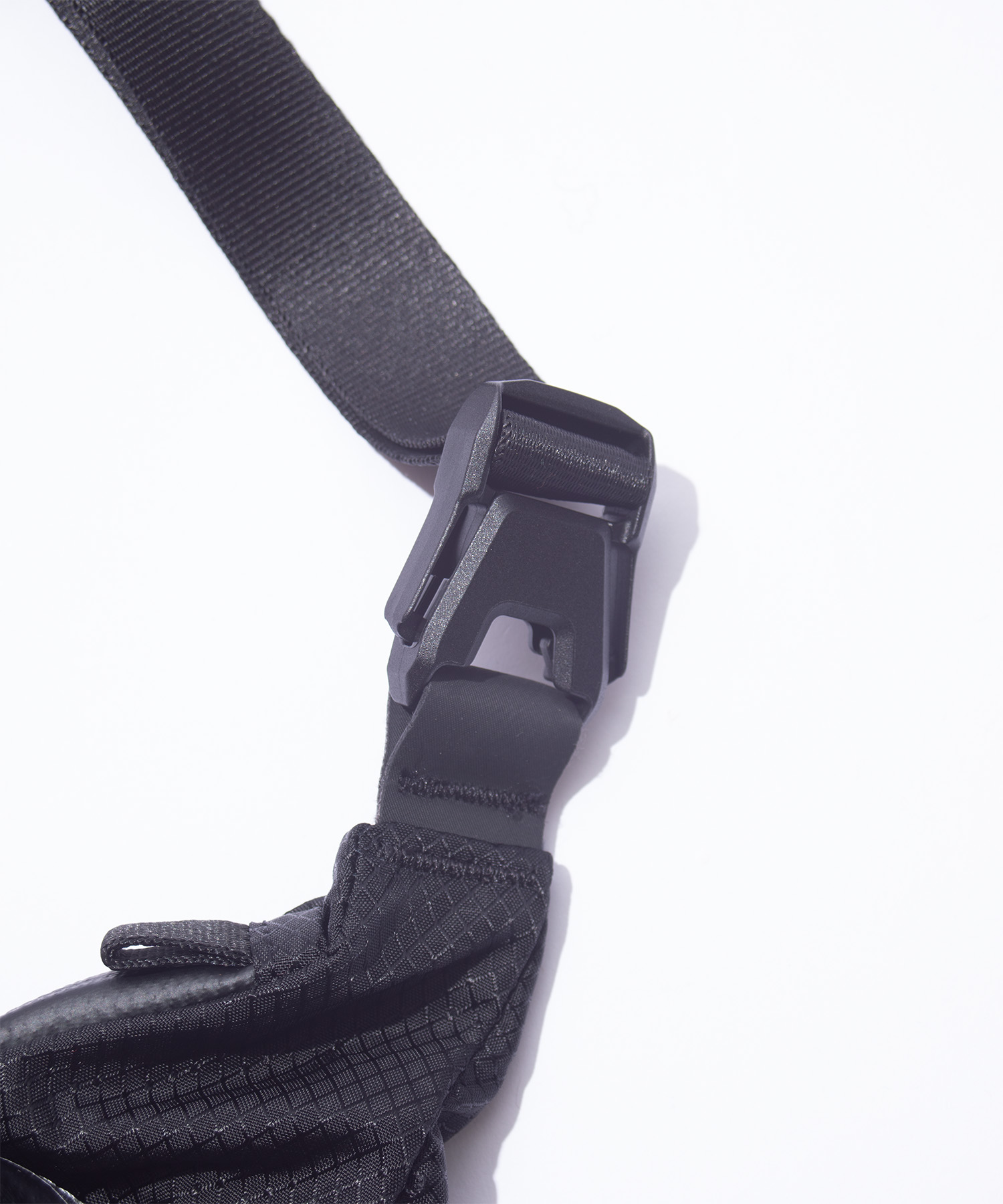 ストラップのバックルにはV字アジャスターパーツを使い、通常のサイドリリースバックルよりも着脱し易い仕様になっています。 生地の切り替えによって、アシンメトリーで独創的なデザインを採用。