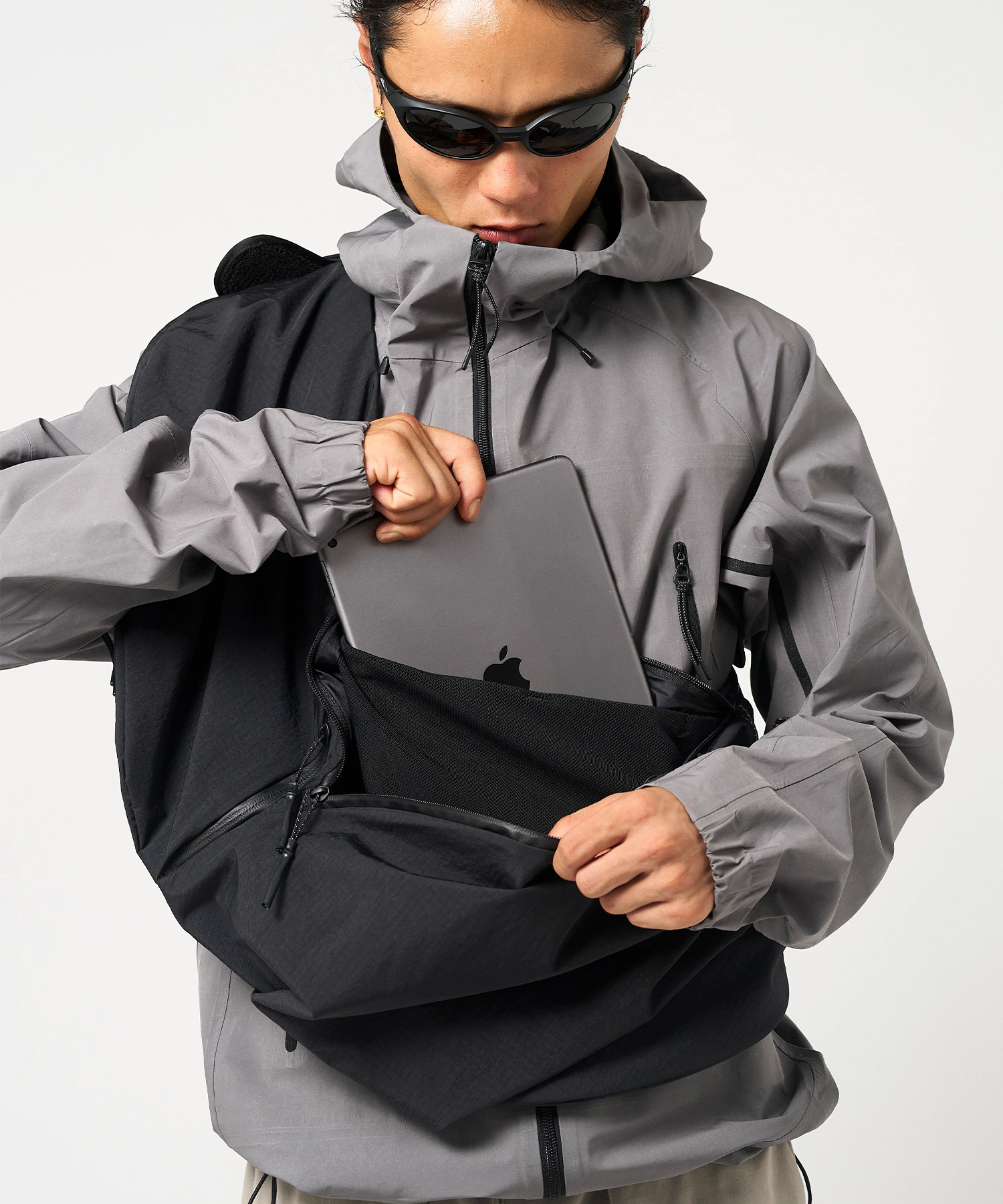 前後に大きなポケットを配置し背中側のポケットにはマチを設け容量を大きく取っており15inchのラックトップも収納可能です。前ポケットにはスマホ用のインナーメッシュポケットがあり、鍵などを取り付けられるキーホルダーも付いているので、安全性を確保しつつ使いやすさを考えた仕様になっています。