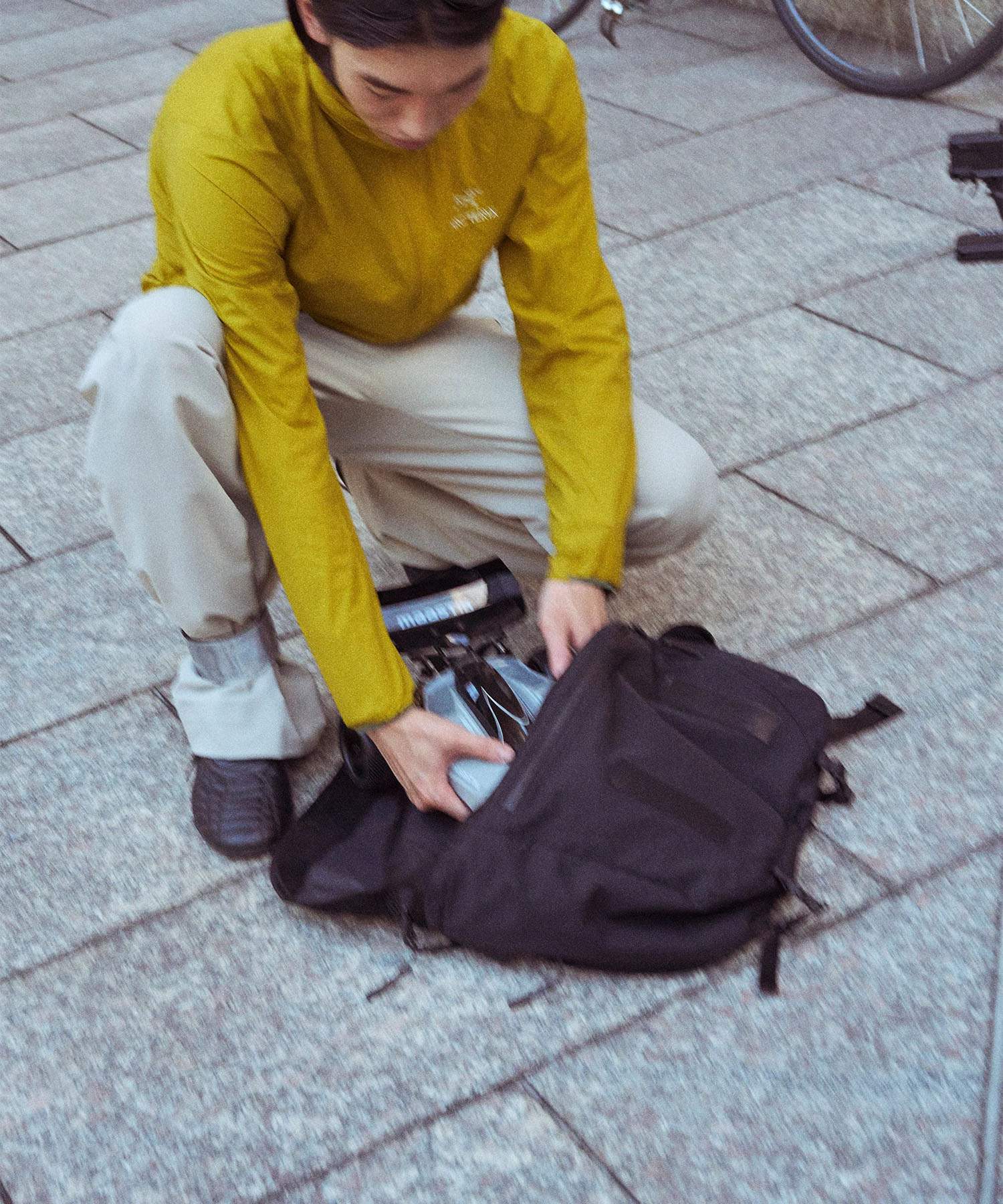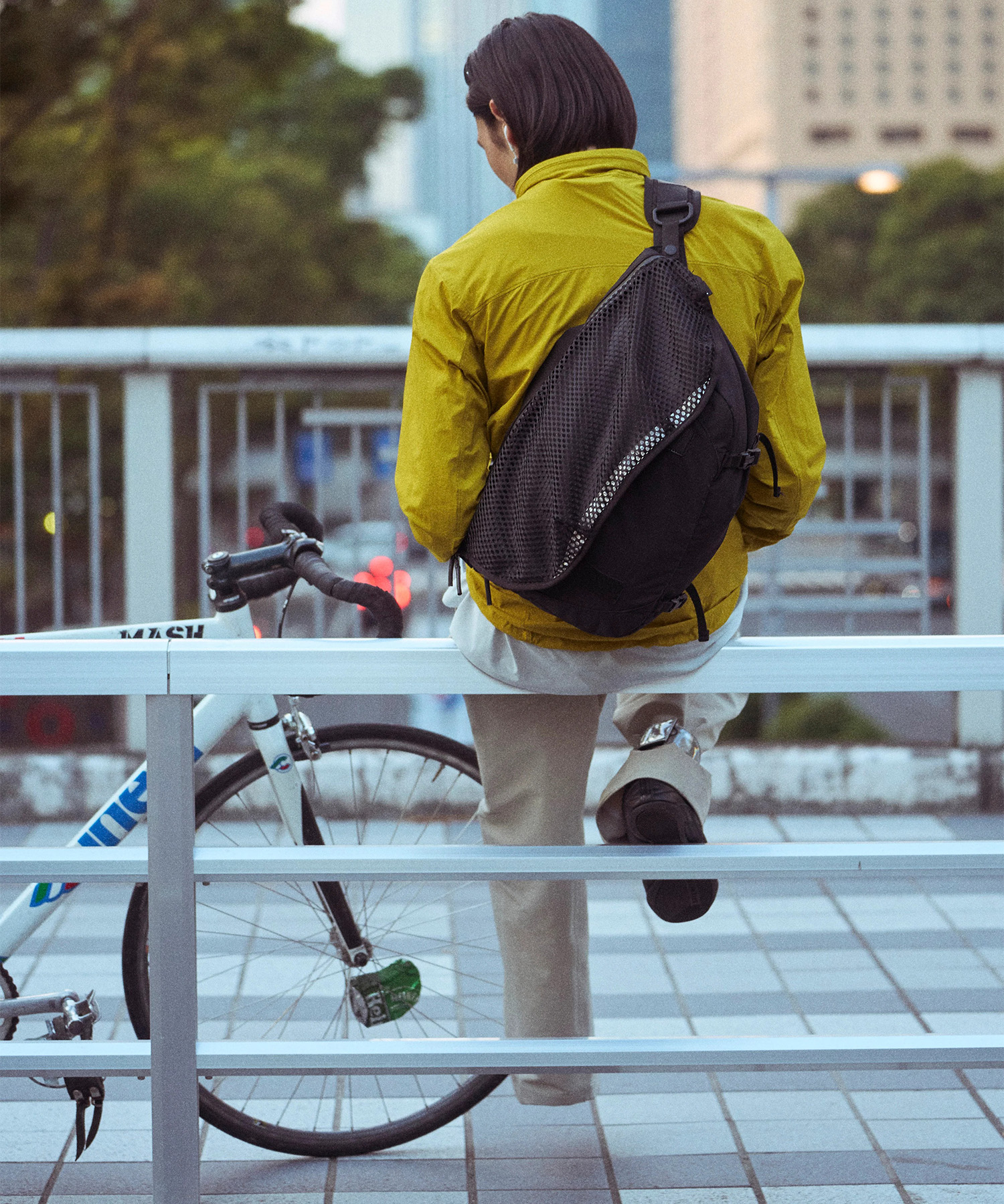 フラップ全体にメッシュポケットを配置し、メッシュの隙間から反射するリフレクターが夜間の安全性を確保するのと同時にバッグの存在を引き立てます。