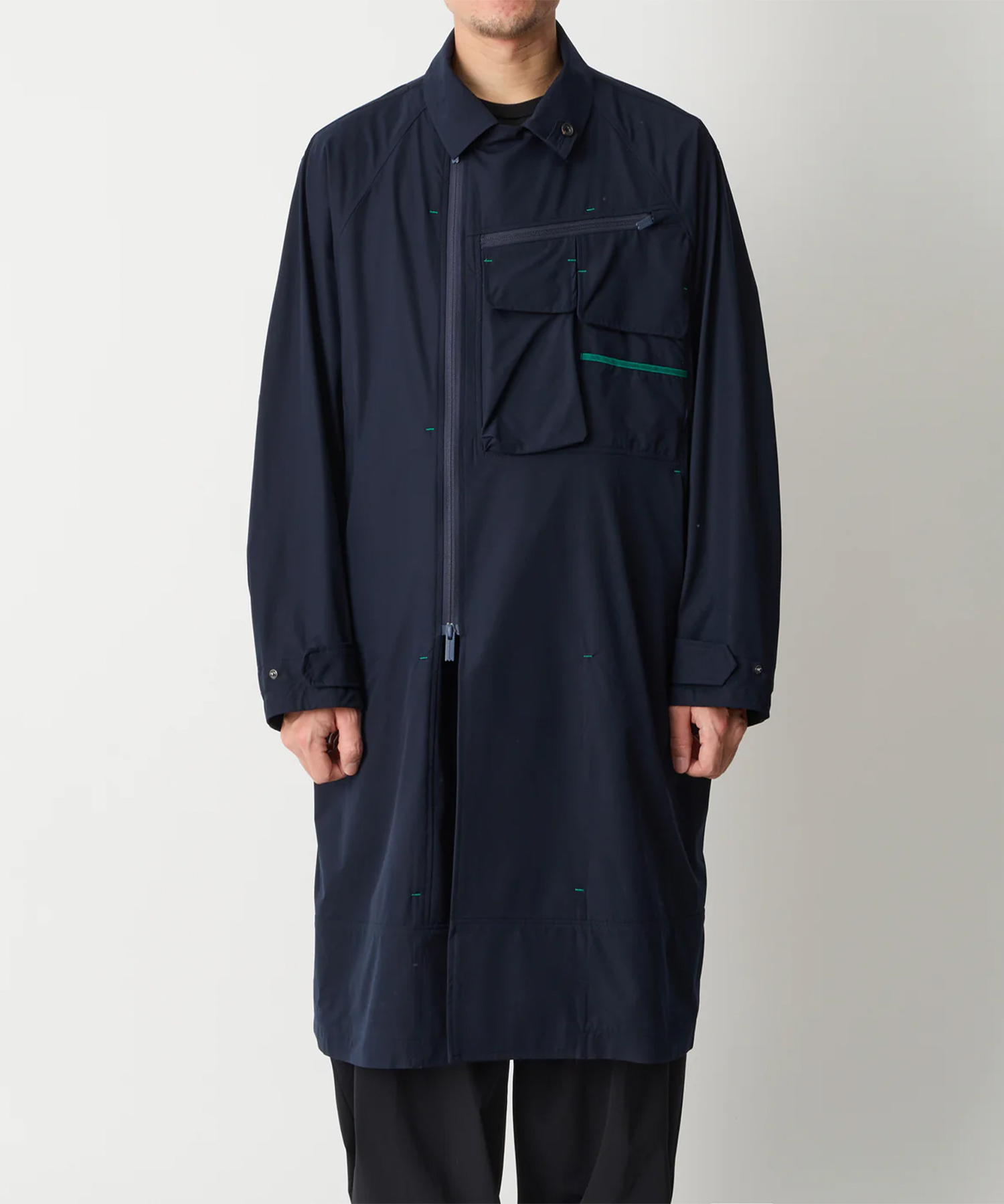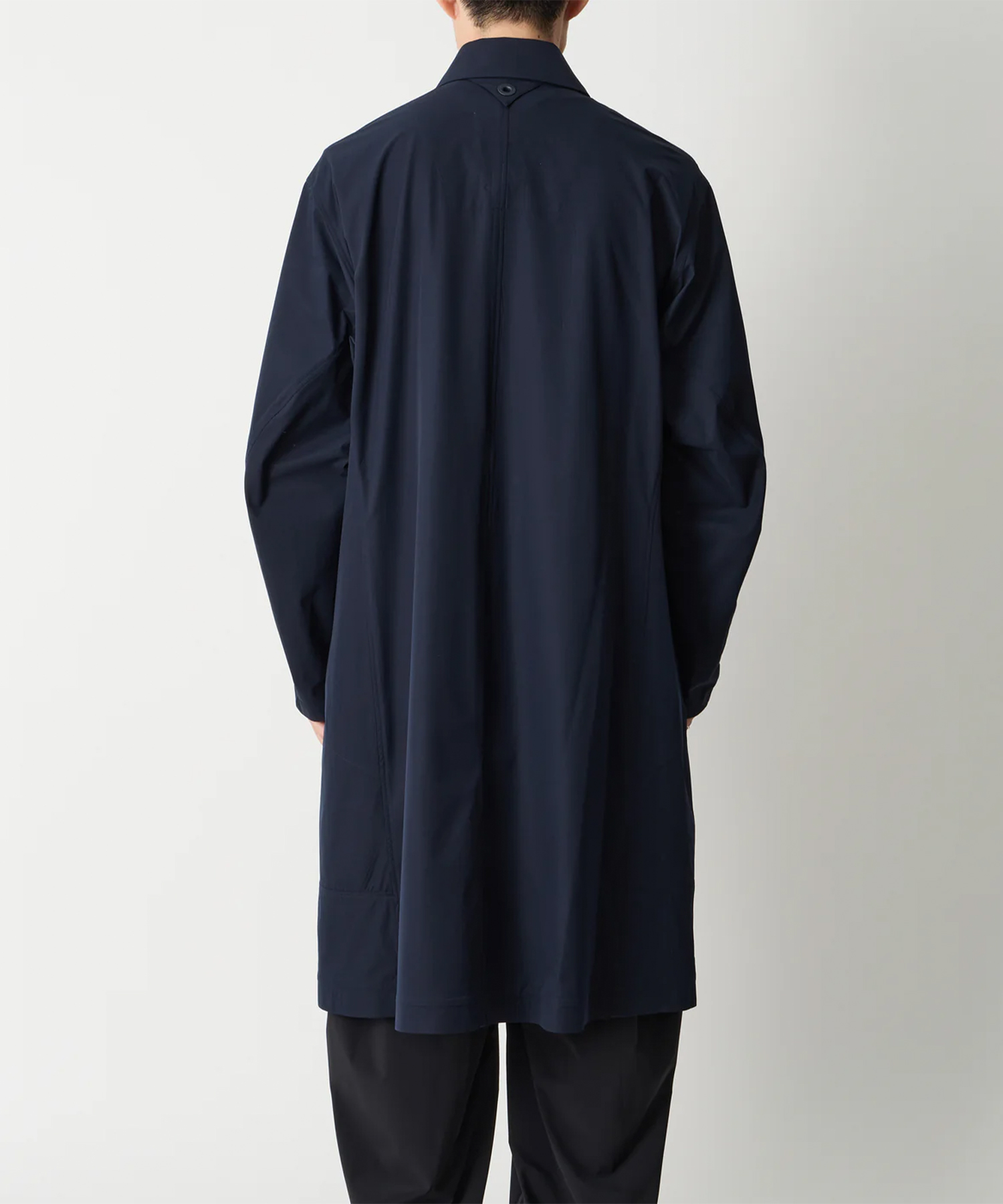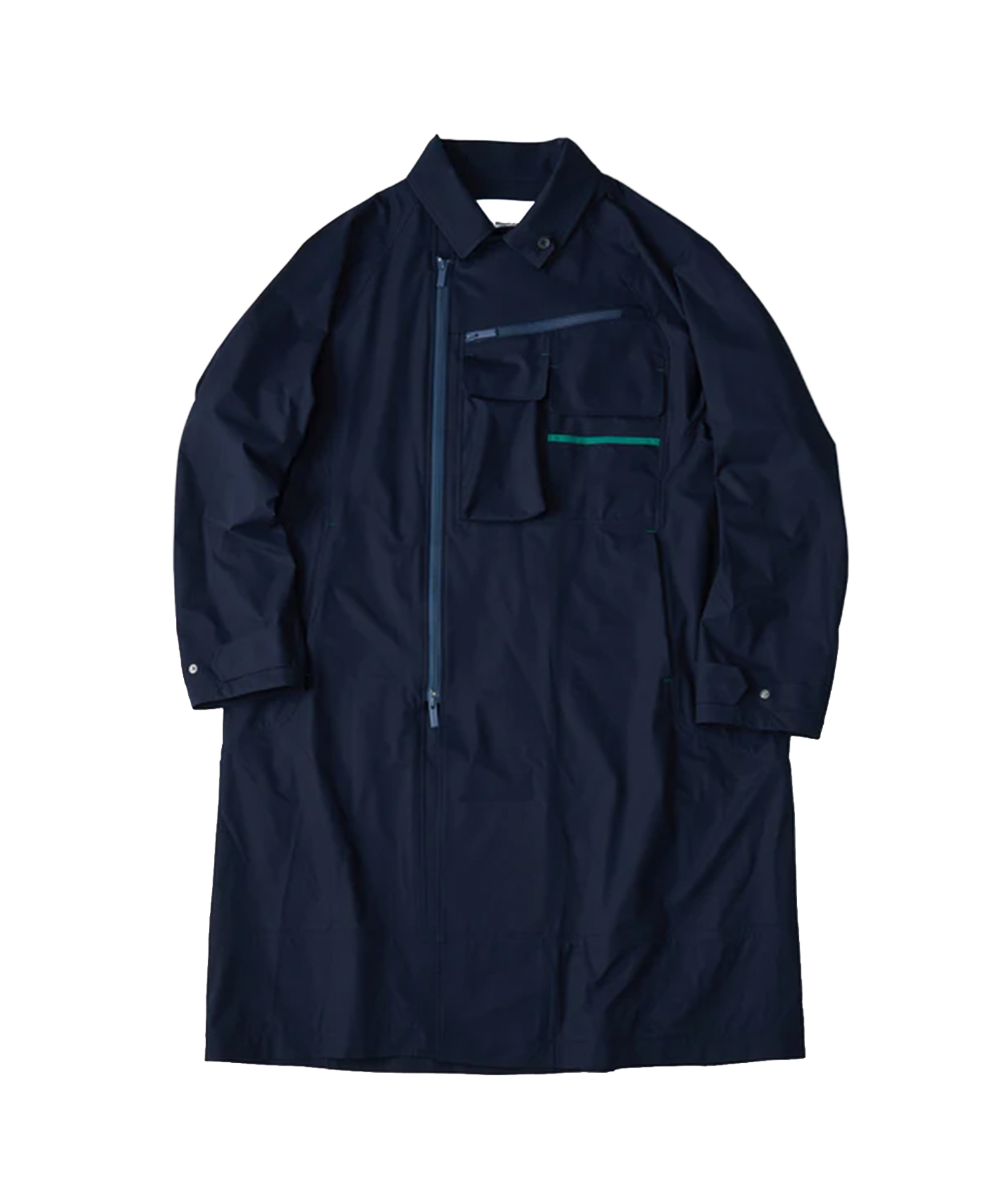 配色のパイピングとカンヌキがアクセントになった、シンプルなAラインシルエットのバルマカーンコート。性質の異なる2種類のポリマーを貼り合わせた断面を持つ、バイコンポーネント構造により高いストレッチ性と着用快適性を兼ね備えた、タフでドライな撥水性のある2wayストレッチ素材。