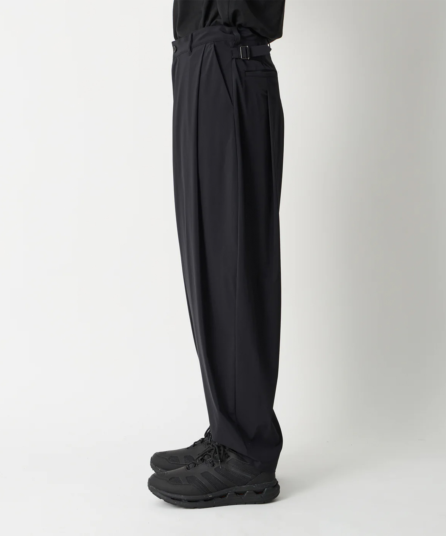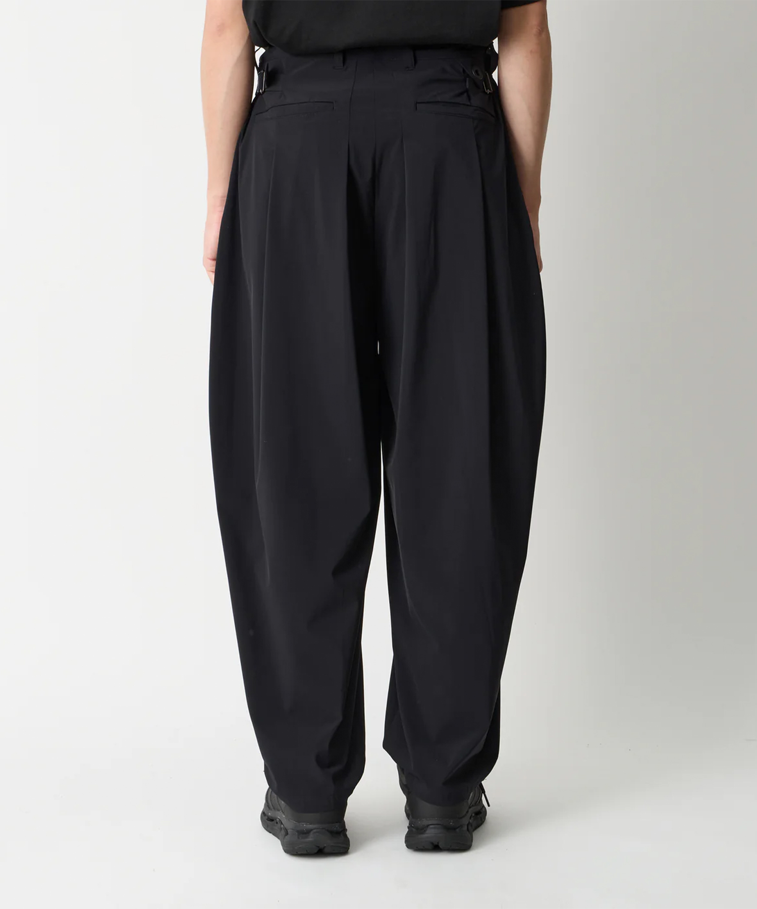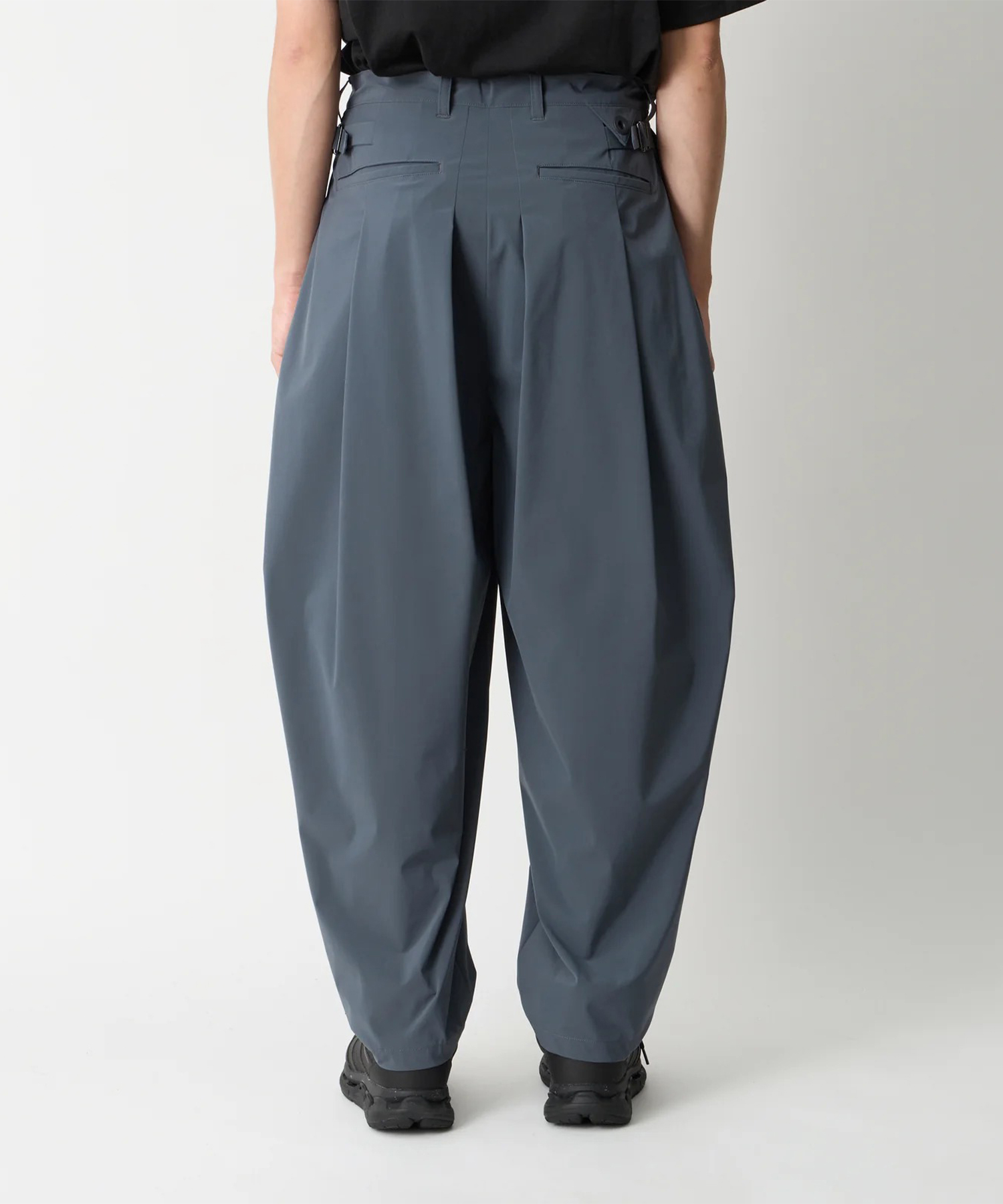 8タックワイドテーパードパンツ。フロントに4つ、バックに4つのタックを配置。片玉縁のバックポケットとスピンドル入りウエストの仕様。両脇のストラップでサイズ調節可能。環境配慮型PETフィルム「EcouseR」と、リサイクル素材、ロイカを使用した2wayストレッチ素材。 環境配慮型の非フッ素撥水加工を施しております。