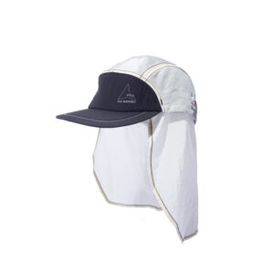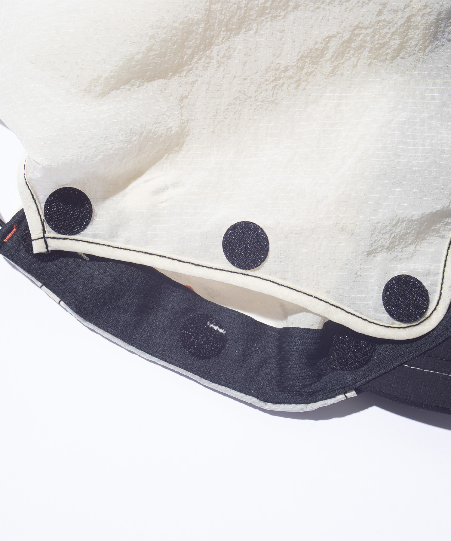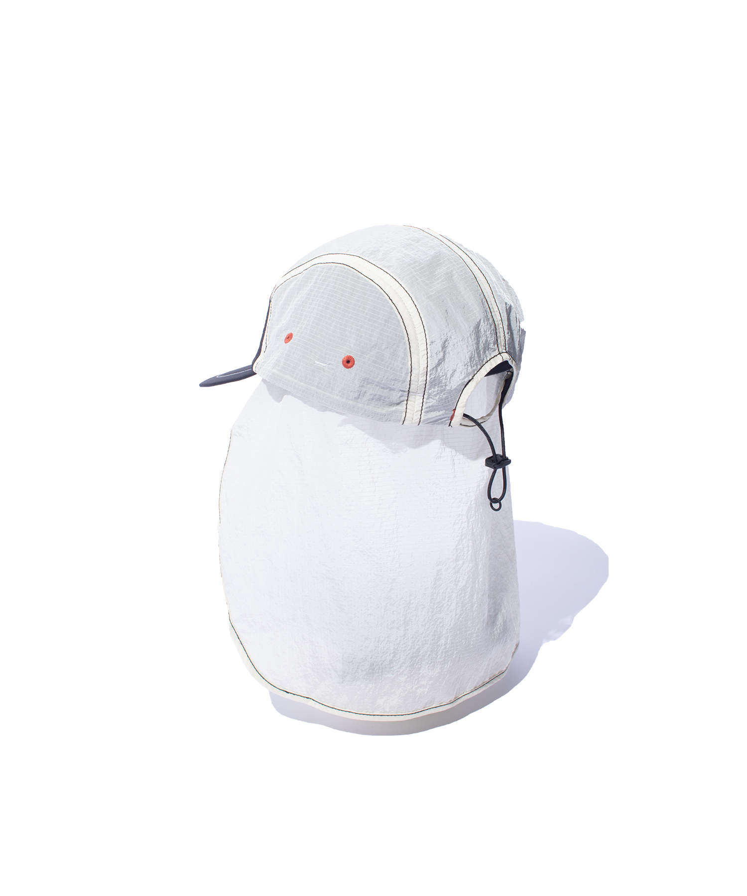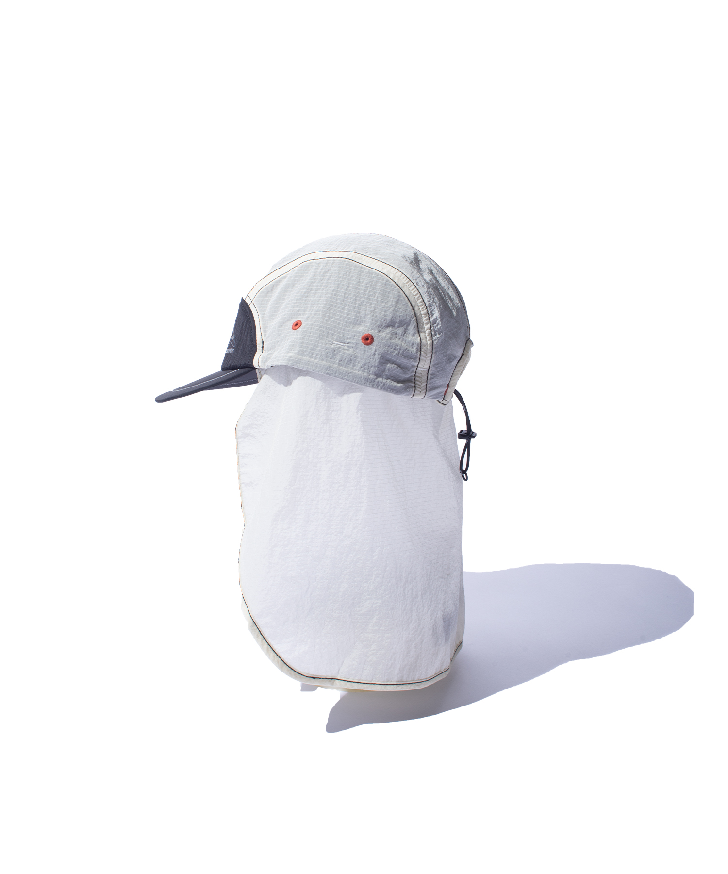 撥水加工されたリップストップ素材を使用したキャップで、ネック部分のカバーは、帽子内側のベルクロで着脱することができます。