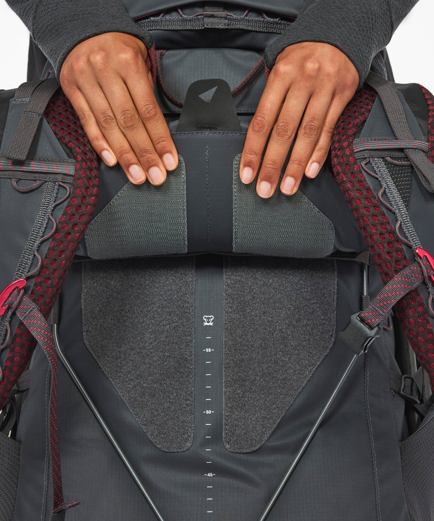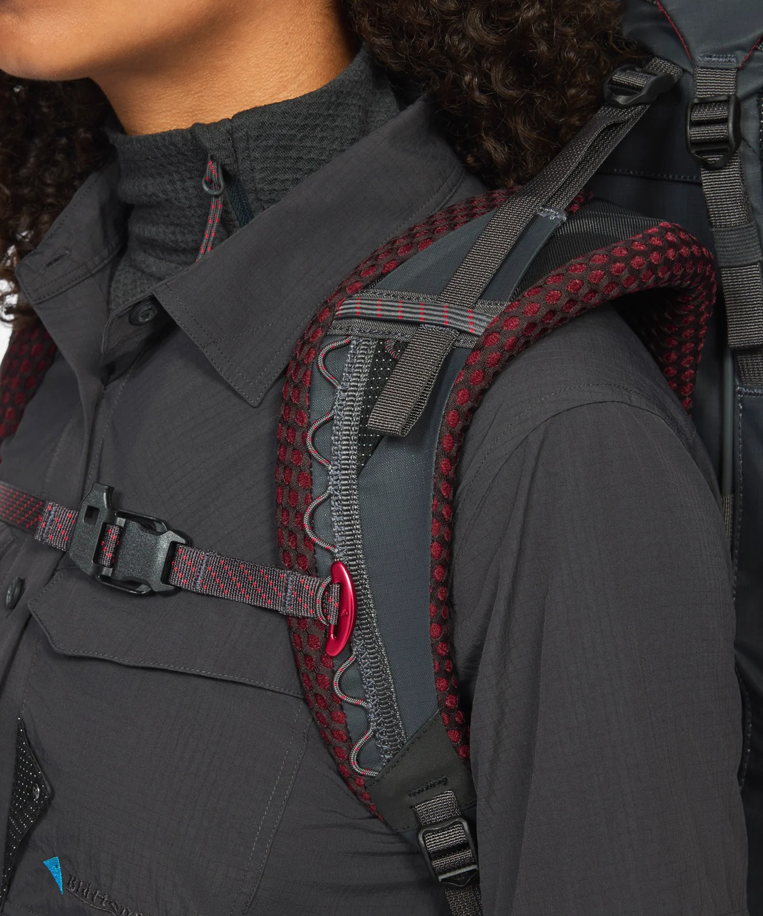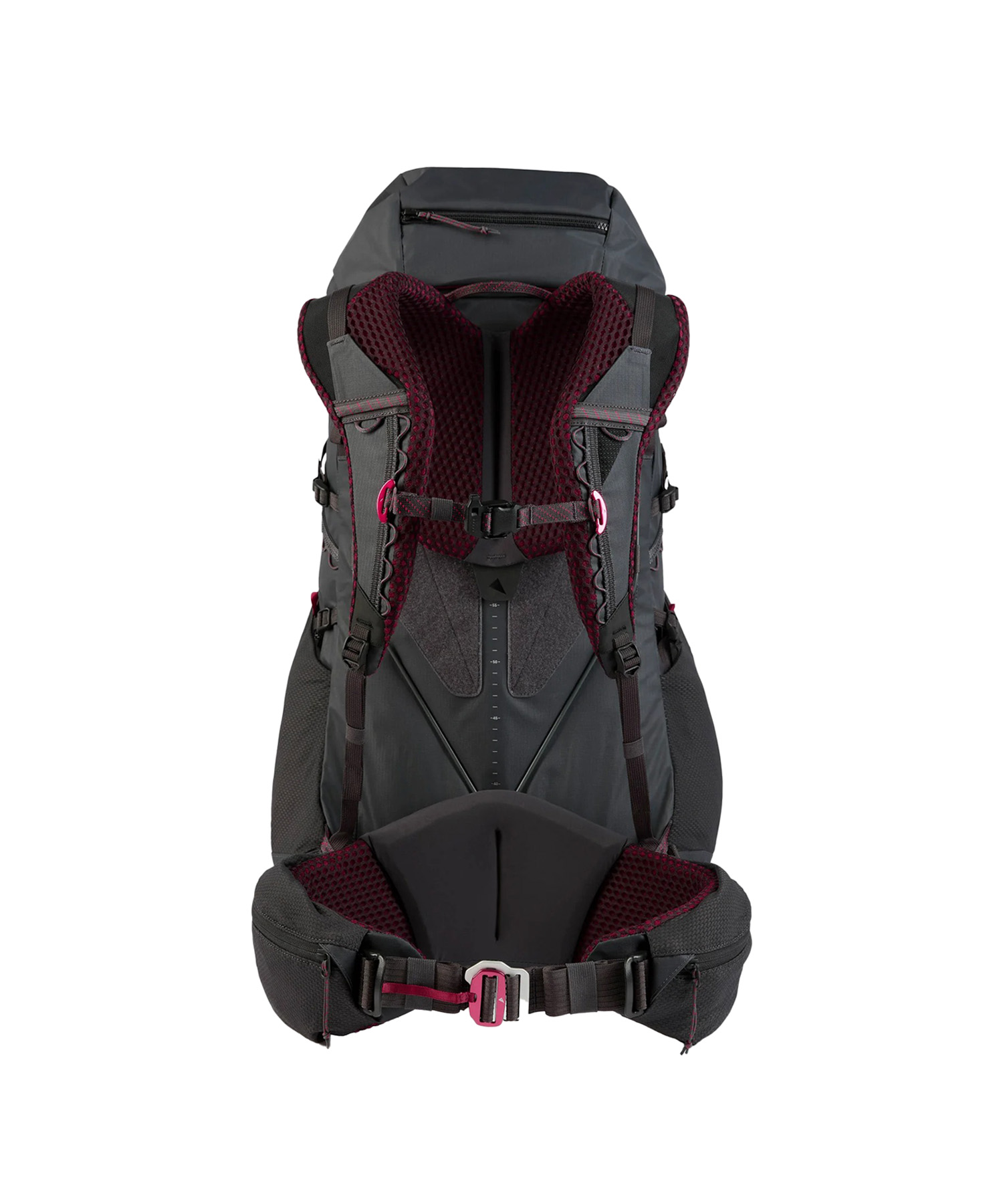 山小屋泊やテント泊に対応する、軽量トレッキングバックパック。従来のアウターフレーム構造を踏襲しながら軽量化を実現し、通気性に優れた背面パネルと柔軟なフレームが身体の動きに自然に追従、長時間でも快適な背負い心地を提供します。
