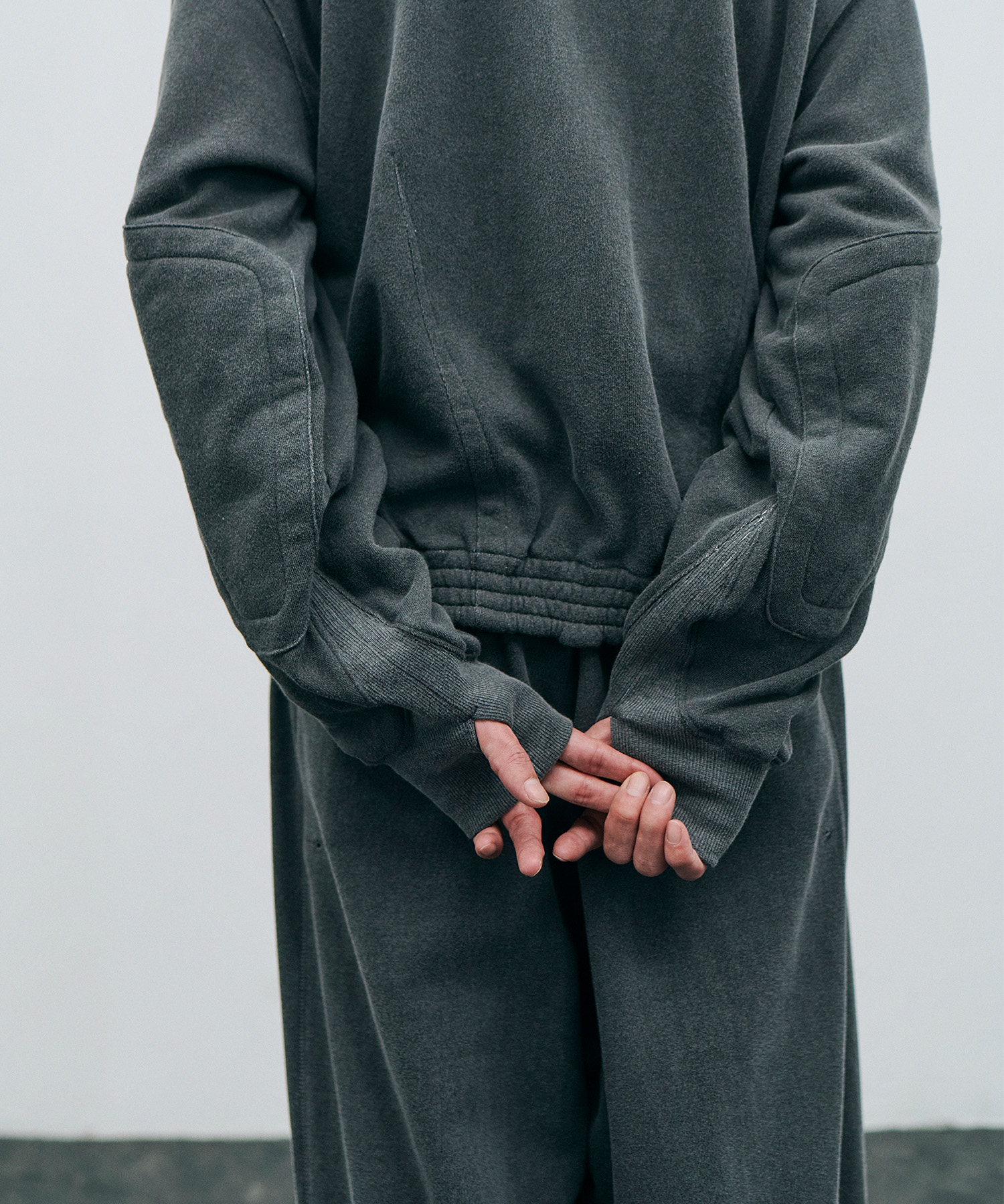 顔料染料で加工した30/10裏毛。顔料染料を用いて加工された素材で、耐久性と風合いの変化を重視しています。洗濯を重ねるごとに経年変化が生まれ、独自の風合いと味わいが増していきます。