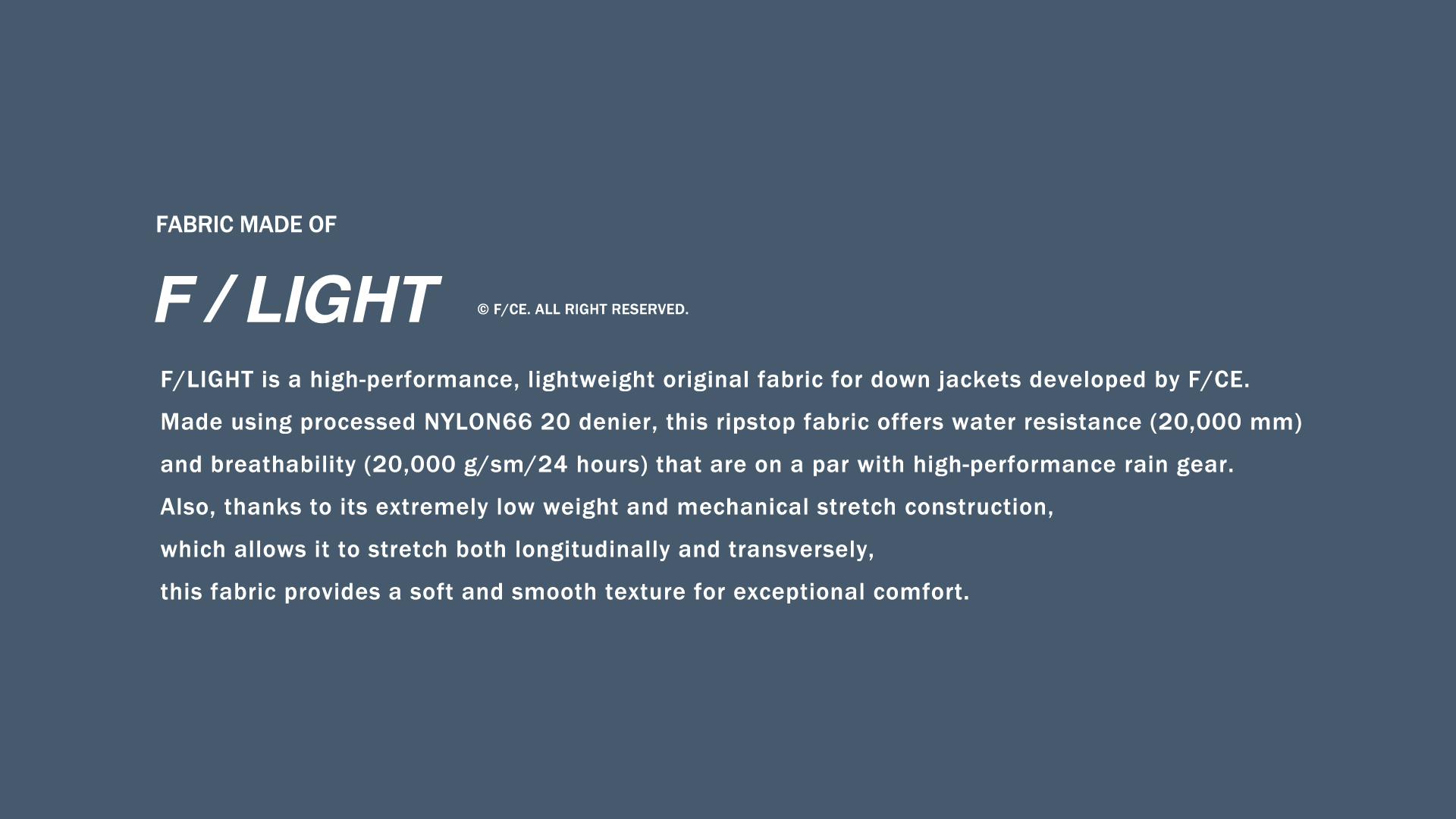 F/CE.’s original FLIGHT fabric developed for down jackets.