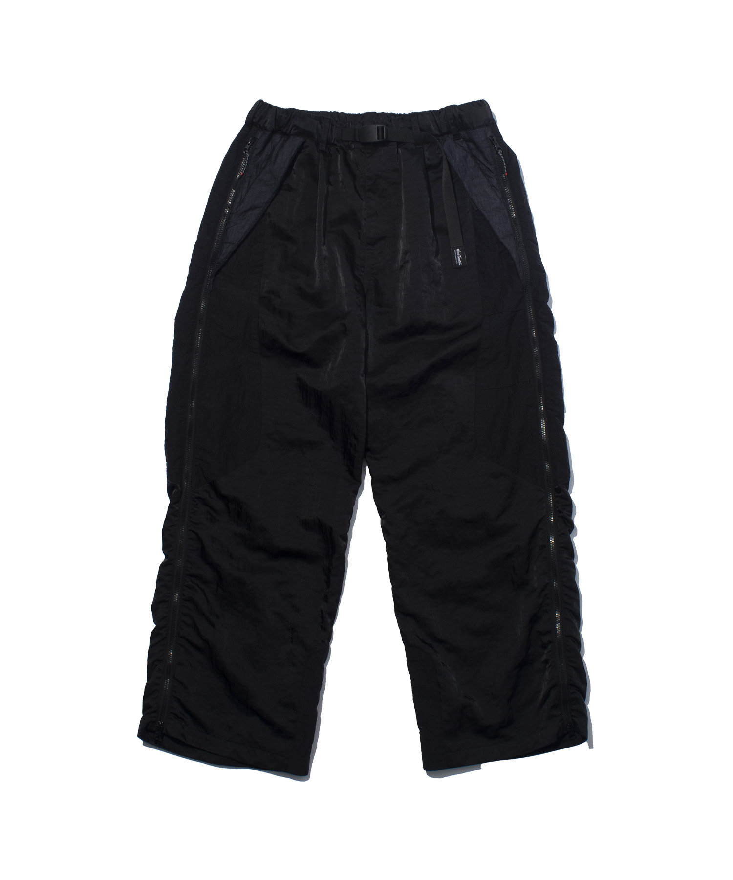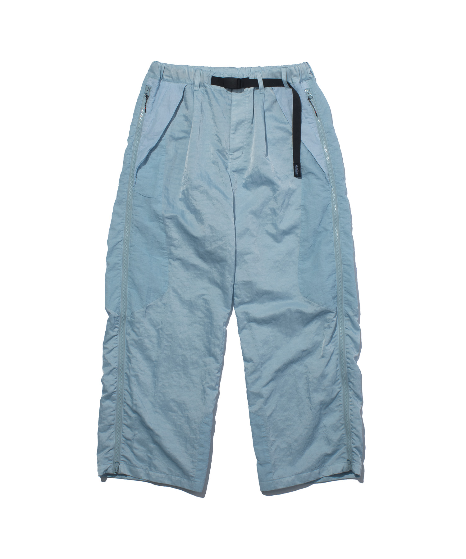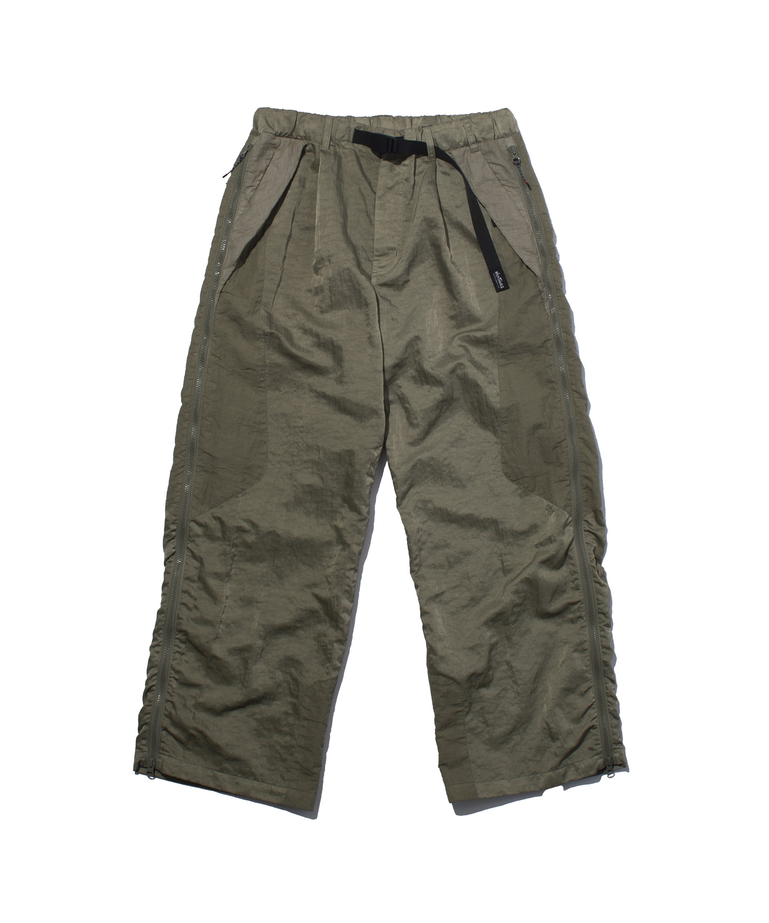 The elongated vertical zips on both sides are inspired by ECWCS pants, allowing the silhouette to be adjusted freely through opening and closing. A naturally textured, lightly wrinkled finish adds character and depth to the overall look.